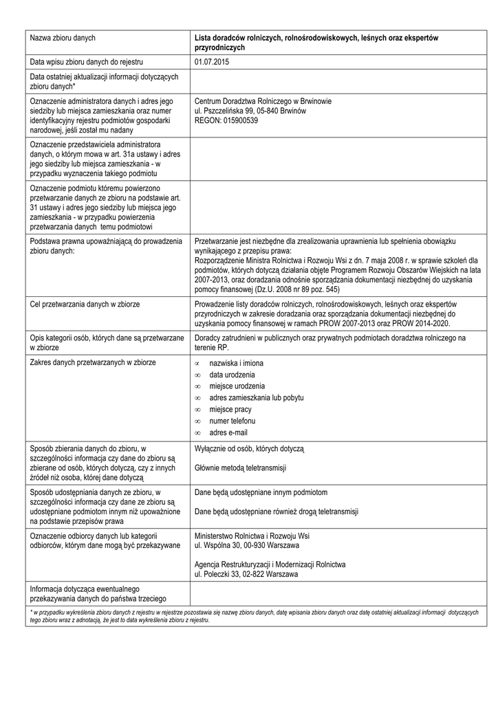 Nazwa zbioru danych Lista doradców rolniczych, rolnośrodowiskowych, leśnych oraz ekspertów przyrodniczych Data wpisu zbioru danych do rejestru 01.07.2015 Data ostatniej aktualizacji informacji dotyczących zbioru danych* Oznaczenie administratora danych i adres jego siedziby lub miejsca zamieszkania oraz numer identyfikacyjny rejestru podmiotów gospodarki narodowej, jeśli został mu nadany Centrum Doradztwa Rolniczego w Brwinowie ul. Pszczelińska 99, 05-840 Brwinów REGON: 015900539 Oznaczenie przedstawiciela administratora danych, o którym mowa w art. 31a ustawy i adres jego siedziby lub miejsca zamieszkania - w przypadku wyznaczenia takiego podmiotu Oznaczenie podmiotu któremu powierzono przetwarzanie danych ze zbioru na podstawie art. 31 ustawy i adres jego siedziby lub miejsca jego zamieszkania - w przypadku powierzenia przetwarzania danych temu podmiotowi Podstawa prawna upoważniającą do prowadzenia zbioru danych: Przetwarzanie jest niezbędne dla zrealizowania uprawnienia lub spełnienia obowiązku wynikającego z przepisu prawa: Rozporządzenie Ministra Rolnictwa i Rozwoju Wsi z dn. 7 maja 2008 r. w sprawie szkoleń dla podmiotów, których dotyczą działania objęte Programem Rozwoju Obszarów Wiejskich na lata 2007-2013, oraz doradzania odnośnie sporządzania dokumentacji niezbędnej do uzyskania pomocy finansowej (Dz.U. 2008 nr 89 poz. 545) Cel przetwarzania danych w zbiorze Prowadzenie listy doradców rolniczych, rolnośrodowiskowych, leśnych oraz ekspertów przyrodniczych w zakresie doradzania oraz sporządzania dokumentacji niezbędnej do uzyskania pomocy finansowej w ramach PROW 2007-2013 oraz PROW 2014-2020. Opis kategorii osób, których dane są przetwarzane w zbiorze Doradcy zatrudnieni w publicznych oraz prywatnych podmiotach doradztwa rolniczego na terenie RP. Zakres danych przetwarzanych w zbiorze • • • • • • • Sposób zbierania danych do zbioru, w szczególności informacja czy dane do zbioru są zbierane od osób, których dotyczą, czy z innych źródeł niż osoba, której dane dotyczą Wyłącznie od osób, których dotyczą Sposób udostępniania danych ze zbioru, w szczególności informacja czy dane ze zbioru są udostępniane podmiotom innym niż upoważnione na podstawie przepisów prawa Dane będą udostępniane innym podmiotom Oznaczenie odbiorcy danych lub kategorii odbiorców, którym dane mogą być przekazywane Ministerstwo Rolnictwa i Rozwoju Wsi ul. Wspólna 30, 00-930 Warszawa nazwiska i imiona data urodzenia miejsce urodzenia adres zamieszkania lub pobytu miejsce pracy numer telefonu adres e-mail Głównie metodą teletransmisji Dane będą udostępniane również drogą teletransmisji Agencja Restrukturyzacji i Modernizacji Rolnictwa ul. Poleczki 33, 02-822 Warszawa Informacja dotycząca ewentualnego przekazywania danych do państwa trzeciego * w przypadku wykreślenia zbioru danych z rejestru w rejestrze pozostawia się nazwę zbioru danych, datę wpisania zbioru danych oraz datę ostatniej aktualizacji informacji dotyczących tego zbioru wraz z adnotacją, że jest to data wykreślenia zbioru z rejestru.