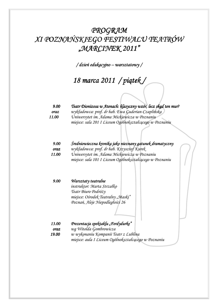 PROGRAM XI POZNAŃSKIEGO FESTIWALU TEATRÓW „MARCINEK 2011” 2011” / dzień edukacyjno – warsztatowy / 18 marca 2011 / piątek / 9.00 oraz 11.00 9.00 oraz 11. 11.00 9.00 13.00 oraz 19.00 Teatr Dionizosa w Atenach: klasyczny wzór, lecz skąd ten mur? wykładowca: prof. dr hab. Ewa Guderian-Czaplińska Uniwersytet im. Adama Mickiewicza w Poznaniu miejsce: sala 201 I Liceum Ogólnokształcącego w Poznaniu Średniowieczna kronika jako nieznany gatunek dramatyczny wykładowca: prof. dr hab. Krzysztof Kurek Uniwersytet im. Adama Mickiewicza w Poznaniu miejsce: sala 101 I Liceum Ogólnokształcącego w Poznaniu Warsztaty teatralne instruktor: Marta Strzałko Teatr Biuro PodróŜy miejsce: Ośrodek Teatralny „Maski” Poznań, Aleje Niepodległości 26 Prezentacja spektaklu „Ferdydurke” wg Witolda Gombrowicza w wykonaniu Kompanii Teatr z Lublina miejsce: aula I Liceum Ogólnokształcącego w Poznaniu
