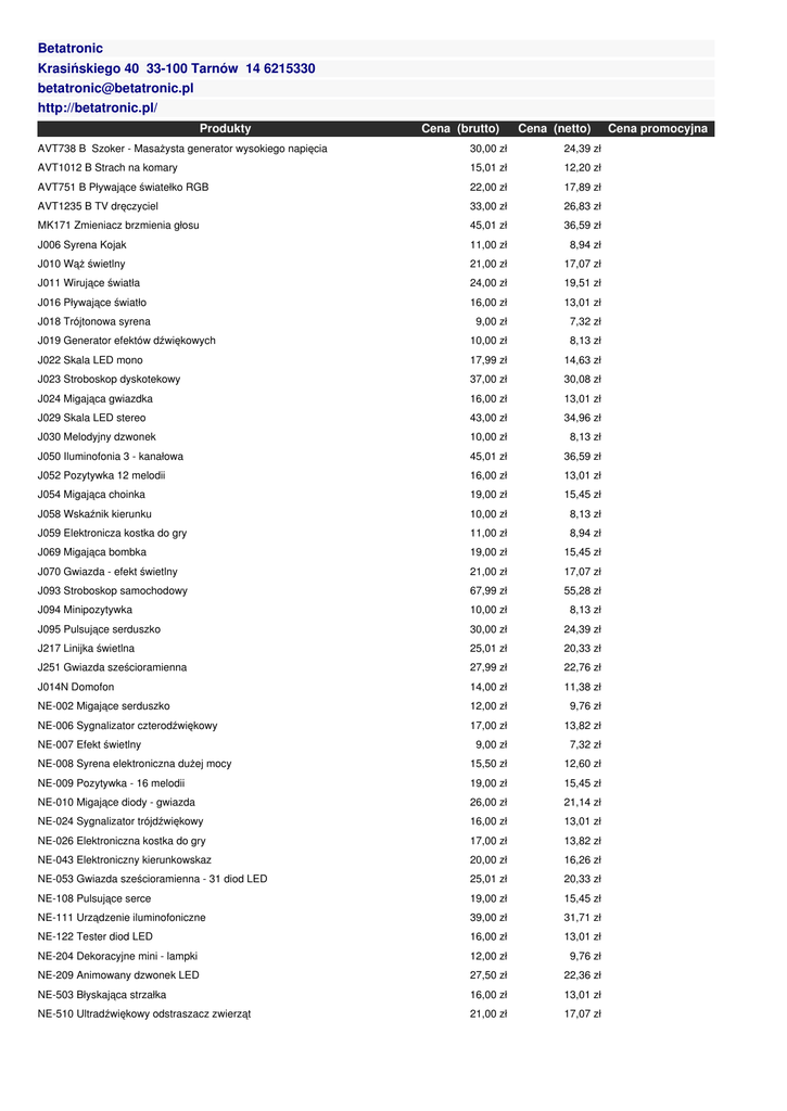 Betatronic Krasińskiego 40 33-100 Tarnów 14 6215330 [email protected] http://betatronic.pl/ Produkty Cena (brutto) Cena (netto) AVT738 B Szoker - Masażysta generator wysokiego napięcia 30,00 zł 24,39 zł AVT1012 B Strach na komary 15,01 zł 12,20 zł AVT751 B Pływające światełko RGB 22,00 zł 17,89 zł AVT1235 B TV dręczyciel 33,00 zł 26,83 zł MK171 Zmieniacz brzmienia głosu 45,01 zł 36,59 zł J006 Syrena Kojak 11,00 zł 8,94 zł J010 Wąż świetlny 21,00 zł 17,07 zł J011 Wirujące światła 24,00 zł 19,51 zł J016 Pływające światło 16,00 zł 13,01 zł J018 Trójtonowa syrena 9,00 zł 7,32 zł J019 Generator efektów dźwiękowych 10,00 zł 8,13 zł J022 Skala LED mono 17,99 zł 14,63 zł J023 Stroboskop dyskotekowy 37,00 zł 30,08 zł J024 Migająca gwiazdka 16,00 zł 13,01 zł J029 Skala LED stereo 43,00 zł 34,96 zł J030 Melodyjny dzwonek 10,00 zł 8,13 zł J050 Iluminofonia 3 - kanałowa 45,01 zł 36,59 zł J052 Pozytywka 12 melodii 16,00 zł 13,01 zł J054 Migająca choinka 19,00 zł 15,45 zł J058 Wskaźnik kierunku 10,00 zł 8,13 zł J059 Elektronicza kostka do gry 11,00 zł 8,94 zł J069 Migająca bombka 19,00 zł 15,45 zł J070 Gwiazda - efekt świetlny 21,00 zł 17,07 zł J093 Stroboskop samochodowy 67,99 zł 55,28 zł J094 Minipozytywka 10,00 zł 8,13 zł J095 Pulsujące serduszko 30,00 zł 24,39 zł J217 Linijka świetlna 25,01 zł 20,33 zł J251 Gwiazda sześcioramienna 27,99 zł 22,76 zł J014N Domofon 14,00 zł 11,38 zł NE-002 Migające serduszko 12,00 zł 9,76 zł NE-006 Sygnalizator czterodźwiękowy 17,00 zł 13,82 zł 9,00 zł 7,32 zł NE-008 Syrena elektroniczna dużej mocy 15,50 zł 12,60 zł NE-009 Pozytywka - 16 melodii 19,00 zł 15,45 zł NE-010 Migające diody - gwiazda 26,00 zł 21,14 zł NE-024 Sygnalizator trójdźwiękowy 16,00 zł 13,01 zł NE-026 Elektroniczna kostka do gry 17,00 zł 13,82 zł NE-043 Elektroniczny kierunkowskaz 20,00 zł 16,26 zł NE-053 Gwiazda sześcioramienna - 31 diod LED 25,01 zł 20,33 zł NE-108 Pulsujące serce 19,00 zł 15,45 zł NE-111 Urządzenie iluminofoniczne 39,00 zł 31,71 zł NE-122 Tester diod LED 16,00 zł 13,01 zł NE-204 Dekoracyjne mini - lampki 12,00 zł 9,76 zł NE-209 Animowany dzwonek LED 27,50 zł 22,36 zł NE-503 Błyskająca strzałka 16,00 zł 13,01 zł NE-510 Ultradźwiękowy odstraszacz zwierząt 21,00 zł 17,07 zł NE-007 Efekt świetlny Cena promocyjna NE-520 Detektor deszczu 16,00 zł 13,01 zł NE-533 Migający dwukolorowy kwiatek LED 16,00 zł 13,01 zł 9,00 zł 7,32 zł NE-511 Przekaźnik akustyczno - optyczny (dźwięk > światło) 16,49 zł 13,41 zł K-059 Mikroprocesorowy zamek szyfrowy 52,00 zł 42,28 zł K-142 Tani immobilizer samochodowy 37,99 zł 30,89 zł K-146 Mostkowy gigant 1000W 22,00 zł 17,89 zł K-342 Czterokanałowe efekty dyskotekowe 40,00 zł 32,52 zł K-385 LOGGER - szpieg klawiatury 42,00 zł 34,15 zł K-701 Profesjonalny licznik impulsów 66,00 zł 53,66 zł NE-004 Sygnalizator akustyczny