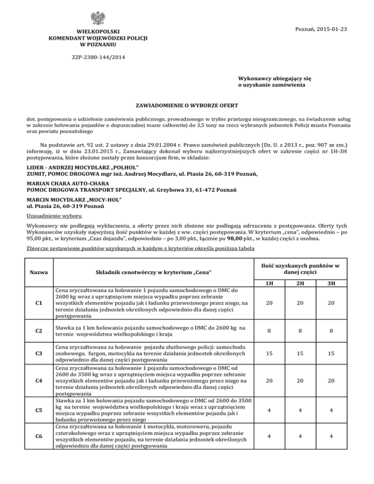 Poznań, 2015-01-23 WIELKOPOLSKI KOMENDANT WOJEWÓDZKI POLICJI W POZNANIU ZZP-2380-144/2014 Wykonawcy ubiegający się o uzyskanie zamówienia ZAWIADOMIENIE O WYBORZE OFERT dot. postępowania o udzielenie zamówienia publicznego, prowadzonego w trybie przetargu nieograniczonego, na świadczenie usług w zakresie holowania pojazdów o dopuszczalnej masie całkowitej do 3,5 tony na rzecz wybranych jednostek Policji miasta Poznania oraz powiatu poznańskiego Na podstawie art. 92 ust. 2 ustawy z dnia 29.01.2004 r. Prawo zamówień publicznych (Dz. U. z 2013 r., poz. 907 ze zm.) informuję, iż w dniu 23.01.2015 r., Zamawiający dokonał wyboru najkorzystniejszych ofert w zakresie części nr 1H-3H postępowania, które złożone zostały przez konsorcjum firm, w składzie: LIDER - ANDRZEJ MOCYDLARZ „POLHOL” ZUMIT, POMOC DROGOWA mgr inż. Andrzej Mocydlarz, ul. Ptasia 26, 60-319 Poznań, MARIAN CHARA AUTO-CHARA POMOC DROGOWA TRANSPORT SPECJALNY, ul. Grzybowa 31, 61-472 Poznań MARCIN MOCYDLARZ „MOCY-HOL” ul. Ptasia 26, 60-319 Poznań Uzasadnienie wyboru Wykonawcy nie podlegają wykluczeniu, a oferty przez nich złożone nie podlegają odrzuceniu z postępowania. Oferty tych Wykonawców uzyskały najwyższą ilość punktów w każdej z ww. części postępowania. W kryterium „cena”, odpowiednio – po 95,00 pkt., w kryterium „Czas dojazdu”, odpowiednio – po 3,00 pkt., łącznie po 98,00 pkt., w każdej części z osobna. Zbiorcze zestawienie punktów uzyskanych w każdym z kryteriów określa poniższa tabela Nazwa Składnik cenotwórczy w kryterium „Cena” Ilość uzyskanych punktów w danej części 1H 2H 3H C1 Cena zryczałtowana za holowanie 1 pojazdu samochodowego o DMC do 2600 kg wraz z uprzątnięciem miejsca wypadku poprzez zebranie wszystkich elementów pojazdu jak i ładunku przewożonego przez niego, na terenie działania jednostek określonych odpowiednio dla danej części postępowania 20 20 20 C2 Stawka za 1 km holowania pojazdu samochodowego o DMC do 2600 kg na terenie województwa wielkopolskiego i kraju 8 8 8 15 15 15 20 20 20 4 4 4 4 4 4 C3 C4 C5 C6 Cena zryczałtowana za holowanie pojazdu służbowego policji: samochodu osobowego, furgon, motocykla na terenie działania jednostek określonych odpowiednio dla danej części postępowania Cena zryczałtowana za holowanie 1 pojazdu samochodowego o DMC od 2600 do 3500 kg wraz z uprzątnięciem miejsca wypadku poprzez zebranie wszystkich elementów pojazdu jak i ładunku przewożonego przez niego na terenie działania jednostek określonych odpowiednio dla danej części postępowania Stawka za 1 km holowania pojazdu samochodowego o DMC od 2600 do 3500 kg na terenie województwa wielkopolskiego i kraju wraz z uprzątnięciem miejsca wypadku poprzez zebranie wszystkich elementów pojazdu jak i ładunku przewożonego przez niego Cena zryczałtowana za holowanie 1 motocykla, motoroweru, pojazdu czterokołowego wraz z uprzątnięciem miejsca wypadku poprzez zebranie wszystkich elementów pojazdu, na terenie działania jednostek określonych odpowiednio dla danej części postępowania C7 C8 C9 Stawka za 1 km holowania 1 motocykla, motoroweru, pojazdu czterokołowego na terenie województwa wielkopolskiego i kraju wraz z uprzątnięciem miejsca wypadku poprzez zebranie wszystkich elementów 4 4 4 10 10 10 10 10 10 Kryterium „czas dojazdu” 3 3 3 Suma punktów: 98 98 98 Cena zryczałtowana za przewóz części i innych przedmiotów na 4 m2 skrzyni ładownej, przestrzeni bagażowej, np. samochodem marki Fiat Ducato wraz z załadunkiem i wyładunkiem w miejscu wskazanym na terenie działania jednostek określonych odpowiednio dla danej części postępowania Cena zryczałtowana za przewóz części i innych przedmiotów na 12 m2 skrzyni ładownej przestrzeni bagażowej, np. samochodem marki Star skrzyniowy wraz z załadunkiem i wyładunkiem w miejscu wskazanym na terenie działania jednostek określonych odpowiednio dla danej części postępowania Wyk. w 1 egz., opublikowano na stronie internetowej oraz tablicy ogłoszeń Zamawiającego.