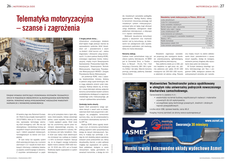26 | MOTORYZACJA DZIŚ MOTORYZACJA DZIŚ | Telematyka motoryzacyjna – szanse i zagrożenia W kwietniu tego roku Parlament Europejski i Rada Europy przyjęły rozporządzenie 2015/758/EU, które po 31 marca 2018 roku wprowadza technologię alarmową eCall (emergency call). Ma ona być obowiązkową i standardową funkcją we wszystkich nowych samochodach osobowych i lekkich pojazdach dostawczych, homologowanych na terenie Unii Europejskiej. W razie kolizji lub wypadku system eCall automatycznie łączy się z numerem alarmowym 112 i wysyła do służb ratunkowych informację o dokładnej lokalizacji pojazdu uczestniczącego w zdarzeniu. Z czujników zainstalowanych w pojeźAutonaprawa | Październik 2015 dzie są też przesyłane dane o typie aktywacji, klasie pojazdu, rodzaju używanego paliwa, czasie wypadku, kierunku jazdy i liczbie zapiętych pasów. ECall może być też uruchomiony ręcznie przez naciśnięcie odpowiedniego przycisku, na przykład aby powiadomić o sytuacji, której kierowca jest tylko świadkiem. Dzięki eCall czas reakcji służb ratowniczych ma zmniejszyć się o połowę za miastem i o 40% na terenach miejskich. Szacuje się, że na drogach naszego kontynentu będzie można uratować 2500 osób rocznie. W 2018 roku 45% aut w Europie Środkowej będzie wyposażone w system telematyczny. Z drugiej jednak strony… Infrastruktura umożliwiająca działanie eCall będzie mogła posłużyć również do wprowadzenia systemów bCall (break down call – powiadamianie o awarii na drodze) i sCall (service call – zdalna diagnostyka i oferowanie usług serwisowych). I tu alarm podnosi Koalicja R2RC, zrzeszająca organizacje branży motoryzacyjnej, między innymi Stowarzyszenie Dystrybutorów i Producentów Części Motoryzacyjnych, Stowarzyszenie Techniki Motoryzacyjnej, Organizację Pracodawców Motoryzacyjnych MOVEO i Związek Pracodawców Branży Motoryzacyjnej. Jak przekonuje R2RC, wraz z poprawą bezpieczeństwa kierowcy dostaną w pakiecie usługi czysto komercyjne, które mogą radykalnie zmienić rynek motoryzacyjny. Koalicja obawia się, że korzyści z nowej telematyki odniosą wyłącznie koncerny samochodowe kosztem zarówno przedsiębiorstw działających w segmencie niezależnego rynku motoryzacyjnego, jak i samych użytkowników samochodów. Zamknięty kontra otwarty System bCall powiadamia swego operatora danych o awarii auta na drodze, natomiast sCall może przypomnieć o zbliżającym się przeglądzie, konieczności wymiany oleju, czy też przeprowadzeniu w warsztacie obowiazkowej wymiany filtra DPF itp. Koalicja R2RC zbiera sygnały świadczące o tym, że koncerny samochodowe próbują zapewnić sobie uprzywilejowany dostęp do danych telematycznych. Systemy te miałyby być zamknięte, a dostęp do nich dostaliby jedynie operatorzy wskazani przez producentów aut, którzy decydowaliby również, w jakie aplikacje mogłyby być wyposażone ich systemy. Dane pokładowe, dostępne w czasie rzeczywistym, byłyby gromadzone na serwerach koncernów, a dostęp do nich Koncerny atakują Czołowe marki samochodowe mają już własne systemy telematyczne. W BMW jest to Connected Drive, w Fordzie – Sync, w Renault – R-Link, Fiat i Ford korzystają z Connecta, GM i VW z systemu OnStar i tak dalej. Obecnie koncerny promują zamkniętą platformę Extended Vehicle (ExVe). Niezależny rynek motoryzacyjny w Polsce, 2014 rok Liczba zatrudnionych Liczba firm motoryzacyjnych Liczba warsztatów niezależnych Wartość eksportu części i akcesoriów Wartość rynku części i napraw Liczba certyfikowanych SKP Liczba kierowców aut osobowych... ... w tym korzystających z warsztatów niezależnych Wpływy z VAT-u Podatki dochodowe Odprowadzane składki ZUS Liczba serwisów autoryzowanych 330 tys. 27 tys. 20 tys. 33 mld zł 31 mld zł 4400 16 mln 14,4 mln 5,5 mld zł 1,9 mld zł 5,2 mld zł 1,5 tys. Źródło: Koalicja R2RC Niezależne organizacje warsztatowe proponują jako rozwiązanie docelowe ustandaryzowaną, ogólnodostępną, otwartą platformę telematyczną. Taka platforma działa już w USA: jest ona bezpłatna na ogół przez rok, później pobierana jest opłata 20-30 USD miesięcznie lub 200-300 USD rocznie, w zależności od zakresu usług. Pozwala ona między innymi na zdalne odblokowanie drzwi, powiadomienie o zauważonym wypadku, dostęp do nawigacji, wezwanie pomocy drogowej albo wyszukanie stacji paliw lub restauracji. W Europie dostawcą otwartego systemu telematycznego jest Texa z programem CARe, dostępnym zarówno dla autoryzowanych serwisów, jak i warszta- Wydawnictwo Technotransfer poleca opublikowany w ubiegłym roku uniwersalny podręcznik nowoczesnego blacharstwa samochodowego. Opracowanie to zawiera m.in.: • wiadomości na temat budowy współczesnych nadwozi i materiałów używanych do ich wykonywania; • szczegółowe opisy technologii poważnych, średnich i drobnych napraw powypadkowych. Liczba stron 208, oprawa twarda, cena 48 zł Książkę można zamówić ze strony www.e-autonaprawa.pl Fot. archiwum Unijne wymogi dotyczące stosowania systemów telematycznych w pojazdach drogowych są rozwiązaniem kontrowersyjnym, ponieważ mogą wyeliminować niezależne warsztaty naprawcze z rynkowej konkurencji. dla niezależnych warsztatów podlegałby ograniczeniom. Według Koalicji dałoby to koncernom nieuczciwą przewagę nad niezależnym rynkiem motoryzacyjnym, ponieważ tylko oni będą mogli oferować usługi dodatkowe, obsługiwane dzięki platformom telematycznym, a dotyczące m.in. napraw i serwisowania. Możliwość dwustronnej komunikacji pojazdu z otoczeniem oraz możliwość kontroli nad tą komunikacją, jej blokowanie lub udostępnianie tylko wyselekcjonowanym podmiotom, jest rewolucją, której nie można lekceważyć. 27 Autonaprawa | Październik 2015