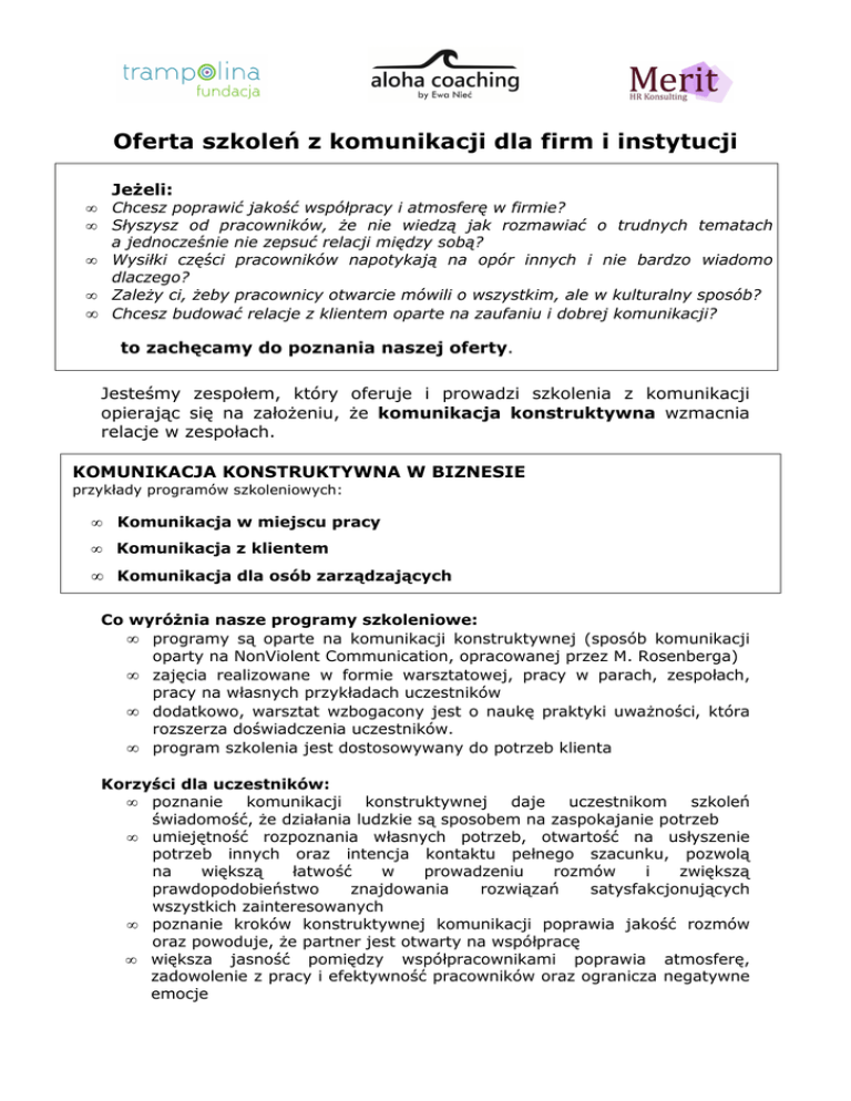 Oferta szkoleń z komunikacji dla firm i instytucji • • • • • Jeżeli: Chcesz poprawić jakość współpracy i atmosferę w firmie? Słyszysz od pracowników, że nie wiedzą jak rozmawiać o trudnych tematach a jednocześnie nie zepsuć relacji między sobą? Wysiłki części pracowników napotykają na opór innych i nie bardzo wiadomo dlaczego? Zależy ci, żeby pracownicy otwarcie mówili o wszystkim, ale w kulturalny sposób? Chcesz budować relacje z klientem oparte na zaufaniu i dobrej komunikacji? to zachęcamy do poznania naszej oferty. Jesteśmy zespołem, który oferuje i prowadzi szkolenia z komunikacji opierając się na założeniu, że komunikacja konstruktywna wzmacnia relacje w zespołach. KOMUNIKACJA KONSTRUKTYWNA W BIZNESIE przykłady programów szkoleniowych: • Komunikacja w miejscu pracy • Komunikacja z klientem • Komunikacja dla osób zarządzających Co wyróżnia nasze programy szkoleniowe: • programy są oparte na komunikacji konstruktywnej (sposób komunikacji oparty na NonViolent Communication, opracowanej przez M. Rosenberga) • zajęcia realizowane w formie warsztatowej, pracy w parach, zespołach, pracy na własnych przykładach uczestników • dodatkowo, warsztat wzbogacony jest o naukę praktyki uważności, która rozszerza doświadczenia uczestników. • program szkolenia jest dostosowywany do potrzeb klienta Korzyści dla uczestników: • poznanie komunikacji konstruktywnej daje uczestnikom szkoleń świadomość, że działania ludzkie są sposobem na zaspokajanie potrzeb • umiejętność rozpoznania własnych potrzeb, otwartość na usłyszenie potrzeb innych oraz intencja kontaktu pełnego szacunku, pozwolą na większą łatwość w prowadzeniu rozmów i zwiększą prawdopodobieństwo znajdowania rozwiązań satysfakcjonujących wszystkich zainteresowanych • poznanie kroków konstruktywnej komunikacji poprawia jakość rozmów oraz powoduje, że partner jest otwarty na współpracę • większa jasność pomiędzy współpracownikami poprawia atmosferę, zadowolenie z pracy i efektywność pracowników oraz ogranicza negatywne emocje Opis programu szkoleniowego: Komunikacja w miejscu pracy Dla kogo: przeznaczony dla zespołów, osób współpracujących ze sobą z różnych działów, zespołów projektowych Cel: podniesienie jakości i skuteczności komunikacji wewnątrz firmy Korzyści dla uczestników: • umiejętność przygotowania do trudnej rozmowy i podejścia do dialogu z szacunkiem i nastawieniem na kontakt • wiedza, w jaki sposób uzyskiwać jasność swoich potrzeb, znajdować najlepsze strategie ich zaspokojenia • uświadomienie, że odmowa nie zamyka komunikacji, ale jest szansą na jej pogłębienie • rozpoznanie sposobów konstruktywnej reakcji na krytykę, plotki, niedotrzymywanie ustaleń • wiedza, jak jasno określać zasady, dokonywać ustaleń, które będą uznawane i dotrzymywane • poznanie zasad, które ułatwią rozwiązanie konfliktowych tematów oraz uzyskanie dobrej atmosfery wspierającej efektywność pracy Program: • aktywne słuchanie: rozpoznawanie potrzeb uświadamianie uczuć wywoływanych poprzez spełnione/niespełnione potrzeby • trudne rozmowy: identyfikacja trudnych tematów metoda przygotowania się do rozmowy • rozpoczynanie rozmowy/trudne sytuacje/efekty: sposób radzenia sobie z trudną reakcją rozmówcy (np. odmowa, płacz, agresja, opór) dochodzenie do rozwiązań odpowiadających potrzebom wszystkich zainteresowanych • empatia dla siebie i dla innych jako istotny warunek dobrych relacji: omówienie czynników które wpływają na dobry kontakt przećwiczenie wypowiedzi według 4 kroków konstruktywnej komunikacji indywidualne rozpoznanie schematów komunikacyjnych, które blokują kontakt oraz zaplanowanie działań eliminujących niepożądane nawyki poznanie technik wzmacniania uważności Metody szkoleniowe: Programy są oparte na komunikacji konstruktywnej (sposób komunikacji oparty na NonViolent Communication, M. Rosenberga). Zajęcia realizowane w formie warsztatowej, pracy w parach, zespołach, pracy na własnych przykładach uczestników. Kilkuminutowa praktyka uważności wzbogaca doświadczenia uczestników. Program szkolenia jest dostosowywany do potrzeb klienta. Czas trwania: minimum 8 godzin (1 dzień szkoleniowy). Grupa maksymalnie 16 osobowa. Kontakt: Anna Han tel. 660 827 313, mail: [email protected] Opis programu szkoleniowego: Komunikacja z klientem Dla kogo: przeznaczony dla osób kontaktujących się z klientem (wewnętrznym lub zewnętrznym, bezpośrednio lub poprzez środki komunikacji) Cel: doskonalenie jasności komunikacji oraz budowanie relacji pełnych zaufania i autentyczności, opartych na identyfikowaniu prawdziwych potrzeb klienta Korzyści dla uczestników: • przećwiczenie zachowania się w trudnych sytuacjach z klientem • poznanie strategii skutecznego zarządzania relacjami • zdobycie wiedzy o zasadach konstruktywnej komunikacji, których stosowanie zwiększa szansę na kontakt, szczególnie w trudnych sytuacjach • wsparcie w budowaniu i utrzymaniu długofalowych relacji z klientem Program: • strategie budowania i utrzymywania relacji z klientem • trudne rozmowy trudne sytuacje z klientem, reklamacje • pozyskiwanie nowych klientów • empatia dla samego siebie i autentyczność jako elementy sprzyjające budowaniu zaufania • jak budować wypowiedź, żeby być łatwo zrozumiałym jakości dobrej komunikacji przygotowanie do trudnej rozmowy • przećwiczenie wypowiedzi według 4 kroków konstruktywnej komunikacji • indywidualne rozpoznanie schematów komunikacyjnych, które blokują kontakt oraz zaplanowanie działań eliminujących niepożądane nawyki • poznanie technik wzmacniania uważności Metody szkoleniowe: Programy są oparte na komunikacji konstruktywnej (sposób komunikacji oparty na NonViolent Communication, M. Rosenberga). Zajęcia realizowane w formie warsztatowej, pracy w parach, zes