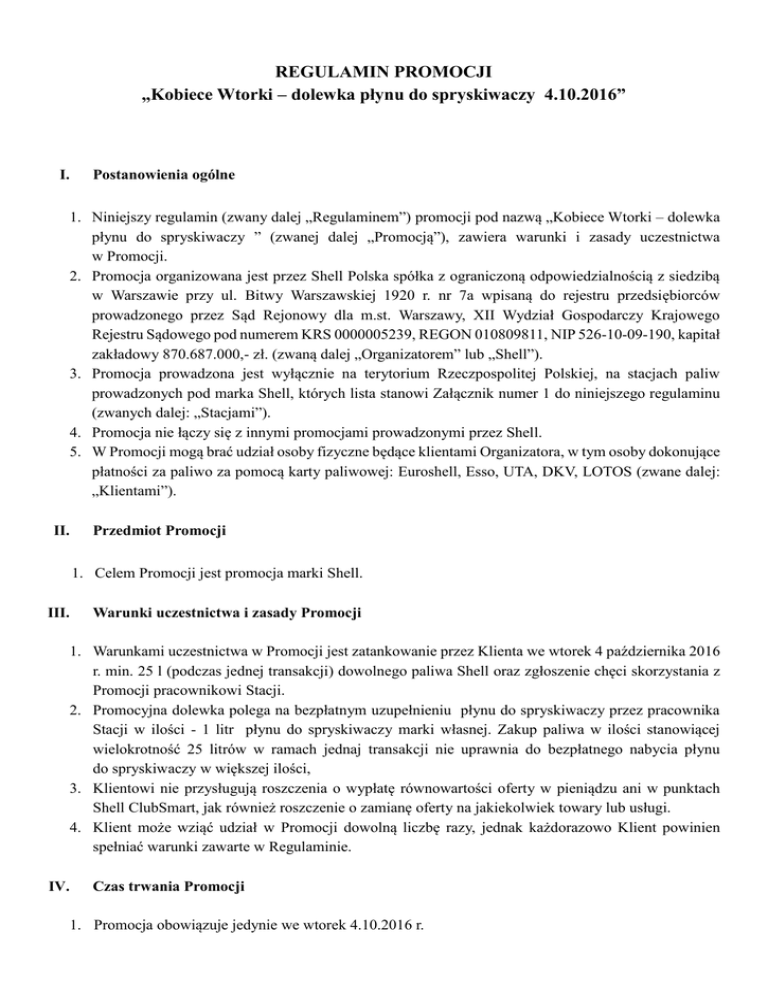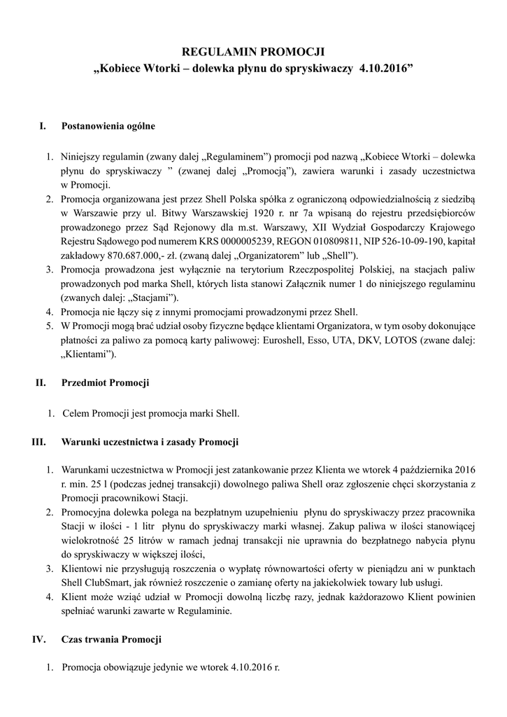 REGULAMIN PROMOCJI „Kobiece Wtorki – dolewka płynu do spryskiwaczy 4.10.2016” I. Postanowienia ogólne 1. Niniejszy regulamin (zwany dalej „Regulaminem”) promocji pod nazwą „Kobiece Wtorki – dolewka płynu do spryskiwaczy ” (zwanej dalej „Promocją”), zawiera warunki i zasady uczestnictwa w Promocji. 2. Promocja organizowana jest przez Shell Polska spółka z ograniczoną odpowiedzialnością z siedzibą w Warszawie przy ul. Bitwy Warszawskiej 1920 r. nr 7a wpisaną do rejestru przedsiębiorców prowadzonego przez Sąd Rejonowy dla m.st. Warszawy, XII Wydział Gospodarczy Krajowego Rejestru Sądowego pod numerem KRS 0000005239, REGON 010809811, NIP 526-10-09-190, kapitał zakładowy 870.687.000,- zł. (zwaną dalej „Organizatorem” lub „Shell”). 3. Promocja prowadzona jest wyłącznie na terytorium Rzeczpospolitej Polskiej, na stacjach paliw prowadzonych pod marka Shell, których lista stanowi Załącznik numer 1 do niniejszego regulaminu (zwanych dalej: „Stacjami”). 4. Promocja nie łączy się z innymi promocjami prowadzonymi przez Shell. 5. W Promocji mogą brać udział osoby fizyczne będące klientami Organizatora, w tym osoby dokonujące płatności za paliwo za pomocą karty paliwowej: Euroshell, Esso, UTA, DKV, LOTOS (zwane dalej: „Klientami”). II. Przedmiot Promocji 1. Celem Promocji jest promocja marki Shell. III. Warunki uczestnictwa i zasady Promocji 1. Warunkami uczestnictwa w Promocji jest zatankowanie przez Klienta we wtorek 4 października 2016 r. min. 25 l (podczas jednej transakcji) dowolnego paliwa Shell oraz zgłoszenie chęci skorzystania z Promocji pracownikowi Stacji. 2. Promocyjna dolewka polega na bezpłatnym uzupełnieniu płynu do spryskiwaczy przez pracownika Stacji w ilości - 1 litr płynu do spryskiwaczy marki własnej. Zakup paliwa w ilości stanowiącej wielokrotność 25 litrów w ramach jednaj transakcji nie uprawnia do bezpłatnego nabycia płynu do spryskiwaczy w większej ilości, 3. Klientowi nie przysługują roszczenia o wypłatę równowartości oferty w pieniądzu ani w punktach Shell ClubSmart, jak również roszczenie o zamianę oferty na jakiekolwiek towary lub usługi. 4. Klient może wziąć udział w Promocji dowolną liczbę razy, jednak każdorazowo Klient powinien spełniać warunki zawarte w Regulaminie. IV. Czas trwania Promocji 1. Promocja obowiązuje jedynie we wtorek 4.10.2016 r. V. Postępowanie reklamacyjne Wszelkie reklamacje związane z przebiegiem Promocji mogą być zgłaszane Organizatorowi na adres: Biuro Obsługi Klienta, Shell Polska Sp. z o.o., Oddział w Zabierzowie, ul. Krakowska 280, 32-080 Zabierzów z dopiskiem: ”Kobiece Wtorki – dolewka płynu do spryskiwaczy 4.10.2016 ” pod nr tel.: 800 080 014, infolinia czynna od poniedziałku do piątku od 8:00 do 17:00 albo za pośrednictwem poczty elektronicznej na adres e-mail: [email protected], wraz z opisem reklamacji. Organizator ustosunkuje się do reklamacji zgłoszonej przez Uczestnika Promocji nie później niż w ciągu 14 dni od dnia jej zgłoszenia Organizatorowi, zgodnie z ust. 1 powyżej. VI. Postanowienia końcowe 1. Przystępując do Promocji uczestnik wyraża zgodę na treść Regulaminu i zobowiązuje się przestrzegać jego postanowień. 2. Regulamin jest dostępny do wglądu w siedzibie Shell, na Stacjach oraz na stronie internetowej www.shell.pl 3. Postanowienia Regulaminu są podstawą prowadzenia Promocji, a ich interpretacja powinna być dokonywana zgodnie z powszechnie obowiązującymi przepisami prawa. 4. Wszelkie informacje o Promocji dostępne w materiałach reklamowych mają jedynie charakter informacyjny. 5. W zakresie nieuregulowanym w niniejszym regulaminie zastosowanie mają powszechnie obowiązujące przepisy prawa.