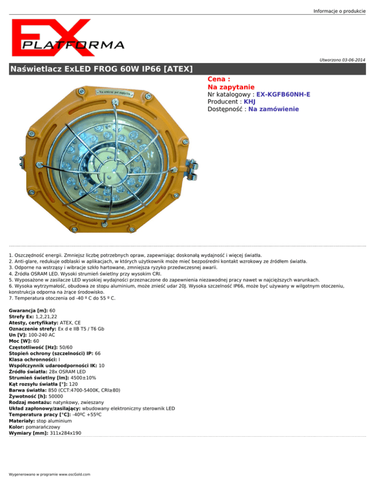 Informacje o produkcie Utworzono 03-06-2014 Naświetlacz ExLED FROG 60W IP66 [ATEX] Cena : Na zapytanie Nr katalogowy : EX-KGFB60NH-E Producent : KHJ Dostępność : Na zamówienie 1. Oszczędność energii. Zmniejsz liczbę potrzebnych opraw, zapewniając doskonałą wydajność i więcej światła. 2. Anti-glare, redukuje odblaski w aplikacjach, w których użytkownik może mieć bezpośredni kontakt wzrokowy ze źródłem światła. 3. Odporne na wstrząsy i wibracje szkło hartowane, zmniejsza ryzyko przedwczesnej awarii. 4. Źródła OSRAM LED. Wysoki strumień świetlny przy wysokim CRI. 5. Wyposażone w zasilacze LED wysokiej wydajności przeznaczone do zapewnienia niezawodnej pracy nawet w najcięższych warunkach. 6. Wysoka wytrzymałość, obudowa ze stopu aluminium, może znieść udar 20J. Wysoka szczelność IP66, może być używany w wilgotnym otoczeniu, konstrukcja odporna na żrące środowisko. 7. Temperatura otoczenia od -40 º C do 55 º C. Gwarancja [m]: 60 Strefy Ex: 1,2,21,22 Atesty, certyfikaty: ATEX, CE Oznaczenie strefy: Ex d e IIB T5 / T6 Gb Un [V]: 100-240 AC Moc [W]: 60 Częstotliwość [Hz]: 50/60 Stopień ochrony (szczelności) IP: 66 Klasa ochronności: I Współczynnik udaroodporności IK: 10 Źródło światła: 28x OSRAM LED Strumień świetlny [lm]: 4500±10% Kąt rozsyłu światła [°]: 120 Barwa światła: 850 (CCT:4700-5400K, CRI≥80) Żywotność [h]: 50000 Rodzaj montażu: natynkowy, zwieszany Układ zapłonowy/zasilający: wbudowany elektroniczny sterownik LED Temperatura pracy [°C]: -40ºC +55ºC Materiały: stop aluminium Kolor: pomarańczowy Wymiary [mm]: 311x284x190 Wygenerowano w programie www.oscGold.com