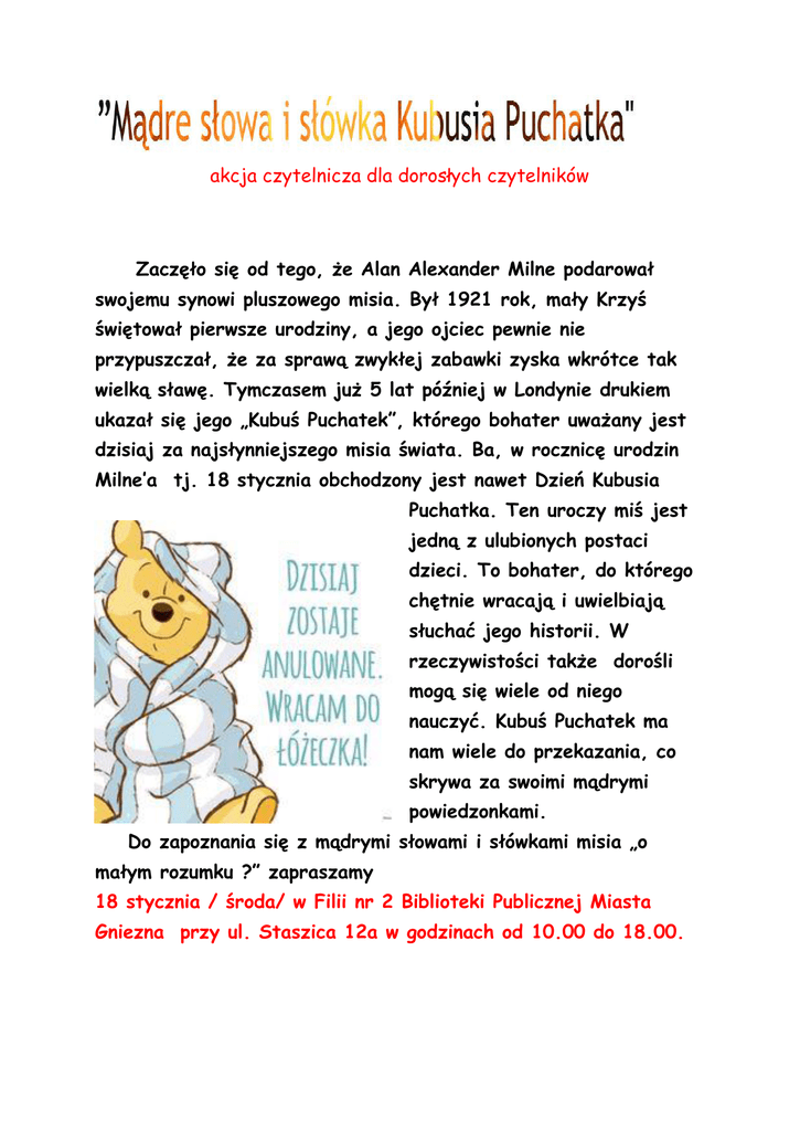 akcja czytelnicza dla dorosłych czytelników Zaczęło się od tego, że Alan Alexander Milne podarował swojemu synowi pluszowego misia. Był 1921 rok, mały Krzyś świętował pierwsze urodziny, a jego ojciec pewnie nie przypuszczał, że za sprawą zwykłej zabawki zyska wkrótce tak wielką sławę. Tymczasem już 5 lat później w Londynie drukiem ukazał się jego „Kubuś Puchatek”, którego bohater uważany jest dzisiaj za najsłynniejszego misia świata. Ba, w rocznicę urodzin Milne’a tj. 18 stycznia obchodzony jest nawet Dzień Kubusia Puchatka. Ten uroczy miś jest jedną z ulubionych postaci dzieci. To bohater, do którego chętnie wracają i uwielbiają słuchać jego historii. W rzeczywistości także dorośli mogą się wiele od niego nauczyć. Kubuś Puchatek ma nam wiele do przekazania, co skrywa za swoimi mądrymi powiedzonkami. Do zapoznania się z mądrymi słowami i słówkami misia „o małym rozumku ?” zapraszamy 18 stycznia / środa/ w Filii nr 2 Biblioteki Publicznej Miasta Gniezna przy ul. Staszica 12a w godzinach od 10.00 do 18.00.