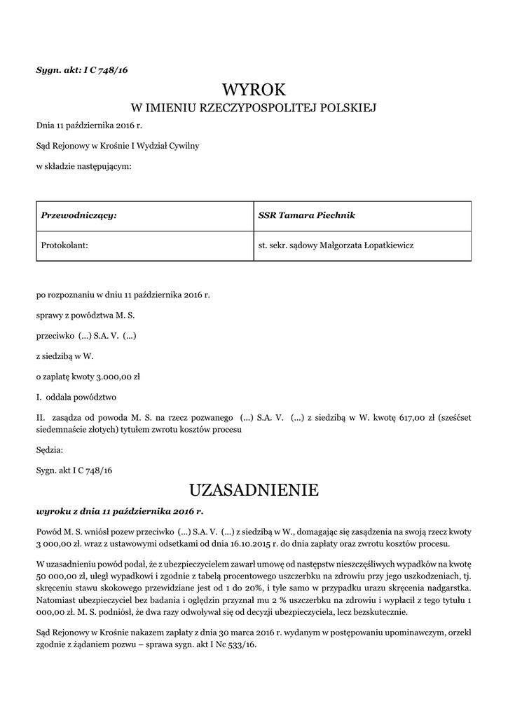 Sygn. akt: I C 748/16 WYROK W IMIENIU RZECZYPOSPOLITEJ POLSKIEJ Dnia 11 października 2016 r. Sąd Rejonowy w Krośnie I Wydział Cywilny w składzie następującym: Przewodniczący: SSR Tamara Piechnik Protokolant: st. sekr. sądowy Małgorzata Łopatkiewicz po rozpoznaniu w dniu 11 października 2016 r. sprawy z powództwa M. S. przeciwko (...) S.A. V. (...) z siedzibą w W. o zapłatę kwoty 3.000,00 zł I. oddala powództwo II. zasądza od powoda M. S. na rzecz pozwanego (...) S.A. V. (...) z siedzibą w W. kwotę 617,00 zł (sześćset siedemnaście złotych) tytułem zwrotu kosztów procesu Sędzia: Sygn. akt I C 748/16 UZASADNIENIE wyroku z dnia 11 października 2016 r. Powód M. S. wniósł pozew przeciwko (...) S.A. V. (...) z siedzibą w W., domagając się zasądzenia na swoją rzecz kwoty 3 000,00 zł. wraz z ustawowymi odsetkami od dnia 16.10.2015 r. do dnia zapłaty oraz zwrotu kosztów procesu. W uzasadnieniu powód podał, że z ubezpieczycielem zawarł umowę od następstw nieszczęśliwych wypadków na kwotę 50 000,00 zł, uległ wypadkowi i zgodnie z tabelą procentowego uszczerbku na zdrowiu przy jego uszkodzeniach, tj. skręceniu stawu skokowego przewidziane jest od 1 do 20%, i tyle samo w przypadku urazu skręcenia nadgarstka. Natomiast ubezpieczyciel bez badania i oględzin przyznał mu 2 % uszczerbku na zdrowiu i wypłacił z tego tytułu 1 000,00 zł. M. S. podniósł, że dwa razy odwoływał się od decyzji ubezpieczyciela, lecz bezskutecznie. Sąd Rejonowy w Krośnie nakazem zapłaty z dnia 30 marca 2016 r. wydanym w postępowaniu upominawczym, orzekł zgodnie z żądaniem pozwu – sprawa sygn. akt I Nc 533/16. Strona pozwana (...) S.A. V. (...) z siedzibą w W. w sprzeciwie od nakazu zapłaty, domagała się oddalenia powództwa w całości oraz zasądzenia od powoda na swoją rzecz kosztów postępowania, w tym kosztów zastępstwa procesowego wg norm przepisanych. W uzasadnieniu pozwany podał, że po przeprowadzeniu postępowania likwidacyjnego i zasięgnięciu opinii lekarza specjalisty ustalił, że powód doznał 2% uszczerbku na zdrowiu pozostającego w związku z wypadkiem z dnia 23.12.2014 r., w wyniku którego M. S. doznał skręcenia stawu skokowo – goleniowego oraz skręcenia nadgarstka. Lekarz orzecznik o specjalności: chirurgia ogólna, ortopedia i traumatologia ustalił uszczerbek na zdrowiu powoda w wysokości 2 % w związku ze skręceniem lewego stawu skokowo – goleniowego – pkt 163 a tabeli procentowego trwałego uszczerbku na zdrowiu. Zdaniem lekarza orzecznika skręcenie nadgarstka nie spowodowało powstania u M. S. trwałego uszczerbku na zdrowiu, stąd w tym zakresie powodowi odszkodowanie nie przysługuje. Na tej podstawie pozwany przyznał i wypłacił na rzecz powoda kwotę 1 000,00 zł. tytułem odszkodowania. Pokrzywdzony nie wykazał, aby na skutek zdarzenia z dnia 23.12.2014 r. doznał uszczerbku w rozmiarze większym niż ten, za który przyznano odszkodowanie. Bezpodstawne jest również żądanie przez powoda odsetek od dnia 16.10.2015 r., gdyż w toku postępowania likwidacyjnego ubezpieczyciel ustalił wysokość odszkodowania. Tym samym brak jest podstaw do przyjęcia, że pozwany pozostaje w opóźnieniu ze spełnieniem świadczenia, skoro ustalone odszkodowanie zostało wypłacone. Sąd ustalił, co następuje: W dniu 23 grudnia 2014 r. około godziny 06.30 w miejscowości J. powód M. S. idąc do swojego miejsca pracy przez parking, pośliznął się i upadając uderzył lewą dłonią w betonową powierzchnię. W wyniku tego zdarzenia doznał skręcenia stawu skokowego lewego, co wykazało wykonane prześwietlenie. Stwierdzono również u niego skręcenie nadgarstka lewego, wylanie torebki stawowej lewego stawu skokowego i naderwanie wiązadeł w kostce. Ręka poszkodowanego została usztywniona gipsem, a noga ortezą. W dniu 05 stycznia 2015 r. powód otrzymał z Poradni Lekarza Podstawowej (...) w K. skierowanie do tamtejszej Poradni Chirurgicznej, gdzie leczył się do dnia 01 czerwca 2015 r. Poszkodowany zawarł ze stroną pozwaną umowę ubezpieczenia, nr polisy (...), gdzie suma ubezpieczenia od następstw nieszczęśliwych wypadków została ustalona na kwotę 50 000,00 zł. Umowa obowiązywała od 30 lipca 2014 r. do 29 lipca 2015 r. §2 pkt 5 Ogólnych Warunków Ubezpieczenia Następstw Nieszczęśliwych Wypadków (dalej zwanych OWU), zawiera definicję nieszczęśliwego wypadku, określonego jako nagłe zdarzenie wywołane przyczyną zewnętrzną, w wyniku którego ubezpieczony niezależnie od swojej woli doznał uszkodzenia ciała, rozstroju zdrowia lub zmarł. § 2 pkt 20 OWU definiuje trwały uszczerbek na zdrowiu, jako - powstałe wskutek nieszczęśliwego wypadku trwałe, tj. nierokujące poprawy uszkodzenie danego organu, narządu lub układu, polegające na fizycznej utracie tego organu, narządu albo układu albo upośledzeniu jego funkcji, z wyłączeniem urazów uznawanych za poważne w rozumieniu OWU. Trwały uszczerbek na zdrowiu obejmuje tylko i wyłącznie przypadki umieszczone w tabeli procentowego trwałego uszczerbku na zdrowiu obowiązującej w dniu zawarcia umowy, stosowanej przy ustalaniu procentowej wysokości trwałego uszczerbków na zdrowiu co do skutków zdarzeń objętych umową. Zakres ubezpieczenia obejmował więc tylko trwały uszczerbek na zdrowiu wskutek nieszczęśliwego wypadku (§ 4 pkt 2 OWU). Ubezpieczony mógł domagać się zwrotu m.in. leczenia czy nabycia środków specjalnych po opłaceniu dodatkowej składki (§ 4 ust. 5 OWU). W myśl § 5 ust. 5 odpowiedzialnością ubezpieczyciela nie zostały objęte zadośćuczynienie za ból, cierpienie fizyczne lub moralne doznane przez ubezpieczonego. W § 12 OWU określono przez ubezpieczyciela zasady przyznawania świadczeń z tytułu trwałego uszczerbku na zdrowiu jako – 1% sumy ubezpieczenia za każdy 1% trwałego uszczerbku, po zakończeniu leczenia i rehabilitacji. Procent trwałego uszczerbku na zdrowiu w posz