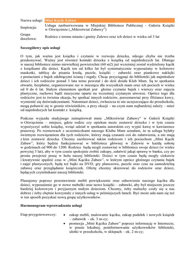 Nazwa usługi: Mini Kącik Zabaw Usługa zaobserwowana w Miejskiej Bibliotece Publicznej - Galeria Książki Inspiracja: w Oświęcimiu („Mikroświat Zabawy”) Grupa Rodzice z terenu miasta i gminy Zalewo oraz ich dzieci w wieku od 3 lat docelowa: Szczegółowy opis usługi O tym, jak ważna jest książka i czytanie w rozwoju dziecka, nikogo chyba nie trzeba przekonywać. Ważny jest również kontakt dziecka z książką od najmłodszych lat. Dlatego w naszej bibliotece mimo niewielkiej powierzchni (60 m2) już wcześniej został wydzielony kącik z książkami dla dzieci. Kącik ten od kilku lat był systematycznie wyposażany w kolorowe maskotki, tablicę do pisania kredą, puzzle, książki – zabawki oraz piankowe naklejki z postaciami z bajek zdobiącymi ścianę i regały. Chcąc przyciągnąć do biblioteki jak najmłodsze dzieci i ich rodziców ponad 3 lata temu powstał i do dziś działa Klub Mam. Są to spotkania otwarte, bezpłatne, organizowane raz w miesiącu dla wszystkich mam oraz ich pociech w wieku od 0 do 6 lat. Stałym elementem spotkań jest głośne czytanie bajek i wierszy oraz zajęcia plastyczne, ruchowe bądź muzyczne oparte na wcześniej czytanym utworze. Oprócz tego dla rodziców jest to świetna okazja, by spotkać innych rodziców, porozmawiać przy filiżance kawy, wymienić się doświadczeniami. Natomiast dzieci, zwłaszcza te nie uczęszczające do przedszkola, mogą pobawić się w gronie rówieśników, a przy okazji – na czym nam najbardziej zależy – mieć od najmłodszych lat kontakt z książką. Podczas wyjazdu studyjnego zainspirował mnie „Mikroświat Zabawy” w Galerii Książki w Oświęcimiu – miejsce, gdzie rodzic czy opiekun może zostawić dziecko i w tym czasie wypożyczyć sobie książkę, wziąć udział w spotkaniu autorskim czy wypić kawę w kawiarence prasowej. Po rozmowach z uczestniczkami naszego Klubu Mam uznałam, że ta usługa byłaby świetnym rozwiązaniem dla tych rodziców, którzy mają czasami coś do załatwienia, a nie mają z kim zostawić dziecka. Chcemy zaoferować takim rodzicom i ich pociechom „Mini Kącik Zabaw”, który będzie funkcjonować w bibliotece głównej w Zalewie w każdą sobotę w godzinach od 900 do 1200. Rodzice będą mogli zostawiać w bibliotece swoje dzieci (w wieku powyżej 3 lat), aby w tym czasie spokojnie zrobić zakupy, załatwić jakąś sprawę w banku, czy po prostu przejrzeć prasę w holu naszej biblioteki. Dzieci w tym czasie będą mogły ciekawie i kreatywnie spędzić czas w „Mini Kąciku Zabaw”, w którym oprócz głośnego czytania bajek i zajęć plastycznych, będą też bajki na DVD, gry planszowe, puzzle oraz czas na samodzielną zabawę oraz przeglądanie książeczek. Ofertę chcemy skierować do rodziców oraz dzieci, będących czytelnikami naszej biblioteki. Planujemy poprzez przestawienie mebli powiększenie oraz odnowienie naszego kącika dla dzieci, wyposażenie go w nowe mebelki oraz nowe książki – zabawki, aby był miejscem jeszcze bardziej kolorowym i przyjaznym małym dzieciom. Chcemy, żeby maluchy czuły się u nas dobrze i żeby chętnie korzystały z innych usług w późniejszych latach. Być może uda nam się też w ten sposób pozyskać nową grupę użytkowników. Harmonogram wprowadzenia usługi Etap przygotowawczy: zakup mebli, malowanie kącika, zakup pudełek i nowych książek – zabawek - ok. 3 m-cy; promocja „Mini Kącika Zabaw” poprzez informację w Internecie, w prasie lokalnej, poinformowanie użytkowników biblioteki, ulotki w przedszkolu, w sklepach – ok. 2 m-cy; Etap wdrożeniowy: Etap ewaluacji: przygotowanie kilku przykładowych scenariuszy zajęć z dziećmi – ok. 1 m-ca; ustawienie nowych mebli i rzeczy do kącika – ok. 1 m-ca; udostępnienie kącika dzieciom, realizacja zajęć dla dzieci; przez cały czas funkcjonowania „Mini Kącika Zabaw”, na podstawie prowadzonego zeszytu odwiedzin oraz metodą obserwacji będą zbierane informacje nt. popularności nowej usługi. Na czym polega innowacyjność wprowadzanej usługi? Do tej pory w naszych różnego rodzaju spotkaniach i zajęciach skierowanych do dzieci mogły brać udział zorganizowane grupy (przedszkolaki oraz uczniowie) oraz dzieci wraz z rodzicami („Klub Mam”). Innowacyjność wprowadzanej usługi polega na tym, że teraz każde chętne dziecko będzie mogło wziąć samodzielnie udział w proponowanych przez nas zajęciach, a rodzic ten czas będzie mógł wykorzystać na zrobienie zakupów czy załatwienie innych spraw. W Zalewie nie ma takiego miejsca, gdzie można by pod czyjąś opieką zostawić dziecko i zrobić np. zakupy. A wiemy, że nie wszyscy rodzice mogą liczyć na pomoc babci czy opiekunki. Chcemy w ten sposób wyjść rodzicom naprzeciw i pozyskać w ten sposób nową grupę odbiorców oraz dobrą opinię wśród mieszkańców Zalewa. Dodatkowe uwagi – Materiały i narzędzia niezbędne do wprowadzenia usługi Nowy stolik i krzesełka – 400 zł, pudełka na książki, audiobooki i filmy DVD – 100 zł, niskie półki na pudełka z książkami i płytami – 200 zł, nowe książki-zabawki – 300 zł, zakup farb do malowania ścian – 150 zł. Pomysłodawca usługi Imię i nazwisko: Edyta Subotowicz Funkcja/Stanowisko w bibliotece: kierownik Nazwa biblioteki: Miejsko – Gminna Biblioteka Publiczna w Zalewie Adres biblioteki: 14-230 Zalewo, ul. Częstochowska 8 Numer telefonu do kontaktu: 89 758 81 44