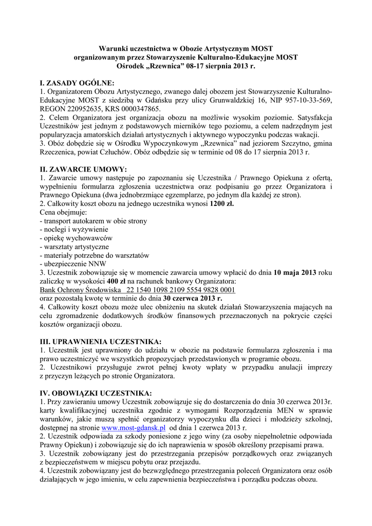 Warunki uczestnictwa w Obozie Artystycznym MOST organizowanym przez Stowarzyszenie Kulturalno-Edukacyjne MOST Ośrodek „Rzewnica” 08-17 sierpnia 2013 r. I. ZASADY OGÓLNE: 1. Organizatorem Obozu Artystycznego, zwanego dalej obozem jest Stowarzyszenie KulturalnoEdukacyjne MOST z siedzibą w Gdańsku przy ulicy Grunwaldzkiej 16, NIP 957-10-33-569, REGON 220952635, KRS 0000347865. 2. Celem Organizatora jest organizacja obozu na możliwie wysokim poziomie. Satysfakcja Uczestników jest jednym z podstawowych mierników tego poziomu, a celem nadrzędnym jest popularyzacja amatorskich działań artystycznych i aktywnego wypoczynku podczas wakacji. 3. Obóz dobędzie się w Ośrodku Wypoczynkowym „Rzewnica” nad jeziorem Szczytno, gmina Rzeczenica, powiat Człuchów. Obóz odbędzie się w terminie od 08 do 17 sierpnia 2013 r. II. ZAWARCIE UMOWY: 1. Zawarcie umowy następuje po zapoznaniu się Uczestnika / Prawnego Opiekuna z ofertą, wypełnieniu formularza zgłoszenia uczestnictwa oraz podpisaniu go przez Organizatora i Prawnego Opiekuna (dwa jednobrzmiące egzemplarze, po jednym dla każdej ze stron). 2. Całkowity koszt obozu na jednego uczestnika wynosi 1200 zł. Cena obejmuje: - transport autokarem w obie strony - noclegi i wyżywienie - opiekę wychowawców - warsztaty artystyczne - materiały potrzebne do warsztatów - ubezpieczenie NNW 3. Uczestnik zobowiązuje się w momencie zawarcia umowy wpłacić do dnia 10 maja 2013 roku zaliczkę w wysokości 400 zł na rachunek bankowy Organizatora: Bank Ochrony Środowiska 22 1540 1098 2109 5554 9828 0001 oraz pozostałą kwotę w terminie do dnia 30 czerwca 2013 r. 4. Całkowity koszt obozu może ulec obniżeniu na skutek działań Stowarzyszenia mających na celu zgromadzenie dodatkowych środków finansowych przeznaczonych na pokrycie części kosztów organizacji obozu. III. UPRAWNIENIA UCZESTNIKA: 1. Uczestnik jest uprawniony do udziału w obozie na podstawie formularza zgłoszenia i ma prawo uczestniczyć we wszystkich propozycjach przedstawionych w programie obozu. 2. Uczestnikowi przysługuje zwrot pełnej kwoty wpłaty w przypadku anulacji imprezy z przyczyn leżących po stronie Organizatora. IV. OBOWIĄZKI UCZESTNIKA: 1. Przy zawieraniu umowy Uczestnik zobowiązuje się do dostarczenia do dnia 30 czerwca 2013r. karty kwalifikacyjnej uczestnika zgodnie z wymogami Rozporządzenia MEN w sprawie warunków, jakie muszą spełnić organizatorzy wypoczynku dla dzieci i młodzieży szkolnej, dostępnej na stronie www.most-gdansk.pl od dnia 1 czerwca 2013 r. 2. Uczestnik odpowiada za szkody poniesione z jego winy (za osoby niepełnoletnie odpowiada Prawny Opiekun) i zobowiązuje się do ich naprawienia w sposób określony przepisami prawa. 3. Uczestnik zobowiązany jest do przestrzegania przepisów porządkowych oraz związanych z bezpieczeństwem w miejscu pobytu oraz przejazdu. 4. Uczestnik zobowiązany jest do bezwzględnego przestrzegania poleceń Organizatora oraz osób działających w jego imieniu, w celu zapewnienia bezpieczeństwa i porządku podczas obozu. 5. Uczestnik zobowiązany jest do zabrania ze sobą legitymacji szkolnej oraz dokumentu poświadczającego ubezpieczenie zdrowotne. V. UPRAWNIENIA ORGANIZATORA: 1. Organizator zastrzega sobie prawo do zmiany warunków umowy lub odwołania imprezy na skutek znaczącej zmiany cen paliwa, zmian regulacji prawnych, z przyczyn od Organizatora niezależnych i niezawinionych, w przypadku niskiej frekwencji, siły wyższej, zagrożenia życia lub zdrowia. 2. W razie rażącego lub uporczywego naruszania przez Uczestnika ustalonego porządku trwania obozu, zagrażającego interesom innych Uczestników, Organizator może rozwiązać umowę lub odstąpić w trybie natychmiastowym. Wszelkie koszty wynikające z rozwiązania umowy obciążają Uczestnika (w przypadku osób niepełnoletnich jego Prawnego Opiekuna). 3. W sytuacji nie stawienia się Uczestnika na miejscu zbiórki, braku wymaganych dokumentów, przerwania pobytu na obozie lub niewykorzystania części świadczeń z przyczyn leżących po stronie Uczestnika, Organizator nie ponosi odpowiedzialności i nie zwraca Uczestnikowi uiszczonej wpłaty za obóz. VI. OBOWIĄZKI ORGANIZATORA: 1. Organizator zobowiązuje się do świadczenia usług w sposób zgodny z warunkami określonymi ofertą. 2. Obowiązkiem Organizatora jest powiadomić niezwłocznie Uczestników o zmianie warunków umowy lub odwołania imprezy. VII. REZYGNACJE: 1. W każdej chwili przed rozpoczęciem obozu można z niego zrezygnować, jednakże ze względu na zawarte przez Organizatora umowy zastrzega się prawo do obciążenia Uczestnika faktycznymi kosztami, jakie Organizator poniesie w związku z rezygnacją Uczestnika z obozu. 2. Rezygnacja wymaga pisemnego oświadczenia. VIII. POSTANOWIENIA KOŃCOWE 1. W sprawach nieuregulowanych niniejszymi Warunkami uczestnictwa zastosowanie mają przepisy Kodeksu Cywilnego. 2. Ewentualne spory, strony będą rozstrzygały polubownie, a w przypadku nieosiągnięcia porozumienia wszelkie spory prawne wynikające z niniejszej umowy będą rozstrzygane przez sąd właściwy ze względu na położenie siedziby Organizatora.