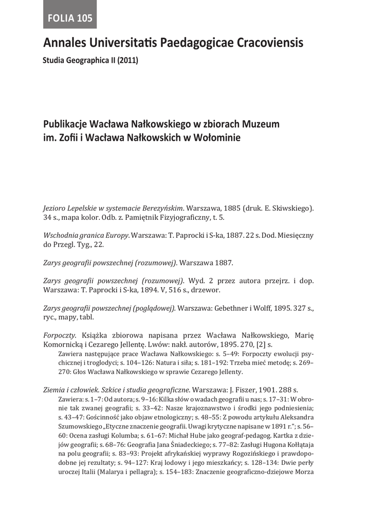 Folia 105 Annales Universitatis Paedagogicae Cracoviensis Studia Geographica II (2011) Publikacje Wacława Nałkowskiego w zbiorach muzeum im. Zofii i Wacława Nałkowskich w Wołominie Jezioro Lepelskie w systemacie Berezyńskim. Warszawa, 1885 (druk. E. Skiwskiego). 34 s., mapa kolor. Odb. z. Pamiętnik Fizyjograficzny, t. 5. Wschodnia granica Europy. Warszawa: T. Paprocki i S-ka, 1887. 22 s. Dod. Miesięczny do Przegl. Tyg., 22. Zarys geografii powszechnej (rozumowej). Warszawa 1887. Zarys geografii powszechnej (rozumowej). Wyd. 2 przez autora przejrz. i dop. Warszawa: T. Paprocki i S-ka, 1894. V, 516 s., drzewor. Zarys geografii powszechnej (poglądowej). Warszawa: Gebethner i Wolff, 1895. 327 s., ryc., mapy, tabl. Forpoczty. Książka zbiorowa napisana przez Wacława Nałkowskiego, Marię Komornicką i Cezarego Jellentę. Lwów: nakł. autorów, 1895. 270, [2] s. Zawiera następujące prace Wacława Nałkowskiego: s. 5–49: Forpoczty ewolucji psychicznej i troglodyci; s. 104–126: Natura i siła; s. 181–192: Trzeba mieć metodę; s. 269– 270: Głos Wacława Nałkowskiego w sprawie Cezarego Jellenty. Ziemia i człowiek. Szkice i studia geograficzne. Warszawa: J. Fiszer, 1901. 288 s. Zawiera: s. 1–7: Od autora; s. 9–16: Kilka słów o wadach geografii u nas; s. 17–31: W obronie tak zwanej geografii; s. 33–42: Nasze krajoznawstwo i środki jego podniesienia; s. 43–47: Gościnność jako objaw etnologiczny; s. 48–55: Z powodu artykułu Aleksandra Szumowskiego „Etyczne znaczenie geografii. Uwagi krytyczne napisane w 1891 r.”; s. 56– 60: Ocena zasługi Kolumba; s. 61–67: Michał Hube jako geograf-pedagog. Kartka z dziejów geografii; s. 68–76: Geografia Jana Śniadeckiego; s. 77–82: Zasługi Hugona Kołłątaja na polu geografii; s. 83–93: Projekt afrykańskiej wyprawy Rogozińskiego i prawdopodobne jej rezultaty; s. 94–127: Kraj lodowy i jego mieszkańcy; s. 128–134: Dwie perły uroczej Italii (Malarya i pellagra); s. 154–183: Znaczenie geograficzno-dziejowe Morza Publikacje Wacława Nałkowskiego w zbiorach Muzeum... [53] Śródziemnego; s. 154–183: Systemat Nilu i jego znaczenie; s. 184–220: Abisynia i jej mieszkańcy; s. 221–235: Dżungarska brama narodów; s. 236–288: Afganistan i jego stanowisko geograficzno-dziejowe. Geografia malownicza. Cz. 1. Australia (z Polinezją). Warszawa: M. Arct, 1902. 165, [II] s., rys. Podręcznik do nauki geografii powszechnej. Warszawa: T. Paprocki i S-ka, 1903. 410 s., rys. Wielki atlas geograficzny ze skorowidzem nazw i tekstem objaśniającym opracowany wedle najnowszych źródeł. Pod red. Wacława Nałkowskiego i Andrzeja Świętochowskiego. Warszawa: S. Sikorski, 1904. 53 mapy kolor. [4] s., [206] s. (skorowidz). Jednostka i ogół. Szkice i krytyki psycho-społeczne. Kraków: U. Czatowicz, 1904. 510, [2] s. Zawiera: s. 1–2: Od Autora; s. 5–34: Natura i siła; s. 35–90: Forpoczty ewolucji psychicznej i troglodyci; s. 91–97: Z powodu Forpoczt; s. 98–104: Reakcja i ewolucja; s. 105–133: Przeduchowiona; s. 134–139: Nietszche i Nietzscheanizm; s. 140–142: Amiel a Nietzsche; s. 143–145: Poszukiwanie utraconego ojca; s. 146–155: „Chimera” wobec ewolucji; s. 156–165: Skandale jako czynniki ewolucji; s. 166–171: „Et Haec Meminisse Jurabit”; s. 172–185: Evoe! Jak ci bogowie na sposoby biorą się!; s. 186– 190: Dzikie pretensje; s. 191–192: Wyjaśnienie; s. 193–207: Trzeba mieć metodę; s. 208–234: Epizod z rugów polskich; s. 235–250: Początki dziedzicznego obarczenia ludzkości; s. 251–255: Z dziejów miłości chrześcijańskiej; s. 256–273: Nie tędy droga, szanowny panie!; s. 274–284: Kopnięcie umierającego lwa; s. 285–287: List dra Hertza; s. 288–293: Odpowiedź drowi Hertzowi; s. 294–299: Z powodu życiorysu Darwina; s. 300–306: Z powodu estetyki Guyau; s. 307–311: Z powodu odczytów o życiu; s. 312–322: Filozofia praktyczna, czyli etyka pastorska; s. 323–326: Warszawski Hegel czyli czarna niewdzięczność; s. 327–332: Socjologia lecznicza; s. 333–338: Odpowiedź Dra Chodeckiego; s. 339–347: Odpowiedź Drowi Chodeckiemu; s. 348–355: Swojski piasek; s. 356–358: Kiepska służba; s. 359–364: Zaściankowa oryginalność; s. 365–372: Cnotliwa rodzina; s. 373–374: Z przedwczesnych mogił; s. 375–377: „Bóg zasmuci, Bóg pocieszy”; s. 378–387: O sprawiedliwość; s. 388–392: Bezstronny głos w sprawie żydowskiej; s. 393–416: Wspomnienia krakowskiego studenta; s. 417–429: Echa. (Badanie kraju metodą swojską). – Swojski pogromca Darwina. – Warszawski Skotinin. – Sympatie hiszpańskie. – Wietrzenie niereligijności. – Emety literacki. – Nagonka moralistów na Zolę. – Zbyteczne zdziwienie. – Chaos chaotyczny i chaos niechaotyczny); s. 430–505: Ucieczka na „łono natury”; s. 506–510: Rzut oka w daleką przyszłość. Dookoła Alp. Luźne notatki i refleksje z błyskawicznej podróży z 35 rysunkami w tekście. Warszawa: Księgarnia Naukowa, 1904. 56 s., rys., mapy. Odb. z. Przyroda, t. 1. [54] Publikacje Wacława Nałkowskiego w zbiorach Muzeum... Bojownik. Fantazja. Warszawa: S. Demby, 1904. 30 s., rys. Sienkiewicziana. Szkice do obrazu. Kraków: nakł. autora, 1904. 87 s. Zawiera: s. 5–6: Przedmowa; s. 9–16: Zbyteczny ból; s. 17–22: Niefortunny obrońca p. Sienkiewicza; s. 23–26: Na sposoby biorą się; s. 27–33: „Wyzyskiwani” a „Rodzina Połanieckich”; s. 34–37: Pan Sienkiewicz a Zola; s. 38–87: Geneza produkcji i chwały pana Sienkiewicza. Mała geografia fizyczna. Zarys. Warszawa: M. Arct, 1905. 142 s., rys. Książki dla wszystkich, 272 Zarys geografii rozumowej (geologii). Wyd. 3 znacznie rozsz. Warszawa: M. Arct, 1907. XIV, 703 s., mapy kolor. Zarys metodyki geografii. Warszawa: Wydaw. Pedagogiczne Pol. Związku Nauczycielstwa, 1908. 60 s. Prace metodyczne w zakresie wykształcenia średniego, 5. Geografia szkolna (rozumowa). Cz. 3. Geografia szczegółowa 