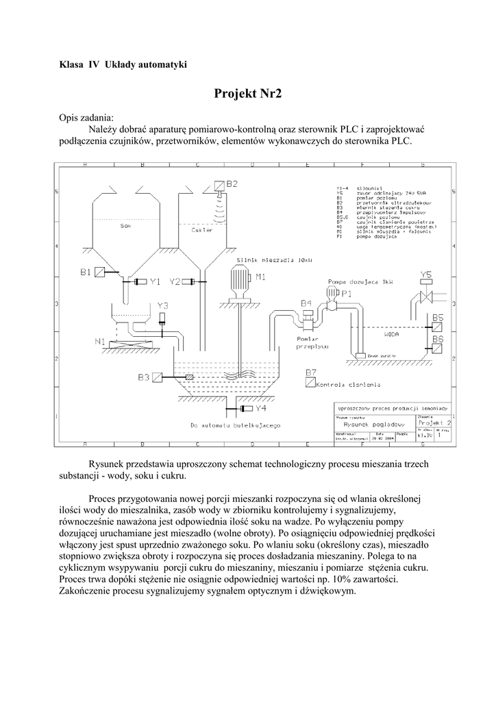 Klasa IV Układy automatyki Projekt Nr2 Opis zadania: Należ y dobrać aparaturępomiarowo-kontrolną oraz sterownik PLC i zaprojektować podłą czenia czujnikó w, przetwornikó w, elementó w wykonawczych do sterownika PLC. Rysunek przedstawia uproszczony schemat technologiczny procesu mieszania trzech substancji - wody, soku i cukru. Proces przygotowania nowej porcji mieszanki rozpoczyna sięod wlania okreś lonej iloś ci wody do mieszalnika, zasó b wody w zbiorniku kontrolujemy i sygnalizujemy, ró wnocześ nie naważ ona jest odpowiednia iloś ć soku na wadze. Po wyłą czeniu pompy dozują cej uruchamiane jest mieszadło (wolne obroty). Po osią gnięciu odpowiedniej prędkoś ci włą czony jest spust uprzednio zważ onego soku. Po wlaniu soku (okreś lony czas), mieszadło stopniowo zwiększa obroty i rozpoczyna sięproces dosładzania mieszaniny. Polega to na cyklicznym wsypywaniu porcji cukru do mieszaniny, mieszaniu i pomiarze stęż enia cukru. Proces trwa dopó ki stęż enie nie osią gnie odpowiedniej wartoś ci np. 10% zawartoś ci. Zakończenie procesu sygnalizujemy sygnałem optycznym i dźwiękowym. Dane do projektu: Pojemnik soku Należ y mierzyć poziom soku [B1] w celu wizualizacji i sygnalizacji na panelu operatora HMI, sterowanie zaworem [U1] binarnie. Zadanie – dobrać B1, podłą czyć do zasilania i sterownika. CewkęY1 podłą czyć do wyjś cia sterownika Waga soku Mostek tensometryczny [N1] o czułoś ci 2,2mV/1kg przy zasilaniu 10V. Należ y dobrać wzmacniacz prą du stałego, dostosować sygnał wyjś ciowy wzmacniacza do wejś cia karty przetwornika A/C w sterowniku PLC. Proponowana rozdzielczoś ć 10-12bitó w. Sterowanie spustem soku do mieszalnika zaworem [Y3] binarnie. Zadanie – dobrać wzmacniacz do tensometru, kartęprzetwornika PLC (albo PLC z wejś ciami analogowymi) podłą czyć do wejś ć sterownika. CewkęY3 podłą czyć do wyjś cia sterownika. Pojemnik cukru Należ y mierzyć poziom cukru [B2] w celu sygnalizacji i wizualizacji na panelu operatora HMI, ze względu na właś ciwoś ci cukru proponuję ultradźwiękowy przetwornik poziomu. Sterowanie spustem soku do mieszalnika zaworem [Y2] binarnie. Zadanie – dobrać przetwornik wraz z sondą ultradźwiękową , kartę przetwornika PLC (albo PLC z wejś ciami analogowymi) podłą czyć do wejś ć sterownika. CewkęY2 podłą czyć do wyjś cia sterownika. Zbiornik wody Pomiar przepływu wody [B4] do mieszalnika (proponowany przetwornik impulsowy), sygnalizacja poziomó w [B5 i B6]w zbiorniku. Sterowanie zaworem odcinają cym [Y5] oraz pompa dozują cą [P1] binarnie. Zadanie – dobrać sygnalizatory poziomu B5,B6, przetwornik przepływu B4 i podłą czyć do wejś ć sterownika. Cewkę Y5 oraz stycznik pompy P1 podłą czyć do wyjś ć sterownika. Mieszalnik głó wny Pomiar stęż enia cukru [B3], płynne sterowanie mieszadłem [M1], spust gotowej mieszaniny zaworem [Y4]. Zadanie – Dobrać falownik do mocy silnika, rozwią zać sposó b sterownia falownikiem za pomocą sygnałó w sterownika PLC, dopuszczalne skokowe sterowanie prędkoś cią (4 prędkoś ci). Cewkęzaworu Y4 podłą czyć do wyjś cia sterownika PLC. (Listwa zaciskowa miernika B3 na rysunku). Sterownik PLC Dobrać uwzględniają c iloś ć wejś ć analogowych, binarnych, wyjś ć binarnych i analogowych. Uwagi: Aparaturędobierać uwzględniają c zastosowanie w przemyś le spoż ywczym (atesty. IP itp.) Projekt winien zawierać: specyfikację zastosowanej aparatury, schematy podłą czeń listew zaciskowych do sterownika PLC, iloś ć i sposó b podłą czenia przyciskó w i przełą cznikó w panelu sterowania (synoptyki) oraz sposó b zasilania i zabezpieczenia sterownika PLC. Panelu operatora HMI nie dobierać. Nie projektować obwodó w mocy i zasilania. Nie pisać programu. Danych szukać w katalogach, w sieci na stronach producentó w aparatury (patrz „linki” na naszej stronie WWW) Sposó b sterowania siłownikiem pokazano na rysunku obok Termin realizacji projektu: Jeden miesiąc od daty ogłoszenia (od 3.03.2004) Schemat blokowy rozwią zania projektu nr 2 Ocena: Celują ca Bardzodobra Dobra Dostareczna Dopuszczają ca Niedostateczna w terminie, wykonanie bez błędó w, staranne czytelne schematy, aparatura dobrana zgodnie z procesem. w terminie drobne błędy, staranne rysunki, dobrana aparatura. w terminie, drobne błędy, wszystkie rysunki, dobrana aparatura w terminie, niestaranne rysunki, niekompletna aparatura brak podłą czeń po terminie nieczytelne rysunki brak podłą czeń i kompletu aparatury brak projektu, szczegó lnie niestarannie z raż ą cymi błędami. Powodzenia !!! Opracował Inż . Stanisław Wilczyński Bydgoszcz 29.02.2004