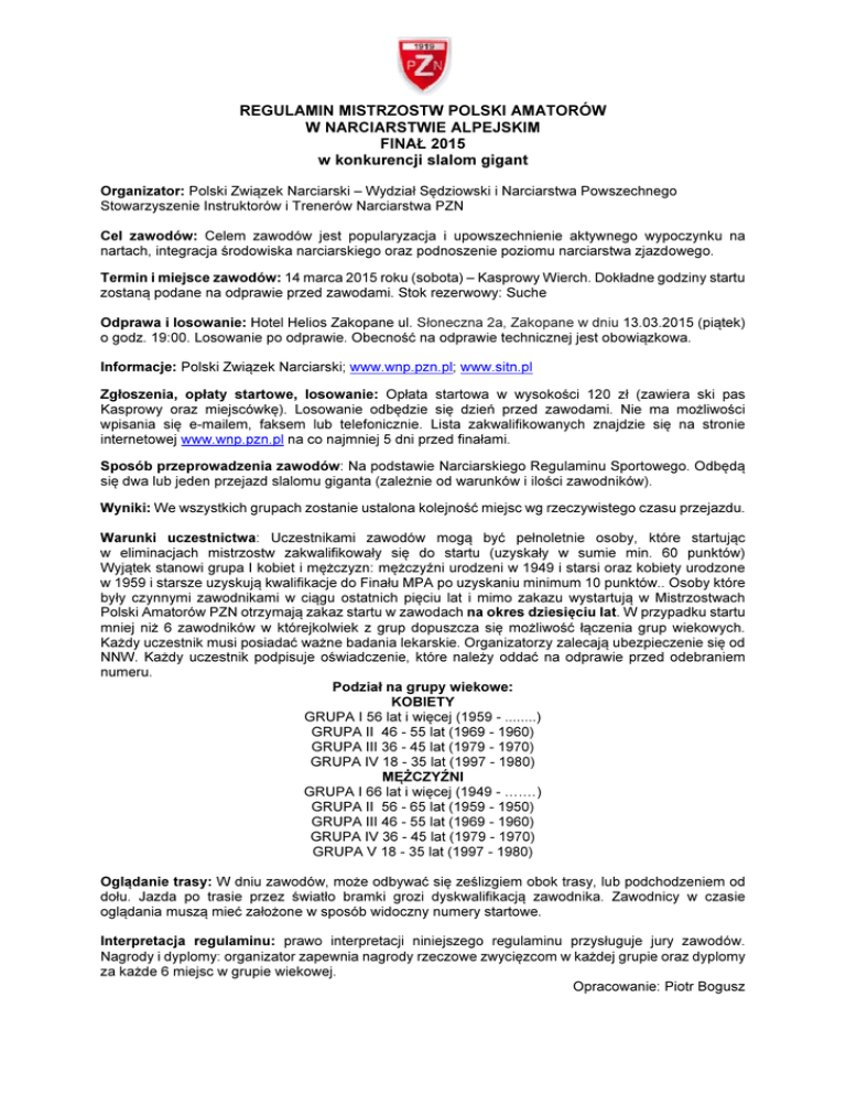 REGULAMIN MISTRZOSTW POLSKI AMATORÓW W NARCIARSTWIE ALPEJSKIM FINAŁ 2015 w konkurencji slalom gigant Organizator: Polski Związek Narciarski – Wydział Sędziowski i Narciarstwa Powszechnego Stowarzyszenie Instruktorów i Trenerów Narciarstwa PZN Cel zawodów: Celem zawodów jest popularyzacja i upowszechnienie aktywnego wypoczynku na nartach, integracja środowiska narciarskiego oraz podnoszenie poziomu narciarstwa zjazdowego. Termin i miejsce zawodów: 14 marca 2015 roku (sobota) – Kasprowy Wierch. Dokładne godziny startu zostaną podane na odprawie przed zawodami. Stok rezerwowy: Suche Odprawa i losowanie: Hotel Helios Zakopane ul. Słoneczna 2a, Zakopane w dniu 13.03.2015 (piątek) o godz. 19:00. Losowanie po odprawie. Obecność na odprawie technicznej jest obowiązkowa. Informacje: Polski Związek Narciarski; www.wnp.pzn.pl; www.sitn.pl Zgłoszenia, opłaty startowe, losowanie: Opłata startowa w wysokości 120 zł (zawiera ski pas Kasprowy oraz miejscówkę). Losowanie odbędzie się dzień przed zawodami. Nie ma możliwości wpisania się e-mailem, faksem lub telefonicznie. Lista zakwalifikowanych znajdzie się na stronie internetowej www.wnp.pzn.pl na co najmniej 5 dni przed finałami. Sposób przeprowadzenia zawodów: Na podstawie Narciarskiego Regulaminu Sportowego. Odbędą się dwa lub jeden przejazd slalomu giganta (zależnie od warunków i ilości zawodników). Wyniki: We wszystkich grupach zostanie ustalona kolejność miejsc wg rzeczywistego czasu przejazdu. Warunki uczestnictwa: Uczestnikami zawodów mogą być pełnoletnie osoby, które startując w eliminacjach mistrzostw zakwalifikowały się do startu (uzyskały w sumie min. 60 punktów) Wyjątek stanowi grupa I kobiet i mężczyzn: mężczyźni urodzeni w 1949 i starsi oraz kobiety urodzone w 1959 i starsze uzyskują kwalifikacje do Finału MPA po uzyskaniu minimum 10 punktów.. Osoby które były czynnymi zawodnikami w ciągu ostatnich pięciu lat i mimo zakazu wystartują w Mistrzostwach Polski Amatorów PZN otrzymają zakaz startu w zawodach na okres dziesięciu lat. W przypadku startu mniej niż 6 zawodników w którejkolwiek z grup dopuszcza się możliwość łączenia grup wiekowych. Każdy uczestnik musi posiadać ważne badania lekarskie. Organizatorzy zalecają ubezpieczenie się od NNW. Każdy uczestnik podpisuje oświadczenie, które należy oddać na odprawie przed odebraniem numeru. Podział na grupy wiekowe: KOBIETY GRUPA I 56 lat i więcej (1959 - ........) GRUPA II 46 - 55 lat (1969 - 1960) GRUPA III 36 - 45 lat (1979 - 1970) GRUPA IV 18 - 35 lat (1997 - 1980) MĘŻCZYŹNI GRUPA I 66 lat i więcej (1949 - ….…) GRUPA II 56 - 65 lat (1959 - 1950) GRUPA III 46 - 55 lat (1969 - 1960) GRUPA IV 36 - 45 lat (1979 - 1970) GRUPA V 18 - 35 lat (1997 - 1980) Oglądanie trasy: W dniu zawodów, może odbywać się ześlizgiem obok trasy, lub podchodzeniem od dołu. Jazda po trasie przez światło bramki grozi dyskwalifikacją zawodnika. Zawodnicy w czasie oglądania muszą mieć założone w sposób widoczny numery startowe. Interpretacja regulaminu: prawo interpretacji niniejszego regulaminu przysługuje jury zawodów. Nagrody i dyplomy: organizator zapewnia nagrody rzeczowe zwycięzcom w każdej grupie oraz dyplomy za każde 6 miejsc w grupie wiekowej. Opracowanie: Piotr Bogusz