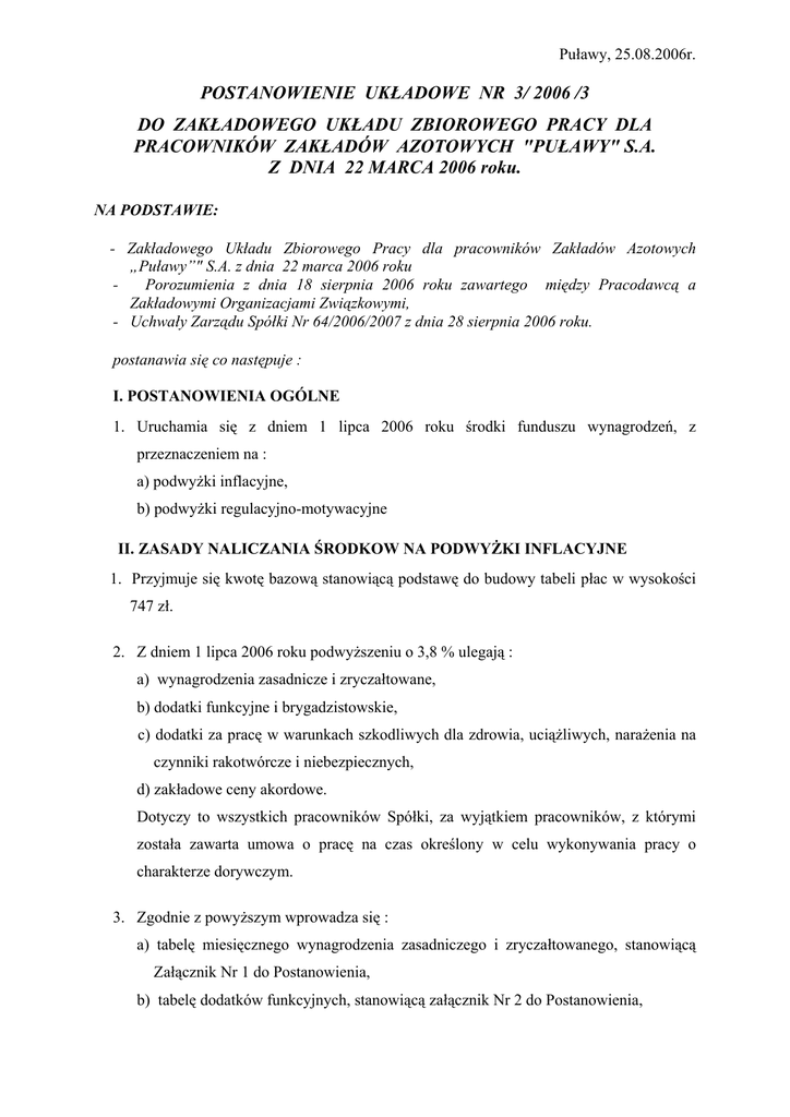 Puławy, 25.08.2006r. POSTANOWIENIE UKŁADOWE NR 3/ 2006 /3 DO ZAKŁADOWEGO UKŁADU ZBIOROWEGO PRACY DLA PRACOWNIKÓW ZAKŁADÓW AZOTOWYCH "PUŁAWY" S.A. Z DNIA 22 MARCA 2006 roku. NA PODSTAWIE: - Zakładowego Układu Zbiorowego Pracy dla pracowników Zakładów Azotowych „Puławy”" S.A. z dnia 22 marca 2006 roku Porozumienia z dnia 18 sierpnia 2006 roku zawartego między Pracodawcą a Zakładowymi Organizacjami Związkowymi, - Uchwały Zarządu Spółki Nr 64/2006/2007 z dnia 28 sierpnia 2006 roku. postanawia się co następuje : I. POSTANOWIENIA OGÓLNE 1. Uruchamia się z dniem 1 lipca 2006 roku środki funduszu wynagrodzeń, z przeznaczeniem na : a) podwyżki inflacyjne, b) podwyżki regulacyjno-motywacyjne II. ZASADY NALICZANIA ŚRODKOW NA PODWYŻKI INFLACYJNE 1. Przyjmuje się kwotę bazową stanowiącą podstawę do budowy tabeli płac w wysokości 747 zł. 2. Z dniem 1 lipca 2006 roku podwyższeniu o 3,8 % ulegają : a) wynagrodzenia zasadnicze i zryczałtowane, b) dodatki funkcyjne i brygadzistowskie, c) dodatki za pracę w warunkach szkodliwych dla zdrowia, uciążliwych, narażenia na czynniki rakotwórcze i niebezpiecznych, d) zakładowe ceny akordowe. Dotyczy to wszystkich pracowników Spółki, za wyjątkiem pracowników, z którymi została zawarta umowa o pracę na czas określony w celu wykonywania pracy o charakterze dorywczym. 3. Zgodnie z powyższym wprowadza się : a) tabelę miesięcznego wynagrodzenia zasadniczego i zryczałtowanego, stanowiącą Załącznik Nr 1 do Postanowienia, b) tabelę dodatków funkcyjnych, stanowiącą załącznik Nr 2 do Postanowienia, 2 c) tabelę dodatków brygadzistowskich, stanowiącą Załącznik Nr 3 do Postanowienia, d) tabelę dodatków za pracę w warunkach szkodliwych dla zdrowia, uciążliwych, narażenia na czynniki rakotwórcze i niebezpiecznych, stanowiącą załącznik Nr 4 do Postanowienia. 4. Decyzję o nie przyznaniu podwyżki inflacyjnej dla pracowników wobec, których w okresie ostatnich 12 miesięcy zastosowano kary porządkowe ( nagana, upomnienie) lub posiadają nieobecność nieusprawiedliwioną, pozostawia się do indywidualnej oceny przełożonych tych pracowników. Bezpośredni przełożeni są zobowiązani do poinformowania pracownika o nie przyznaniu podwyżki inflacyjnej wraz z podaniem uzasadnienia swojej decyzji. 5. W przypadku podjęcia przez przełożonego decyzji o nie przyznaniu podwyżki inflacyjnej pracownikowi, konieczne jest załączenie pisemnego uzasadnienia tej decyzji do listy regulacji plac przekazywanej do Biura Personalnego. Uzasadnienie to zostanie załączone do akt osobowych pracownika. III. ZASADY NALICZANIA ŚRODKÓW NA PODWYŻKI REGULACYJNOMOTYWACYJNE. 1. Naliczenia środków na podwyżki regulacyjno-motywacyjne dokonuje się na pracowników zatrudnionych co najmniej 2 lata w Spółce wg stanu na dzień 1 lipca br., których wynagrodzenie znajduje się poniżej kategorii docelowej wynikającej z Taryfikatora Kwalifikacyjnego Stanowisk Pracy. 2. Naliczenia środków na poszczególne Piony/Biura dokonuje się proporcjonalnie do ilości kategorii poniżej grup wynikających z Taryfikatora Kwalifikacyjnego Stanowisk Pracy w danym Pionie/Biurze oraz ilości środków przypadających na każdą brakującą kategorię. 3. Osobami decydującymi o regulacjach płacowych są : a) Członkowie Zarządu – w odniesieniu do Dyrektorów Pionów/Szefów Biur oraz bezpośrednio podległych im pracowników, b) Dyrektorzy Pionów/ Szefowie Biur – w odniesieniu do kierowników i pracowników bezpośrednio im podległych oraz w odniesieniu do wielkości środków przeznaczonych na regulacje w podległych jednostkach organizacyjnych, c) Kierownicy jednostek organizacyjnych – w odniesieniu do podległych im pracowników w ramach puli przyznanej przez Dyrektora Pionu/Szefa Biura, 3 d) Kierownicy komórek organizacyjnych – w odniesieniu do podległych im pracowników w ramach puli przyznanej przez Kierowników jednostek organizacyjnych, z tym, że głównym oceniającym i wnioskującym o wysokości wynagrodzenia pracownika i kwocie podwyżki jest bezpośredni przełożony pracownika (np. mistrz) zwani dalej „dysponentami ‘’ środków. 4. W przypadku przesunięcia przez dysponentów środków pomiędzy jednostkami i komórkami organizacyjnymi konieczne jest załączenie pisemnego uzasadnienia tej decyzji i przesłanie do Biura Personalnego. 5. Dysponenci środków oraz bezpośredni przełożeni pracownika zobowiązani są do poinformowania pracownika o uzyskanej kwocie regulacji lub braku podwyżki wraz z podaniem uzasadnienia co do wysokości podwyżki płacowej lub braku jej przyznania. 6. W przypadku podjęcia przez przełożonego decyzji o nie przyznaniu podwyżki dla pracownika zatrudnionego co najmniej 2 lata w Spółce wg stanu na dzień 1 lipca br. posiadającego płacę zasadniczą mieszącą się poniżej kategorii docelowej, konieczne jest załączenie pisemnego uzasadnienia tej decyzji do list regulacji płac przekazywanej do Biura Personalnego. Uzasadnienie to zostanie załączone do akt osobowych pracownika. 7. Dysponenci środków oraz bezpośredni przełożeni powinni przestrzegać następujących zasad : 1/ dysponenci środków oraz bezpośredni przełożeni przyznają nową stawkę płacy zasadniczej, 2/ wysokość płacy zasadniczej po regulacji nie powinna przekraczać maksymalnej płacy zasadniczej w docelowej kategorii zaszeregowania obowiązującego Taryfikatora dla danego stanowiska, 3/ podziału środków na poszczególnych pracowników należy dokonać zgodnie z dyspozycją Art.183c Kodeksu pracy, w celu nie pogłębiania zróżnicowania wynagrodzeń w poszczególnych kategoriach taryfikacyjnych, 4/ stosować zasadę motywacyjnego charakteru podwyżek, 5/ dążyć do osiągnięcia właściwych proporcji płacowych między poszczególnymi stanowiskami, 4 6/ różnicować kwoty podwyżek w zależności od wyników pracy pracowników, od kwalifikacji, wydajności pracy i z