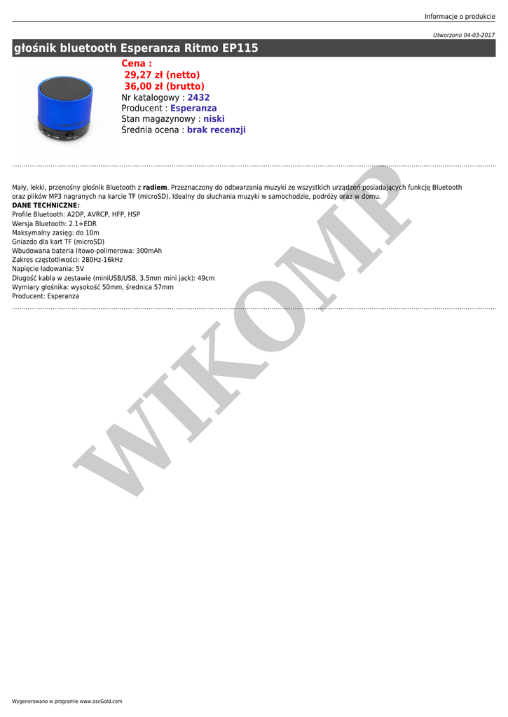 Informacje o produkcie Utworzono 04-03-2017 głośnik bluetooth Esperanza Ritmo EP115 Cena : 29,27 zł (netto) 36,00 zł (brutto) Nr katalogowy : 2432 Producent : Esperanza Stan magazynowy : niski Średnia ocena : brak recenzji W IK O M P Mały, lekki, przenośny głośnik Bluetooth z radiem. Przeznaczony do odtwarzania muzyki ze wszystkich urządzeń posiadających funkcję Bluetooth oraz plików MP3 nagranych na karcie TF (microSD). Idealny do słuchania muzyki w samochodzie, podróży oraz w domu. DANE TECHNICZNE: Profile Bluetooth: A2DP, AVRCP, HFP, HSP Wersja Bluetooth: 2.1+EDR Maksymalny zasięg: do 10m Gniazdo dla kart TF (microSD) Wbudowana bateria litowo-polimerowa: 300mAh Zakres częstotliwości: 280Hz-16kHz Napięcie ładowania: 5V Długość kabla w zestawie (miniUSB/USB, 3.5mm mini jack): 49cm Wymiary głośnika: wysokość 50mm, średnica 57mm Producent: Esperanza Wygenerowano w programie www.oscGold.com
