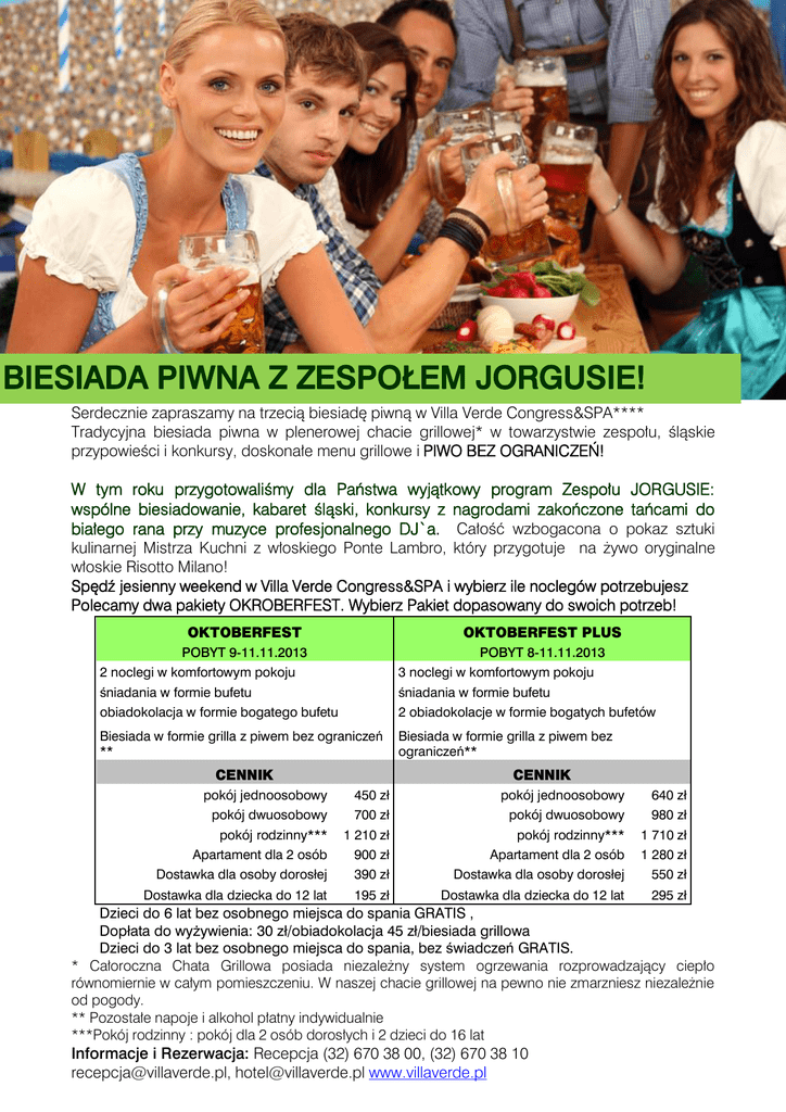 BIESIADA PIWNA Z ZESPOŁEM JORGUSIE! Serdecznie zapraszamy na trzecią biesiadę piwną w Villa Verde Congress&SPA**** Tradycyjna biesiada piwna w plenerowej chacie grillowej* w towarzystwie zespołu, śląskie przypowieści i konkursy, doskonałe menu grillowe i PIWO BEZ OGRANICZEŃ! W tym roku przygotowaliśmy dla Państwa wyjątkowy program Zespołu JORGUSIE: wspólne biesiadowanie, kabaret śląski, konkursy z nagrodami zakończone tańcami do białego rana przy muzyce profesjonalnego DJ`a. Całość wzbogacona o pokaz sztuki kulinarnej Mistrza Kuchni z włoskiego Ponte Lambro, który przygotuje na żywo oryginalne włoskie Risotto Milano! Spędź jesienny weekend w Villa Verde Congress&SPA i wybierz ile noclegów potrzebujesz Polecamy dwa pakiety OKROBERFEST. Wybierz Pakiet dopasowany do swoich potrzeb! OKTOBERFEST POBYT 9-11.11.2013 2 noclegi w komfortowym pokoju OKTOBERFEST PLUS POBYT 8-11.11.2013 3 noclegi w komfortowym pokoju śniadania w formie bufetu obiadokolacja w formie bogatego bufetu śniadania w formie bufetu 2 obiadokolacje w formie bogatych bufetów Biesiada w formie grilla z piwem bez ograniczeń ** Biesiada w formie grilla z piwem bez ograniczeń** CENNIK pokój jednoosobowy pokój dwuosobowy CENNIK pokój jednoosobowy pokój dwuosobowy pokój rodzinny*** Apartament dla 2 osób Dostawka dla osoby dorosłej 450 zł 700 zł 1 210 zł 900 zł 390 zł pokój rodzinny*** Apartament dla 2 osób Dostawka dla osoby dorosłej 640 zł 980 zł 1 710 zł 1 280 zł 550 zł Dostawka dla dziecka do 12 lat 195 zł Dostawka dla dziecka do 12 lat 295 zł Dzieci do 6 lat bez osobnego miejsca do spania GRATIS , Dopłata do wyżywienia: 30 zł/obiadokolacja 45 zł/biesiada grillowa Dzieci do 3 lat bez osobnego miejsca do spania, bez świadczeń GRATIS. * Całoroczna Chata Grillowa posiada niezależny system ogrzewania rozprowadzający ciepło równomiernie w całym pomieszczeniu. W naszej chacie grillowej na pewno nie zmarzniesz niezależnie od pogody. ** Pozostałe napoje i alkohol płatny indywidualnie ***Pokój rodzinny : pokój dla 2 osób dorosłych i 2 dzieci do 16 lat Informacje i Rezerwacja: Recepcja (32) 670 38 00, (32) 670 38 10 [email protected], [email protected] www.villaverde.pl