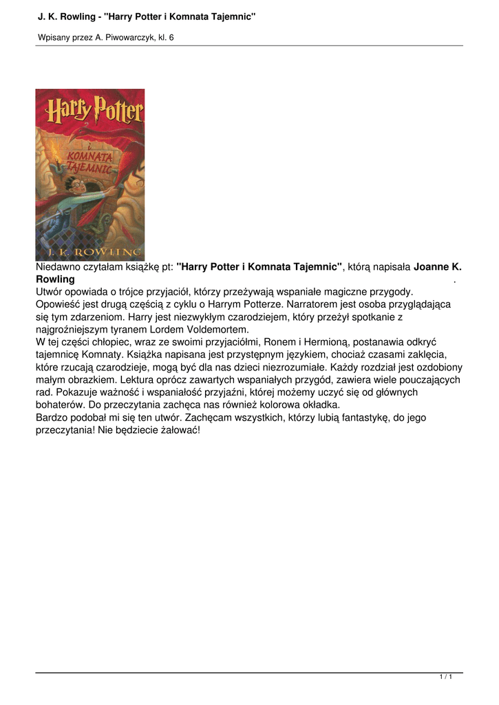 J. K. Rowling - "Harry Potter i Komnata Tajemnic" Wpisany przez A. Piwowarczyk, kl. 6 Niedawno czytałam książkę pt: "Harry Potter i Komnata Tajemnic", którą napisała Joanne K. Rowling . Utwór opowiada o trójce przyjaciół, którzy przeżywają wspaniałe magiczne przygody. Opowieść jest drugą częścią z cyklu o Harrym Potterze. Narratorem jest osoba przyglądająca się tym zdarzeniom. Harry jest niezwykłym czarodziejem, który przeżył spotkanie z najgroźniejszym tyranem Lordem Voldemortem. W tej części chłopiec, wraz ze swoimi przyjaciółmi, Ronem i Hermioną, postanawia odkryć tajemnicę Komnaty. Książka napisana jest przystępnym językiem, chociaż czasami zaklęcia, które rzucają czarodzieje, mogą być dla nas dzieci niezrozumiałe. Każdy rozdział jest ozdobiony małym obrazkiem. Lektura oprócz zawartych wspaniałych przygód, zawiera wiele pouczających rad. Pokazuje ważność i wspaniałość przyjaźni, której możemy uczyć się od głównych bohaterów. Do przeczytania zachęca nas również kolorowa okładka. Bardzo podobał mi się ten utwór. Zachęcam wszystkich, którzy lubią fantastykę, do jego przeczytania! Nie będziecie żałować! 1/1