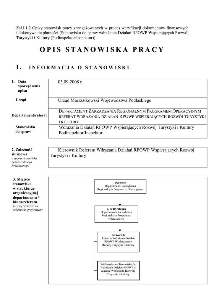 Zał.I.1.2 Opisy stanowisk pracy zaangaŜowanych w proces weryfikacji dokumentów finansowych i dokonywanie płatności (Stanowisko do spraw wdraŜania Działań RPOWP Wspierających Rozwój Turystyki i Kultury (Podinspektor/Inspektor)) OPIS STANOWISKA PRACY I. INFORMACJA O STANOWISKU 1. Data sporządzenia opisu Urząd Departament/referat 03.09.2008 r. Urząd Marszałkowski Województwa Podlaskiego DEPARTAMENT ZARZĄDZANIA REGIONALNYM PROGRAMEM OPERACYJNYM REFERAT WDRAśANIA DZIAŁAŃ RPOWP WSPIERAJĄCYCH ROZWÓJ TURYSTYKI I KULTURY Stanowisko do spraw 2. ZaleŜność słuŜbowa - nazwa stanowiska bezpośredniego PrzełoŜonego 3. Miejsce stanowiska w strukturze organizacyjnej departamentu / biura/referatu (proszę wskazać na schemacie graficznym) WdraŜania Działań RPOWP Wspierających Rozwój Turystyki i Kultury Podinspektor/Inspektor Kierownik Referatu WdraŜania Działań RPOWP Wspierających Rozwój Turystyki i Kultury Dyrektor Departamentu Zarządzania Regionalnym Programem Operacyjnym Z-ca Dyrektora Departamentu Zarządzania Regionalnym Programem Operacyjnym Kierownik Referatu WdraŜania Działań RPOWP Wspierających Rozwój Turystyki i Kultury Wieloosobowe Stanowisko ds. WdraŜania Działań RPOWP w zakresie Wspierania Rozwoju Turystyki i Kultury II. ZAKRES OBOWIĄZKÓW I ODPOWIEDZIALNOŚCI 4. Zakres odpowiedzialności kierowniczej i finansowej - dotyczy stanowisk średniego szczebla zarządzania oraz koordynujących i samodzielnych W sposób zwięzły naleŜy przedstawić uprawnienia kierownicze osoby zajmującej opisywane stanowisko, w tym: - podać liczbę osób podlegających danej osobie bezpośrednio oraz liczbę osób, jaką kieruje pośrednio. - wyszczególnić wykształcenie podległych osób, . określić uprawnienia do dysponowania środkami finansowymi (budŜety, programy, projekty) Uwaga!! Planowanie budŜetu nie stanowi odpowiedzialności finansowej. 5. Cel istnienia stanowiska Proszę w zwięzły sposób określić ogólny cel istnienia stanowiska, tzn. główną przyczynę stworzenia stanowiska. Nie dotyczy. Efektywne i skuteczne wdraŜanie Działań Wspierających Rozwój Turystyki i Kultury w ramach RPOWP. 6. Główne obowiązki (zakres czynności) Proszę wymienić główne obowiązki wykonywane na stanowisku pracy. Proszę uszeregować je według waŜności (zaczynając od najistotniejszych) oraz podać ich zbliŜoną częstotliwość realizacji (codziennie / co tydzień / co miesiąc). W miarę moŜliwości proszę podać odsetek czasu poświęcany na realizację poszczególnych zadań. 6.1 Obowiązki merytoryczne 6.2 Obowiązki organizacyjnoadministracyjne Częstotliwość Rodzaj czynności Codziennie • Przeprowadzanie naboru projektów • Ocena formalna i merytoryczna wniosków • Prace związane z podjęciem decyzji w sprawie wyboru projektów do dofinansowania • Przygotowywanie umów o dofinansowanie projektów • Monitoring realizacji projektów i oraz rozliczanie finansowe projektów • Przygotowywanie publicznej sprawozdań o udzielonej pomocy Rodzaj czynności • Prowadzenie rejestru wniosków i umów • Organizowanie procesu oceny merytorycznej wniosków • Ogłaszanie decyzji Zarządu w sprawie wyboru projektów do dofinansowania • Informowanie Beneficjentów o przyznanym dofinansowaniu • Rejestrowanie i przechowywanie prawnych zabezpieczeń realizacji umowy o dofinansowanie projektu • Obsługa KSI (SIMIK 07-13) • Prowadzenie spraw zgodnie z rozporządzeniem Rady Ministrów z dnia 18 grudnia 1998r. w sprawie instrukcji kancelaryjnej dla organów samorządu województwa (Dz.U. Nr 160, poz.1073 z późn. zm.) • Archiwizacja dokumentów • Obsługa systemu “Flower Urząd” 6.3 Obowiązki finansowe PrzybliŜony % czas Rodzaj czynności Częstotliwość PrzybliŜony % czasu Codziennie Częstotliwość PrzybliŜony % czasu Nie dotyczy 6.4 Zarządzanie personelem Rodzaj czynności Częstotliwo ść PrzybliŜony % czasu Rodzaj czynności Częstotliwo ść PrzybliŜony % czasu Nie dotyczy 6.5 Inne obowiązki • Ochrona danych osobowych zgodnie z ustawą z dnia 29 Codziennie sierpnia 1997r. o ochronie danych osobowych (Dz.U z 2002r., Nr 101, poz.926) • Udział w szkoleniach, doskonalenie własnych kwalifikacji drogą samokształcenia • Odpowiedzialność za sprawną realizację powierzonych zadań, właściwe i terminowe, zgodne z przepisami załatwianie spraw • Właściwa organizacja pracy na zajmowanym stanowisku • Przestrzeganie przepisów i zasad BHP • Przestrzeganie wewnętrznych przepisów prawa, a zwłaszcza regulaminu organizacyjnego i regulaminu pracy • Przestrzeganie art. 229 § 1-3 kodeksu pracy i rozporządzenia Ministra Zdrowia i Opieki Społecznej z dnia 30 maja 1996r. w sprawie przestrzegania badań lekarskich pracowników, zakresu profilaktycznej opieki zdrowotnej nad pracownikami oraz orzeczeń lekarskich wydanych do celów przewidzianych w kodeksie pracy (Dz.U. Nr. 69, poz. 332 z póź. zm) w zakresie poddawania się wstępnym, okresowym i kontrolnym badaniom lekarskim • Wykonywanie innych poleceń słuŜbowych 7. Zakres odpowiedzialności Poza zakresem odpowiedzialności kierowniczej lub finansowej proszę określić, czy osoba na danym stanowisku ponosi wyłączną odpowiedzialność za jakąś dziedzinę merytoryczną lub w jakiej części odpowiada za realizację zadań z danej dziedziny. 8. Inicjatywa i samodzielność Proszę podać, czy i w jakim stopniu osoba na danym stanowisku wykazuje samodzielność przy realizacji zadań, np. zbieraniu danych, decydowaniu o sposobie ich zbierania lub wyborze postępowania w konkretnej sytuacji. Czy pracownik inicjuje wszczęcie konkretnych działań (jakich) ? Nie dotyczy. Osoba na danym stanowisku wykazuje zdolność do samodzielnego wyszukiwania i zdobywania informacji, formułowania wniosków i przedstawiania rozwiązań. Przestrzega przepisy zawarte w aktach prawnych, rozporządzeniach, wytycznych organów Unii Europejskiej, przepisach krajowych, w