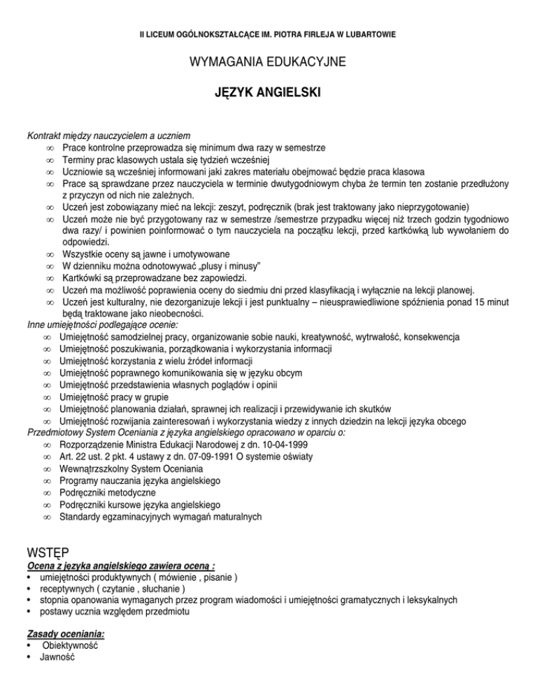 II LICEUM OGÓLNOKSZTAŁCĄCE IM. PIOTRA FIRLEJA W LUBARTOWIE WYMAGANIA EDUKACYJNE JĘZYK ANGIELSKI Kontrakt między nauczycielem a uczniem • Prace kontrolne przeprowadza się minimum dwa razy w semestrze • Terminy prac klasowych ustala się tydzień wcześniej • Uczniowie są wcześniej informowani jaki zakres materiału obejmować będzie praca klasowa • Prace są sprawdzane przez nauczyciela w terminie dwutygodniowym chyba Ŝe termin ten zostanie przedłuŜony z przyczyn od nich nie zaleŜnych. • Uczeń jest zobowiązany mieć na lekcji: zeszyt, podręcznik (brak jest traktowany jako nieprzygotowanie) • Uczeń moŜe nie być przygotowany raz w semestrze /semestrze przypadku więcej niŜ trzech godzin tygodniowo dwa razy/ i powinien poinformować o tym nauczyciela na początku lekcji, przed kartkówką lub wywołaniem do odpowiedzi. • Wszystkie oceny są jawne i umotywowane • W dzienniku moŜna odnotowywać „plusy i minusy” • Kartkówki są przeprowadzane bez zapowiedzi. • Uczeń ma moŜliwość poprawienia oceny do siedmiu dni przed klasyfikacją i wyłącznie na lekcji planowej. • Uczeń jest kulturalny, nie dezorganizuje lekcji i jest punktualny – nieusprawiedliwione spóźnienia ponad 15 minut będą traktowane jako nieobecności. Inne umiejętności podlegające ocenie: • Umiejętność samodzielnej pracy, organizowanie sobie nauki, kreatywność, wytrwałość, konsekwencja • Umiejętność poszukiwania, porządkowania i wykorzystania informacji • Umiejętność korzystania z wielu źródeł informacji • Umiejętność poprawnego komunikowania się w języku obcym • Umiejętność przedstawienia własnych poglądów i opinii • Umiejętność pracy w grupie • Umiejętność planowania działań, sprawnej ich realizacji i przewidywanie ich skutków • Umiejętność rozwijania zainteresowań i wykorzystania wiedzy z innych dziedzin na lekcji języka obcego Przedmiotowy System Oceniania z języka angielskiego opracowano w oparciu o: • Rozporządzenie Ministra Edukacji Narodowej z dn. 10-04-1999 • Art. 22 ust. 2 pkt. 4 ustawy z dn. 07-09-1991 O systemie oświaty • Wewnątrzszkolny System Oceniania • Programy nauczania języka angielskiego • Podręczniki metodyczne • Podręczniki kursowe języka angielskiego • Standardy egzaminacyjnych wymagań maturalnych WSTĘP Ocena z języka angielskiego zawiera oceną : • umiejętności produktywnych ( mówienie , pisanie ) • receptywnych ( czytanie , słuchanie ) • stopnia opanowania wymaganych przez program wiadomości i umiejętności gramatycznych i leksykalnych • postawy ucznia względem przedmiotu Zasady oceniania: • Obiektywność • Jawność • Uzasadnienie wystawionej oceny - Mobilizacja ucznia do dalszej pracy - wskazywanie zakresu wiadomości i umiejętności, które wymagają dalszych ćwiczeń i uzupełnienia Rodzaje oceniania: • Kontrola bieŜąca - w trakcie procesu kształcenia • Kontrola końcowa - dotyczy zakończonego etapu kształcenia • Kontrola dystansowa - badanie trwałości wyników nauczania po pewnym czasie Metody oceniania: • Konwencjonalna metoda bieŜąca , praca pisemna , praca z tekstem , ćwiczenia praktyczne , obserwacja uczniów w toku ich pracy • Techniczne metody kontroli procesu dydaktycznego - kontrola i ocena przy pomocy zróŜnicowanych zadań testowych Formy oceniania: • Wypowiedź ustna • Pisemne prace kontrolne ( minimum dwa razy w semestrze ), sprawdzane przez nauczyciela w czasie dwóch tygodni, do wglądu uczniów i Ich Rodziców na Ŝyczenie • Praca domowa • Kartkówki z materiału trzech ostatnich lekcji • Sprawdziany umiejętności rozumienia ze słuchu • Sprawdziany umiejętności rozumienia tekstu pisanego KRYTERIA OCENIANIA Struktury leksykalno-gramatyczne i funkcje językowe obowiązujące w poszczególnych klasach podają programy nauczania oraz rozkłady materiałów nauczania obowiązujące w poszczególnych typach szkół. OCENA CELUJĄCA Słuchanie: Uczeń: • Bezbłędnie rozumie róŜnorodne wypowiedzi ustne odtwarzane z taśmy, co najwyŜej dwukrotnie (monologi, dialogi, rozmowy), o poziomie wykraczającym poza zakres określony w programie nauczania. • Potrafi wydobyć z nich informacje kluczowe i szczegółowe bez pomocy słownika. • Potrafi bezbłędnie rozpoznać uczucia i reakcje osób mówiących. • Bezbłędnie rozumie polecenia nauczyciela i wypowiedzi kolegów związane z tematyką i przebiegiem lekcji. • Potrafi poprawić błędy popełnione przez kolegów • Poszukuje kontaktu z językiem przez słuchanie i oglądanie programów anglojęzycznych w mediach. Czytanie: Uczeń: • Bezbłędnie rozumie teksty o poziomie wykraczającym poza zakres określony w programie nauczania. • Udziela bezbłędnych, płynnych i swobodnych odpowiedzi na pytania dotyczące przeczytanego tekstu. • Umie streścić bezbłędnie przeczytany tekst. • Odpowiedzi charakteryzują się bogactwem struktur gramatycznych i leksykalnych wykraczającym poza zakres określony w programie nauczania. • Odpowiedzi charakteryzuje całkowita poprawność językowa (intonacja, wymowa, struktury gramatyczne i leksykalne). • Potrafi korzystać ze słowników jednojęzycznych • Korzysta z materiałów dodatkowych ( ćwiczenia gramatyczne i leksykalne, testy itp.) • Poszukuje kontaktu z językiem poprzez czytanie prasy i literatury anglojęzycznej. Pisanie: Praca pisemna wykazuje się: • Zgodnością z tematem • Wielostronnym i oryginalnym ujęciem tematu • Konsekwencją w przestrzeganiu określonej konwencji (formalnej lub nieformalnej) • Kompozycją: planową logiczną spójną i harmonijną • Objętością zgodną z poleceniem • Bogactwem gramatycznym i leksykalnym • Bogactwem składni • DuŜą znajomością realiów i ich przekazem • UŜyciem idiomów • Drobnymi, sporadycznymi błędami nie zakłócającymi komunikacji • Nielicznymi błędami w pisowni i interpunkcji nie zmieni