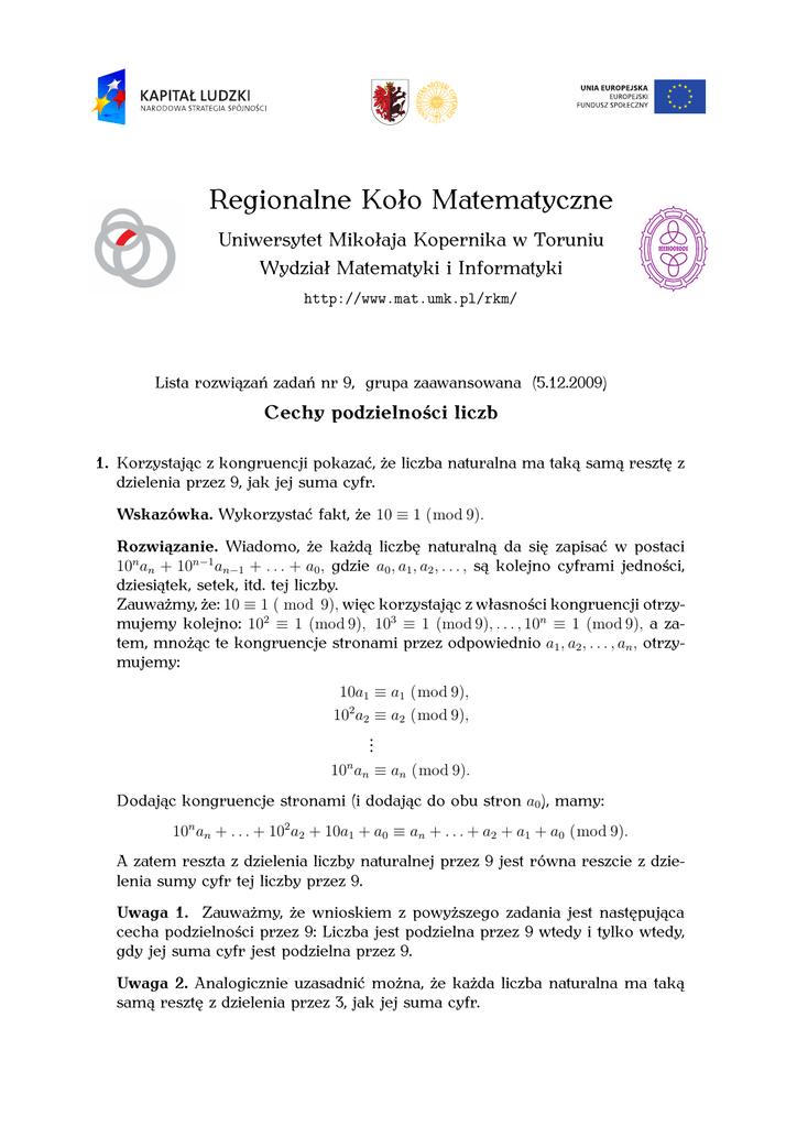 Regionalne Koło Matematyczne Uniwersytet Mikołaja Kopernika w Toruniu Wydział Matematyki i Informatyki http://www.mat.umk.pl/rkm/ Lista rozwiązań zadań nr 9, grupa zaawansowana (5.12.2009) Cechy podzielności liczb 1. Korzystając z kongruencji pokazać, że liczba naturalna ma taką samą resztę z dzielenia przez 9, jak jej suma cyfr. Wskazówka. Wykorzystać fakt, że 10 ≡ 1 (mod 9). Rozwiązanie. Wiadomo, że każdą liczbę naturalną da się zapisać w postaci 10n an + 10n−1 an−1 + . . . + a0 , gdzie a0 , a1 , a2 , . . . , są kolejno cyframi jedności, dziesiątek, setek, itd. tej liczby. Zauważmy, że: 10 ≡ 1 ( mod 9), więc korzystając z własności kongruencji otrzymujemy kolejno: 102 ≡ 1 (mod 9), 103 ≡ 1 (mod 9), . . . , 10n ≡ 1 (mod 9), a zatem, mnożąc te kongruencje stronami przez odpowiednio a1 , a2 , . . . , an , otrzymujemy: 10a1 ≡ a1 (mod 9), 102 a2 ≡ a2 (mod 9), .. . n 10 an ≡ an (mod 9). Dodając kongruencje stronami (i dodając do obu stron a0 ), mamy: 10n an + . . . + 102 a2 + 10a1 + a0 ≡ an + . . . + a2 + a1 + a0 (mod 9). A zatem reszta z dzielenia liczby naturalnej przez 9 jest równa reszcie z dzielenia sumy cyfr tej liczby przez 9. Uwaga 1. Zauważmy, że wnioskiem z powyższego zadania jest następująca cecha podzielności przez 9: Liczba jest podzielna przez 9 wtedy i tylko wtedy, gdy jej suma cyfr jest podzielna przez 9. Uwaga 2. Analogicznie uzasadnić można, że każda liczba naturalna ma taką samą resztę z dzielenia przez 3, jak jej suma cyfr. 2. Korzystając z kongruencji pokazać, że liczba naturalna 10n an + . . . + 102 a2 + 10a1 + a0 daje taką samą resztę z dzielenia przez 11, jak liczba a0 − a1 + a2 − . . . + (−1)n an . Wskazówka. Wykorzystać fakt, że 10 ≡ −1 (mod 11). Rozwiązanie. Zauważmy, że: 10 ≡ −1 (mod 11), więc korzystając z własności kongruencji otrzymujemy kolejno: 102 ≡ 1 mod (11), 3 n n 10 ≡ −1 (mod 11), . . . , 10 ≡ (−1) (mod 11), a zatem, mnożąc te kongruencje stronami przez odpowiednio a1 , a2 , . . . , an , otrzymujemy: 10a1 ≡ −a1 (mod 11), 102 a2 ≡ a2 (mod 11), .. . n 10 an ≡ (−1)n an (mod 11). Dodając kongruencje stronami (i dodając do obu stron a0 ), mamy: 10n an + . . . + 102 a2 + 10a1 + a0 ≡ (−1)n an + . . . + a2 − a1 + a0 (mod 11). Otrzymaliśmy w ten sposób cechę podzielności przez 11: liczba jest podzielna przez 11 wtedy i tylko wtedy, gdy jej naprzemienna suma cyfr jest podzielna przez 11. 3. Niech n = 2009! = 1 · 2 · . . . · 2009. Obliczamy sumę cyfr tej liczby, następnie sumę cyfr otrzymanej w ten sposób liczby i tak dalej, aż otrzymamy liczbę jednocyfrową. Jaka to liczba? Wskazówka. Co można powiedzieć o reszcie z dzielenia tej liczby przez 9? Rozwiązanie. Zauważmy, że liczba 2009! jest podzielna przez 9, bo jest iloczynem czynników, wśród których występuje liczba 9. Korzystając z cechy podzielności przez 9 otrzymujemy, że również suma cyfr tej liczby jest podzielna przez 9, a także suma cyfr tej sumy i tak dalej. Ostatnia z otrzymanych liczb również musi być podzielna przez 9. Jest to liczba jednocyfrowa i różna od zera, więc jest to 9. 4. Niech A = 44444444 , zaś B jest sumą cyfr liczby A, C jest sumą cyfr liczby B i D jest sumą cyfr liczby C. Ile wynosi D? Wskazówka. Jaka jest reszta z dzielenia liczby A przez 9? Jak można oszacować, ile cyfr ma liczba A? Rozwiązanie. Korzystając z własności, że liczba naturalna daje taką samą resztę z dzielenia przez 9, jak jej suma cyfr, otrzymujemy, że 4444 ≡ 16 (mod 9), czyli 4444 ≡ 7 (mod 9). Stąd 44442 ≡ 4 (mod 9) oraz 44443 ≡ 1 (mod 9). Podnosząc obie strony ostatniej kongruencji do potęgi 1481, otrzymujemy, że 44444443 ≡ 1 (mod 9), zatem mnożąc stronami odpowiednie kongruencje mamy: 44444444 = 44444443 · 4444 ≡ 1 · 7 (mod 9). Zauważmy ponadto, że A < 100004444 = 103·4444 , zatem liczba A ma najwyżej 3 · 4444 cyfr. Każda z tych cyfr jest mniejsza lub równa 9, więc ich suma, czyli liczba B wynosi najwyżej 119988. Liczba B jest zatem sześciocyfrowa, więc jej suma cyfr, czyli liczba C, wynosi najwyżej 9 · 6, czyli 54. Aby oszacować sumę cyfr liczby C zauważmy teraz, że wśród liczb naturalnych mniejszych, lub równych 56, największą sumę cyfr, równą 13, ma liczba 49. Ostatecznie otrzymaliśmy więc, że D ¬ 13. Wśród liczb, które dają resztę 7 z dzielenia przez 9 jest tylko jedna liczba mniejsza lub równa niż 13. Zatem D = 7. 5. Czy istnieją dwie kolejne liczby naturalne, których sumy cyfr są podzielne przez 7? Wskazówka. Rozważyć, jaka może być cyfra jedności mniejszej z szukanych liczb. Rozwiązanie. Wykażemy, że takie liczby istnieją. Zauważmy, że jeżeli a i a + 1 są szukanymi liczbami, to cyfrą jedności liczby a musi być 9, gdyż w innym wypadku suma cyfr liczb a i a + 1 różniłaby się tylko o 1. Zatem liczby a będziemy szukać wśród liczb, których n ostatnich cyfr to dziewiątki. Zauważmy, że w takiej sytuacji różnica sumy cyfr liczby a i liczby a + 1 wynosi 9n − 1. Aby ta różnica była podzielna przez 7, liczba n powinna dawać resztę 4 z dzielenia przez 7 (łatwo to sprawdzić, rozważając możliwe reszty z dzielenia przez 7 liczby n). Taką liczbą jest na przykład 4. Zauważmy, że para liczb 159999, 160000 spełnia warunki zadania. Ponadto widać, że takich par jest nieskończenie wiele - z każdej pary liczb spełniającej warunki zadania możemy utworzyć kolejną, dopisując na końcu liczby a siedem dziewiątek, zaś na końcu liczby a + 1 siedem zer. 6. Udowodnić, że (a) 2011 | 1 · 3 · 5 · . . . · 2009 + 2 · 4 · 6 · . . . · 2010, (b) 2009 | 1 · 3 · 5 · . . . · 2007 − 2 · 4 · 6 · . . . · 2008. Wskazówka. (a) Zauważmy, że k ≡ −(2011 − k) (mod 2011) dla każdego k = 1, 3, . . . , 2009. (b) Zauważmy, że k ≡ −(2009 − k) (mod 2009) dla każdego k = 1, 3, . . . , 2007. Rozwiązanie. (a) Zauważmy, że: 1 ≡ 