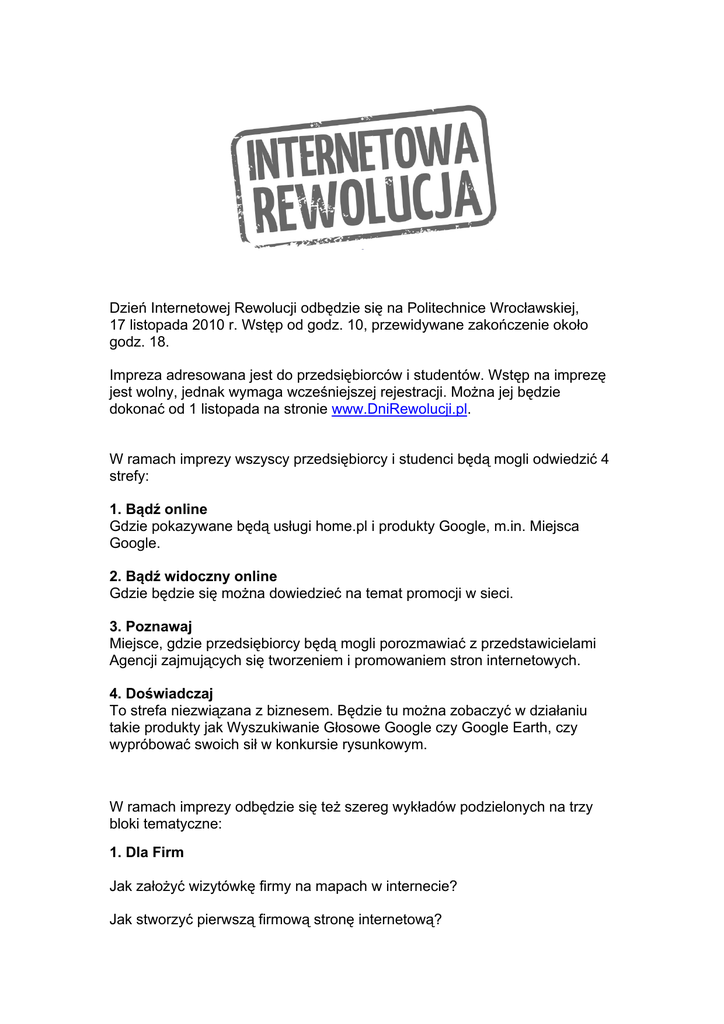 Dzień Internetowej Rewolucji odbędzie się na Politechnice Wrocławskiej, 17 listopada 2010 r. Wstęp od godz. 10, przewidywane zakończenie około godz. 18. Impreza adresowana jest do przedsiębiorców i studentów. Wstęp na imprezę jest wolny, jednak wymaga wcześniejszej rejestracji. Można jej będzie dokonać od 1 listopada na stronie www.DniRewolucji.pl. W ramach imprezy wszyscy przedsiębiorcy i studenci będą mogli odwiedzić 4 strefy: 1. Bądź online Gdzie pokazywane będą usługi home.pl i produkty Google, m.in. Miejsca Google. 2. Bądź widoczny online Gdzie będzie się można dowiedzieć na temat promocji w sieci. 3. Poznawaj Miejsce, gdzie przedsiębiorcy będą mogli porozmawiać z przedstawicielami Agencji zajmujących się tworzeniem i promowaniem stron internetowych. 4. Doświadczaj To strefa niezwiązana z biznesem. Będzie tu można zobaczyć w działaniu takie produkty jak Wyszukiwanie Głosowe Google czy Google Earth, czy wypróbować swoich sił w konkursie rysunkowym. W ramach imprezy odbędzie się też szereg wykładów podzielonych na trzy bloki tematyczne: 1. Dla Firm Jak założyć wizytówkę firmy na mapach w internecie? Jak stworzyć pierwszą firmową stronę internetową? Jak stworzyć pierwszą kampanię reklamową w wyszukiwarce? Jak stworzyć efektywną kampanię reklamową w wyszukiwarce? Jak reklamować się w najpopularniejszym serwisie wideo? 2. Dla Studentów Jak wygląda praca inżyniera w Google? Google jako pracodawca. Kultura, wartości firmy, rekrutacja Jak studenci mogą wesprzeć Internetową Rewolucję w swoim mieście Konkurs 3. Dla Wszystkich (Media, Firmy, Studenci) 10 rzeczy, których nie wiesz o wyszukiwarce Ty plus Internet to więcej niż przypuszczasz Majority Report - badania internetu ROI, CPC, CTR - o co chodzi? Reklama w internecie Aktualne informacje o imprezie będą dostępne od 1 listopada na stronie internetowej www.DniRewolucji.pl . Konferencja prasowa, w które wezmą udział przedstawiciele uczelni, urzędu miasta i organizatorów odbędzie się w dniu imprezy o godz. 11. ### Internetowa Rewolucja to akcja mająca na celu zachęcenie polskich przedsiębiorców do aktywnej obecności w internecie. Organizatorami akcji są Google, Polska Konfederacja Pracodawców Prywatnych Lewiatan i home.pl, patronat objęło Ministerstwo Gospodarki. W ramach Internetowej Rewolucji każda mała i średnia firma w Polsce może za darmo zarejestrować adres internetowy (domenę), stworzyć pierwszą stronę internetową, umieścić wizytówkę na internetowych mapach, wypróbować kampanię reklamową w sieci oraz dowiedzieć się więcej o obecności online i efektywnym wykorzystaniu internetu w swojej działalności. Dzięki darmowemu pakietowi startowemu, wszystkie małe i średnie firmy w Polsce mogą zaistnieć w internecie nic nie ryzykujac i nic nie płacąc. Więcej informacji udzielają: Tomasz Jaros [email protected] +48 605 454 096 Paweł Radzimski [email protected] +48 607 104 289