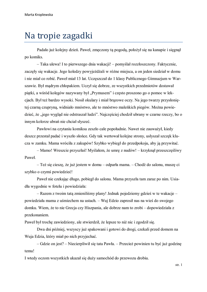 Marta Kroplewska Na tropie zagadki Padało już kolejny dzień. Paweł, zmęczony tą pogodą, położył się na kanapie i sięgnął po komiks. – Taka ulewa! I to pierwszego dnia wakacji! – pomyślał rozzłoszczony. Faktycznie, zaczęły się wakacje. Jego koledzy powyjeżdżali w różne miejsca, a on jeden siedział w domu i nie miał co robić. Paweł miał 13 lat. Uczęszczał do 1 klasy Publicznego Gimnazjum w Warszawie. Był mądrym chłopakiem. Uczył się dobrze, ze wszystkich przedmiotów dostawał piątki, a wśród kolegów nazywany był „Prymusem” i często proszono go o pomoc w lekcjach. Był też bardzo wysoki. Nosił okulary i miał brązowe oczy. Na jego twarzy przysłoniętej czarną czupryną, widniało mnóstwo, ale to mnóstwo maleńkich piegów. Można powiedzieć, że „jego wygląd nie odstraszał ludzi”. Najczęściej chodził ubrany w czarne rzeczy, bo o innym kolorze ubrań nie chciał słyszeć. Pawłowi na czytaniu komiksu zeszło całe popołudnie. Nawet nie zauważył, kiedy deszcz przestał padać i wyszło słońce. Gdy tak wertował kolejne strony, usłyszał szczęk klucza w zamku. Mama wróciła z zakupów! Szybko wybiegł do przedpokoju, aby ją przywitać. – Mamo! Wreszcie przyszłaś! Myślałem, że umrę z nudów! – krzyknął przeszczęśliwy Paweł. – Też się cieszę, że już jestem w domu – odparła mama. – Chodź do salonu, muszę ci szybko o czymś powiedzieć! Paweł nie czekając długo, pobiegł do salonu. Mama przyszła tam zaraz po nim. Usiadła wygodnie w fotelu i powiedziała: – Razem z twoim tatą zmieniliśmy plany! Jednak pojedziemy gdzieś w te wakacje – powiedziała mama z uśmiechem na ustach. – Wuj Edzio zaprosił nas na wieś do swojego domku. Wiem, że to nie Grecja czy Hiszpania, ale dobrze nam to zrobi – dopowiedziała z przekonaniem. Paweł był trochę zawiedziony, ale stwierdził, że lepsze to niż nic i zgodził się. Dwa dni później, wszyscy już spakowani i gotowi do drogi, czekali przed domem na Wuja Edzia, który miał po nich przyjechać. – Gdzie on jest? – Niecierpliwił się tata Pawła. – Przecież powinien tu być już godzinę temu! I wtedy oczom wszystkich ukazał się duży samochód do przewozu drobiu. str. 1 Marta Kroplewska – Witojcie! To jo, wuj, wsiodojcie! – krzyknął wuj przez otwarte okno samochodu. Gdy rodzina już zapakowała się w całości do pojazdu, nareszcie wyruszyli. Paweł był bardzo podekscytowany. Nigdy jeszcze nie był na wsi. Nie minęły 2 godziny, a już byli na miejscu. Oczom rodziny ukazała się drewniana chałupka, kurnik, chlewik i stajnia. Zaraz obok rozciągał się lasek, i kilka kwiecistych łąk. Paweł był zachwycony nowopoznanym miejscem. Nie wiedział przecież, co go tu spotka. Może przeżyje jakąś przygodę? Wszyscy wysiedli z auta, i rozejrzeli się. Wdychali czyste, leśne powietrze i cieszyli się krajobrazem. – Jak tu pięknie! – powiedziała zgodnie cała rodzinka. – Ten tydzień będzie cudowny! Następnego dnia Paweł wybrał się na spacer. Chciał lepiej poznać okolicę. Gdy tak szedł sobie i szedł, nagle zobaczył chłopca. Miał on ok. 14 lat. Tak jak Paweł! Podszedł do niego i zapytał: – Hej, jak masz na imię? Chłopiec z entuzjazmem odpowiedział: – Ja Bartek, a ty? – Ja mam na imię Paweł – odparł. – Przyjechałem tu z rodzicami, do wuja na wakacje. Paweł z Bartkiem usiedli na trawie i opowiedzieli sobie swoje historie. Okazało się, że Bartek też mieszka w Warszawie, tylko dwie ulice dalej od Pawła! – To niesamowite, że nigdy wcześniej się nie spotkaliśmy! – z uśmiechem powiedział Paweł. – No, to naprawdę dziwne. – odparł Bartek. – A słyszałeś o skarbie? Paweł nie uwierzył, w to co usłyszał! – O jakim skarbie? – zapytał zdziwiony. – O tym, co jest ukryty w tej wsi. Legenda głosi, że tylko ukryta mapa wskaże drogę do skarbu – odpowiedział Bartek. – Co, nie wiedziałeś o tym? W tamtej chwili Paweł wiedział, że musi odnaleźć skarb, a z pomocą Bartka znajdzie go na pewno szybciej i umili mu to czas na wsi. – To na co czekamy? Spotkajmy się tu jutro o 12: 30 i rozpoczniemy poszukiwania! – krzyknął Paweł. – Zgoda. Jutro, tutaj o 12:30 – zgodził się Bartek. Wstali, podali sobie ręce na do widzenia i poszli, każdy w swoją stronę. str. 2 Marta Kroplewska Następnego dnia Paweł przyszedł w ustalone miejsce już o 12:10, lecz ku jego zdziwieniu Bartek już na niego czekał. – To co, rozpoczynamy szukanie skarbu? – zapytał Paweł. – Tak! A mamy jakieś wskazówki? – odparł Bartek. – Rozmawiałem wczoraj z moim wujem, i opowiedział mi trochę o tym skarbie. Powiedział, że to skarb, który może odmienić czyjeś życie. Dał mi też wskazówkę: „Idź dwa kroki na północ od miejsca, w którym się znajdujesz, a ujrzysz jezioro. Podejdź do brzegu, a zobaczysz szereg drzew. W pierwszym drzewie po twojej prawej stronie znajdziesz pierwszą wskazówkę do skarbu” – odpowiedział Paweł. Obaj chłopcy zrobili wszystko zgodnie z instrukcją wuja. Gdy doszli już do drzewa, wyjęli pierwszą karteczkę. Był na niej rysunek przedstawiający pałki wodne. – Acha! Pałki wodne! Czyli już wiemy gdzie jest następna kartka! – zawołał Bartek. Obiegli jezioro i faktycznie, znaleźli tam drugą karteczkę. Tym razem widniał na niej rysunek placu zabaw. – Plac zabaw? Nic nie rozumiem… – zdziwił się Paweł. – A ja przeciwnie. To plac zabaw przy pobliskiej szkole. Pewnie tam jest następna karteczka! – odparł z zapałem Bartek. I nie pomylił się. Na drabinkach znaleźli kolejny rysunek. Tym razem widok był niezrozumiały. – Co to? – zapytał Pawła Bartek. – To przecież podwórko mojego wuja! Poznaję ten kurnik i domek! – zawołał Paweł. Pobiegli szybko na podwórko i zastali wychodzącego wuja. – Ło! Dzieci się znalazły! Tego szukocie? – zawołał wuj wyciągając ku n