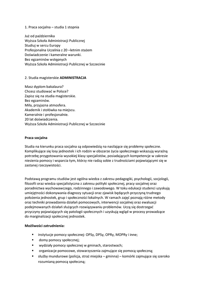 1. Praca socjalna – studia 1 stopnia Już od października Wyższa Szkoła Administracji Publicznej Studiuj w sercu Europy Profesjonalna Uczelnia z 20 –letnim stażem Doświadczenie i kameralne warunki. Bez egzaminów wstępnych Wyższa Szkoła Administracji Publicznej w Szczecinie 2. Studia magisterskie ADMINISTRACJA Masz dyplom bakalaura? Chcesz studiować w Polsce? Zapisz się na studia magisterskie. Bez egzaminów. Miła, przyjazna atmosfera. Akademik i stołówka na miejscu. Kameralnie i profesjonalnie. 20 lat doświadczenia. Wyższa Szkoła Administracji Publicznej w Szczecinie Praca socjalna Studia na kierunku praca socjalna są odpowiedzią na nasilające się problemy społeczne. Komplikujące się losy jednostek i ich rodzin w obszarze życia społecznego wskazują wyraźną potrzebę przygotowania wysokiej klasy specjalistów, posiadających kompetencje w zakresie niesienia pomocy i wsparcia tym, którzy nie radzą sobie z trudnościami pojawiającymi się w zastanej rzeczywistości. Podstawą programu studiów jest ogólna wiedza z zakresu pedagogiki, psychologii, socjologii, filozofii oraz wiedza specjalistyczna z zakresu polityki społecznej, pracy socjalnej oraz poradnictwa wychowawczego, rodzinnego i zawodowego. W toku edukacji studenci uzyskują umiejętności dokonywania diagnozy sytuacji oraz zjawisk będących przyczyną trudnego położenia jednostek, grup i społeczności lokalnych. W ramach zajęć poznają różne metody oraz techniki prowadzenia działań pomocowych, interwencji socjalnej oraz ewaluacji podejmowanych działań służących rozwiązywaniu problemów. Uczą się dostrzegać przyczyny pojawiających się patologii społecznych i uzyskują wgląd w procesy prowadzące do marginalizacji społecznej jednostek. Możliwości zatrudnienia: instytucje pomocy społecznej: OPSy, DPSy, OPRy, MOPRy i inne; domy pomocy społecznej; wydziały pomocy społecznej w gminach, starostwach; organizacje pomocowe, stowarzyszenia zajmujące się pomocą społeczną; służby mundurowe (policja, straż miejska – gminna) – komórki zajmujące się szeroko rozumianą pomocą społeczną; ośrodki interwencji kryzysowej; ośrodki opieki długoterminowej nad osobami niesprawnymi; ośrodki opieki domowej; zakłady opieki zdrowotnej i medycznej dla osób starszych i przewlekle chorych; sanatoria, szpitale, hospicja; ośrodki organizacji czasu wolnego seniorów (kluby seniora, dzienne domy pobytu); miejsca terapii zajęciowej; świetlice środowiskowe; placówki dla osób bezdomnych, uzależnionych; ośrodki dla cudzoziemców Tytuł zawodowy uzyskiwany przez absolwenta - licencjat Specjalności: 1. Praca socjalna w pomocy społecznej 2. Opieka nad osobami starszymi Studia magisterskie – administracja (II stopnia) Program studiów na kierunku administracja – studia magisterskie – odpowiada na potrzeby rynku pracy. Powstał we współpracy z samorządowcami i kardą administracji, tak aby spełnić zapotrzebowania samorządów i administracji szczebla rządowego w zakresie profesjonalnej kadry urzędniczej. Program obejmuje przedmioty kierunkowe i podstawowe oraz moduły specjalnościowe. Program został tak pomyślany, aby dać jak najwięcej praktycznej wiedzy studentom. Tytuł zawodowy uzyskiwany przez absolwenta – magister Wybierz Administrację bo: 1. Praca w administracji to praca stabilna 2. Praca w administracji jest rozwojowa 3. Praca w administracji nie jest nudna 4. Praca w administracji to stabilny i rzetelny pracodawca 5. Praca w administracji to wyzwania w zmieniającym się świecie 6. Praca w administracji to średnie zarobki ponad 4300 zł miesięcznie 7. Praca w administracji to praca dla ludzi i z ludźmi 8. Praca w administracji to zmienianie swojego otoczenia 9. Praca w administracji to ciągłe doskonalenie się 10. Praca w administracji daje dużo satysfakcji Możliwości zatrudnienia: instytucje administracji rządowej i samorządowej; wymiar sprawiedliwości (sądy, prokuratura); służby mundurowe; instytucje i urzędy w krajach Unii Europejskiej; prywatne instytucje i firmy – działy administracji