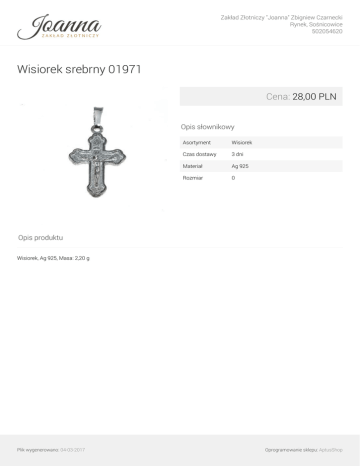 Zakład Złotniczy "Joanna" Zbigniew Czarnecki Rynek, Sośnicowice 502054620 Wisiorek srebrny 01971 Cena: 28,00 PLN Opis słownikowy Asortyment Wisiorek Czas dostawy 3 dni Materiał Ag 925 Rozmiar 0 Opis produktu Wisiorek, Ag 925, Masa: 2,20 g Plik wygenerowano: 04-03-2017 Powered by TCPDF (www.tcpdf.org) Oprogramowanie sklepu: AptusShop