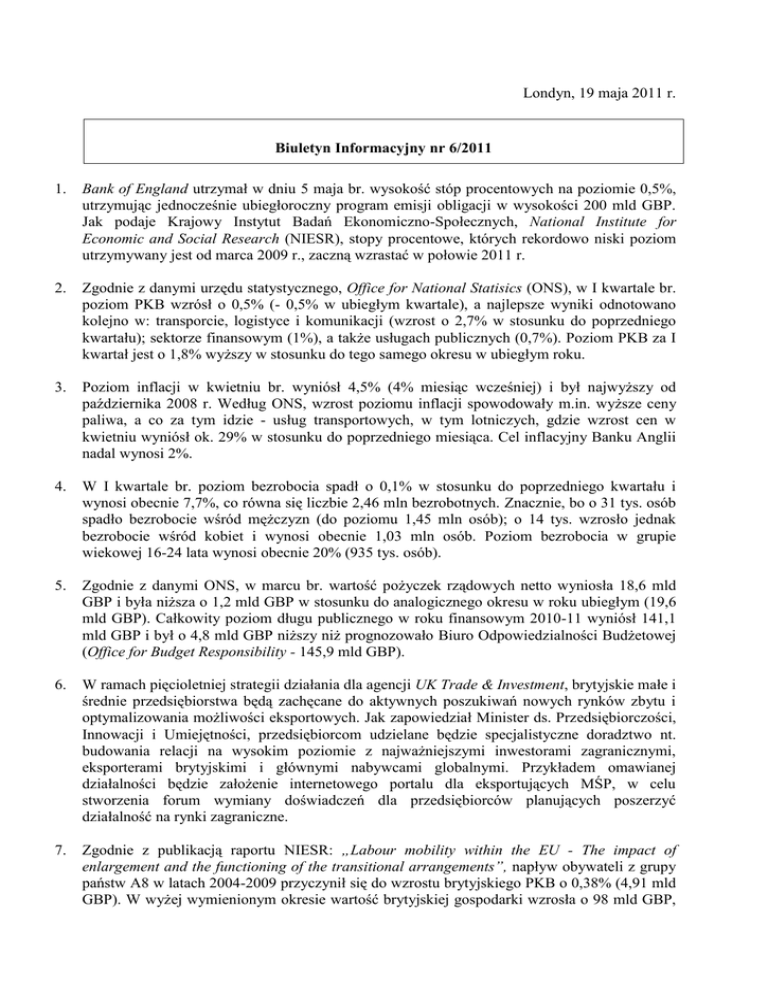 Londyn, 19 maja 2011 r. Biuletyn Informacyjny nr 6/2011 1. Bank of England utrzymał w dniu 5 maja br. wysokość stóp procentowych na poziomie 0,5%, utrzymując jednocześnie ubiegłoroczny program emisji obligacji w wysokości 200 mld GBP. Jak podaje Krajowy Instytut Badań Ekonomiczno-Społecznych, National Institute for Economic and Social Research (NIESR), stopy procentowe, których rekordowo niski poziom utrzymywany jest od marca 2009 r., zaczną wzrastać w połowie 2011 r. 2. Zgodnie z danymi urzędu statystycznego, Office for National Statisics (ONS), w I kwartale br. poziom PKB wzrósł o 0,5% (- 0,5% w ubiegłym kwartale), a najlepsze wyniki odnotowano kolejno w: transporcie, logistyce i komunikacji (wzrost o 2,7% w stosunku do poprzedniego kwartału); sektorze finansowym (1%), a także usługach publicznych (0,7%). Poziom PKB za I kwartał jest o 1,8% wyższy w stosunku do tego samego okresu w ubiegłym roku. 3. Poziom inflacji w kwietniu br. wyniósł 4,5% (4% miesiąc wcześniej) i był najwyższy od października 2008 r. Według ONS, wzrost poziomu inflacji spowodowały m.in. wyższe ceny paliwa, a co za tym idzie - usług transportowych, w tym lotniczych, gdzie wzrost cen w kwietniu wyniósł ok. 29% w stosunku do poprzedniego miesiąca. Cel inflacyjny Banku Anglii nadal wynosi 2%. 4. W I kwartale br. poziom bezrobocia spadł o 0,1% w stosunku do poprzedniego kwartału i wynosi obecnie 7,7%, co równa się liczbie 2,46 mln bezrobotnych. Znacznie, bo o 31 tys. osób spadło bezrobocie wśród mężczyzn (do poziomu 1,45 mln osób); o 14 tys. wzrosło jednak bezrobocie wśród kobiet i wynosi obecnie 1,03 mln osób. Poziom bezrobocia w grupie wiekowej 16-24 lata wynosi obecnie 20% (935 tys. osób). 5. Zgodnie z danymi ONS, w marcu br. wartość pożyczek rządowych netto wyniosła 18,6 mld GBP i była niższa o 1,2 mld GBP w stosunku do analogicznego okresu w roku ubiegłym (19,6 mld GBP). Całkowity poziom długu publicznego w roku finansowym 2010-11 wyniósł 141,1 mld GBP i był o 4,8 mld GBP niższy niż prognozowało Biuro Odpowiedzialności Budżetowej (Office for Budget Responsibility - 145,9 mld GBP). 6. W ramach pięcioletniej strategii działania dla agencji UK Trade & Investment, brytyjskie małe i średnie przedsiębiorstwa będą zachęcane do aktywnych poszukiwań nowych rynków zbytu i optymalizowania możliwości eksportowych. Jak zapowiedział Minister ds. Przedsiębiorczości, Innowacji i Umiejętności, przedsiębiorcom udzielane będzie specjalistyczne doradztwo nt. budowania relacji na wysokim poziomie z najważniejszymi inwestorami zagranicznymi, eksporterami brytyjskimi i głównymi nabywcami globalnymi. Przykładem omawianej działalności będzie założenie internetowego portalu dla eksportujących MŚP, w celu stworzenia forum wymiany doświadczeń dla przedsiębiorców planujących poszerzyć działalność na rynki zagraniczne. 7. Zgodnie z publikacją raportu NIESR: „Labour mobility within the EU - The impact of enlargement and the functioning of the transitional arrangements”, napływ obywateli z grupy państw A8 w latach 2004-2009 przyczynił się do wzrostu brytyjskiego PKB o 0,38% (4,91 mld GBP). W wyżej wymienionym okresie wartość brytyjskiej gospodarki wzrosła o 98 mld GBP, w tym, zdaniem NIESR, blisko 5% (4,9 mld GBP), stanowił udział obcokrajowców z grupy państw A8. Według raportu, w okresie pierwszych pięciu lat od rozszerzenia UE w 2004 r., do Wielkiej Brytanii przybyło 1,5 mln obcokrajowców z nowych państw członkowskich, z czego 700 tys. z Polski, przy czym 500 tys. Polaków osiadło tu na stałe. Raport NIESR stwierdza jednocześnie, że dzięki napływowi do WB pracowników z grupy państw A8, wydajność pracy w w/w okresie zwiększyła się o 0,95%, natomiast przyrost PKB był proporcjonalny do wzrostu populacji. 8. Sieć sklepów detalicznych z artykułami dla dzieci i niemowląt Mothercare poinformowała o planowanym zamknięciu 25% punktów sprzedaży w ciągu najbliższych dwóch lat, zmiany argumentując strategicznym ukierunkowaniem na sprzedaż internetową. Firma Mothercare posiada ponad 1,000 sklepów w 38 krajach, w tym 389 w Wielkiej Brytanii i 15 w Polsce. 9. Producent przemysłu zbrojeniowo-lotniczego BAE Systems został ukarany przez Departament Stanu USA grzywną w wysokości 49 mln GBP za udział w zmowie, mającej na celu zatajenie istotnych informacji nt. przepisów Ustawy o Zagranicznych Praktykach Korupcyjnych (Foreign Corrupt Practices Act). W ubiegłym roku koncern BAE Systems, który uprzednio przyznał się m.in. do zatajania wysokości prowizji dla firm lobbystycznych, wspierających działania koncernu w USA, jak i do przedstawiania fałszywych sprawozdań finansowych, został ukarany rekordową karą grzywny w wysokości 400 mln GBP za narażanie Rządu USA na straty. 10. Związki zawodowe linii lotniczych British Airways doszły do porozumienia z zarządem firmy, w wyniku którego personel pokładowy odzyska prawo do ulgowych biletów, a także gwarancję podwyżek płac w wysokości 4% w bieżącym roku i 3,5% w przyszłym roku. Ugoda między stronami kończy falę uciążliwych strajków, które w ubiegłym roku sparaliżowały kilkakrotnie m.in. londyńskie lotniska Heathrow i Gatwick na łącznie 22 dni. Straty, jakie poniosło BA z przyczyn odwołanych lotów, oszacowano na blisko 150 mln GBP.