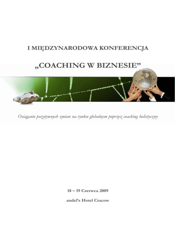 I MIĘDZYNARODOWA KONFERENCJA „COACHING W BIZNESIE” Osiąganie pozytywnych zmian na rynku globalnym poprzez coaching holistyczny 18 – 19 Czerwca 2009 andel’s Hotel Cracow Szanowni Państwo, Z ogromną przyjemnością zapraszamy do wzięcia udziału w I Międzynarodowej Konferencji „Coaching w biznesie”, która odbędzie się 18-19 czerwca 2009 w andel’s Hotel Cracow. Organizatorem konferencji jest firma szkoleniowa PERŁA Skarbnica Wiedzy i Umiejętności – twórca pierwszych w Polsce studiów podyplomowych „Coaching w biznesie” (od 2006r). Merytoryczny patronat na konferencją objęła Krakowska Szkoła Biznesu Uniwersytetu Ekonomicznego w Krakowie, w której studia są prowadzone. Tematem konferencji jest „Osiąganie pozytywnych zmian na rynku globalnym poprzez coaching holistyczny”, a gościem specjalnym międzynarodowa sława coachingu - Dr RICHARD BOLSTAD, twórca metody Komunikacji Transformacyjnej oraz modelu RESOLVE. Konferencja skierowana jest do: a) Środowiska biznesowego - prezesi, dyrektorzy, właściciele firm, kadra kierownicza wyższego i średniego szczebla oraz dyrektorzy działów HR; b) Środowiska naukowego – pracownicy naukowi uczelni wyższych, prowadzących zajęcia z zarządzania zasobami ludzkimi, z uwzględnieniem coachingu. Coaching jako narzędzie szybkiego wprowadzania zmian ze względu na swoją skuteczność, staje się w Polsce coraz bardziej popularnym narzędziem stosowanym jako forma rozwoju zawodowego w organizacjach. Porównuje się go do Efektu Motyla, gdzie poruszenie jednego elementu wywołuje reakcje łańcuchową w pozostałych ogniwach organizacji. Zmiany zachowań indywidualnych pracowników, ukształtowanie nowych nawyków i sposobu myślenia, rzutują na jakość i kierunek interakcji z całym otoczeniem organizacji, zarówno wewnętrznym, jak i zewnętrznym. Wpływa to na funkcjonowanie całego systemu środowiska biznesowego, dążąc do holistycznego jego wzrastania. Celem Konferencji jest zbudowanie świadomości uczestników, na czym polega prowadzenie przez firmę działającą na rynku globalnym coachingu w ujęciu systemowym. A także odpowiedź na pytania: jakie aspekty trzeba wziąć pod uwagę przy jego organizacji (np. różnice międzykulturowe, działania zespołowe, cele indywidualne pracowników, well-being) i jak przekłada się to na efektywność działania całego przedsiębiorstwa. W coachingu celem jest ukształtowanie nowej świadomości oraz zmiana zachowań u klienta (coachee). Stąd też konferencja zorganizowana jest zgodnie z tymi kanonami tak, aby uczestnicy mogli doświadczyć przebiegu tego procesu. Sesje plenarne konferencji prowadzone są w sposób interaktywny, dzięki czemu uczestnicy zapoznają się z treściami przedstawianymi przez prelegentów i równocześnie doświadczają elementów sesji coachingowej, takich jak: budowanie relacji, informacja zwrotna, analiza korzyści, współpraca, zmiana. Dzień zakończy wspólna gra dla wszystkich uczestników. Drugiego dnia prowadzone są warsztaty, gdzie uczestnicy poznają wybrane techniki stosowane w coachingu. Zarówno prelekcje jak i warsztaty prowadzone są przez profesjonalnych coachów. Dodatkowo w trakcie konferencji uczestnikom towarzyszą zawodowi coache, z którymi można będzie przeprowadzić jedną darmową sesję lub umówić się na sesję po konferencji, w ciągu dwóch tygodni. Ogólnie do dyspozycji oddanych jest 80 godzin darmowych sesji coachingowych. Zaplanowana jest także miła niespodzianka – losowanie interesujących nagród, w tym 3 sesje coachingowe. Zachęcamy, aby tę datę zarezerwować sobie już dziś! __________________________________________________________________________________________________ ul. Orląt Lwowskich 10/1, 31-518 Kraków, tel/fax: 0~12 413 68 71, kom. 601 477 764, e-mail: [email protected], www.perla.edu.pl PLAN KONFERENCJI I dzień- Prelekcje 9.15 – 9.30 II dzień – Warsztaty 9.00-10.30 Otwarcie konferencji 15 min 9.30 – 11.30 Coaching jako proces myślenia holistycznego Richard Bolstad 11.30-11.45 Przerwa kawowa 11.45-12.45 Powadzenie coachingu w środowisku wielokulturowym Małgorzata Klimczyk-Bryk 12.45-13.45 Coaching jako narzędzie kreowania Produktu Personalnego pracownika Maryla Moszyńska 13.45-14.45 Lunch 14.45-15.45 Coaching grupowy jako proces rozwoju zespołu Joanna Zawada Kubik 15.45-16.00 Przerwa kawowa 16.00-17.00 Wellness coaching jako systemowe narzędzie wpływające na zaangażowanie pracowników Sylwia Rogala 17.00-18.00 Jak wybrać skutecznego coacha do firmy wskazówki praktyczne Urszula Sadomska 18.00-18.30 Podsumowanie konferencji + gra zespołowa Sesja plenarna – Budowanie relacji z klientem Richard Bolstad 10.30-11.00 Przerwa kawowa 11.00-14.00 (3h) Warsztat - Grupa B Warsztat - Grupa A Zbieranie informacji „o” oraz „od” klienta Sylwia Rogala Joanna Zawada-Kubik Od wizji do działania Strategia Walta Disney”a Małgorzata Klimczyk-Bryk Urszula Sadomska 14.00-15.00 Lunch 15.00-18.00 Warsztat - Grupa B Warsztat - Grupa A Zbieranie informacji „o” oraz „od” klienta Sylwia Rogala Joanna Zawada-Kubik) Od wizji do działania Strategia Walta Disney”a Małgorzata Klimczyk-Bryk Urszula Sadomska 20.00 – 23.30 Gala Party – Klub Drukarnia __________________________________________________________________________________________________ ul. Orląt Lwowskich 10/1, 31-518 Kraków, tel/fax: 0~12 413 68 71, kom. 601 477 764, e-mail: [email protected], www.perla.edu.pl BIOGRAMY PRELEGENTÓW Dr Richard Bolstad, trener NLP i instructor Qi-gong, jest między innymi twórcą metody Transforming Communication i opartego na niej warsztatu. Stworzył model „RESOLVE”, który jest systemem integrowania setek technik NLP w jeden proces prowadzący do zmiany. Uczą się go praktycy NLP i trenerzy na całym świecie. Jego książki są używane jako podręczniki na wielu kursach oraz na różnych stopniach programów nauczania. Napisał między inny