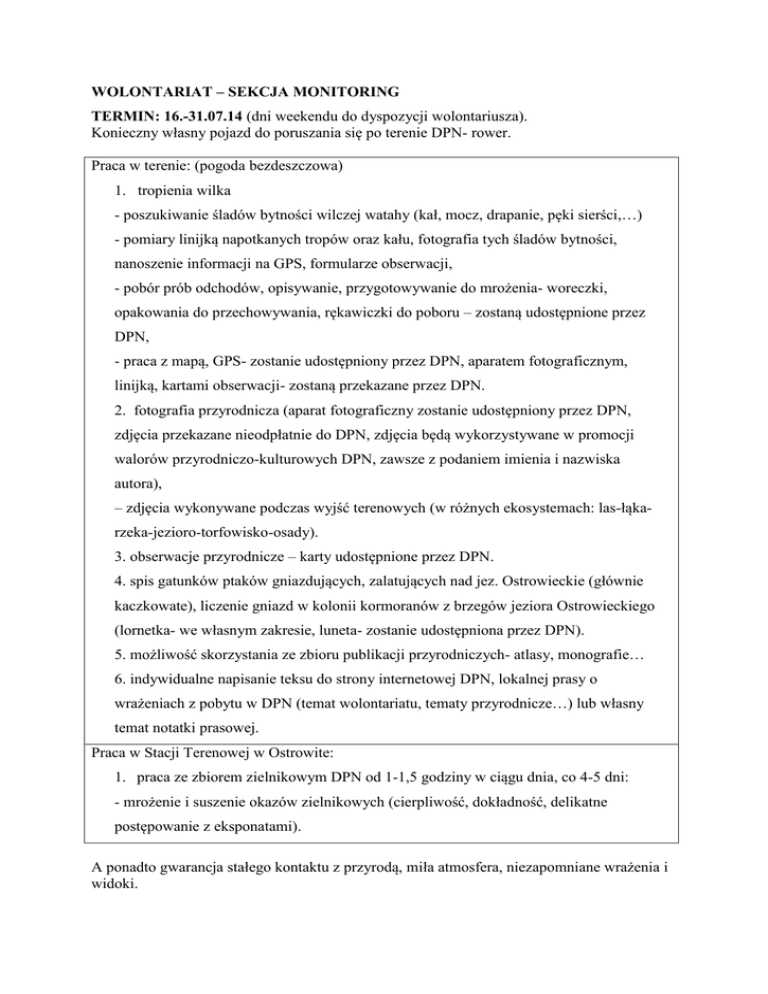 WOLONTARIAT – SEKCJA MONITORING TERMIN: 16.-31.07.14 (dni weekendu do dyspozycji wolontariusza). Konieczny własny pojazd do poruszania się po terenie DPN- rower. Praca w terenie: (pogoda bezdeszczowa) 1. tropienia wilka - poszukiwanie śladów bytności wilczej watahy (kał, mocz, drapanie, pęki sierści,…) - pomiary linijką napotkanych tropów oraz kału, fotografia tych śladów bytności, nanoszenie informacji na GPS, formularze obserwacji, - pobór prób odchodów, opisywanie, przygotowywanie do mrożenia- woreczki, opakowania do przechowywania, rękawiczki do poboru – zostaną udostępnione przez DPN, - praca z mapą, GPS- zostanie udostępniony przez DPN, aparatem fotograficznym, linijką, kartami obserwacji- zostaną przekazane przez DPN. 2. fotografia przyrodnicza (aparat fotograficzny zostanie udostępniony przez DPN, zdjęcia przekazane nieodpłatnie do DPN, zdjęcia będą wykorzystywane w promocji walorów przyrodniczo-kulturowych DPN, zawsze z podaniem imienia i nazwiska autora), – zdjęcia wykonywane podczas wyjść terenowych (w różnych ekosystemach: las-łąkarzeka-jezioro-torfowisko-osady). 3. obserwacje przyrodnicze – karty udostępnione przez DPN. 4. spis gatunków ptaków gniazdujących, zalatujących nad jez. Ostrowieckie (głównie kaczkowate), liczenie gniazd w kolonii kormoranów z brzegów jeziora Ostrowieckiego (lornetka- we własnym zakresie, luneta- zostanie udostępniona przez DPN). 5. możliwość skorzystania ze zbioru publikacji przyrodniczych- atlasy, monografie… 6. indywidualne napisanie teksu do strony internetowej DPN, lokalnej prasy o wrażeniach z pobytu w DPN (temat wolontariatu, tematy przyrodnicze…) lub własny temat notatki prasowej. Praca w Stacji Terenowej w Ostrowite: 1. praca ze zbiorem zielnikowym DPN od 1-1,5 godziny w ciągu dnia, co 4-5 dni: - mrożenie i suszenie okazów zielnikowych (cierpliwość, dokładność, delikatne postępowanie z eksponatami). A ponadto gwarancja stałego kontaktu z przyrodą, miła atmosfera, niezapomniane wrażenia i widoki.