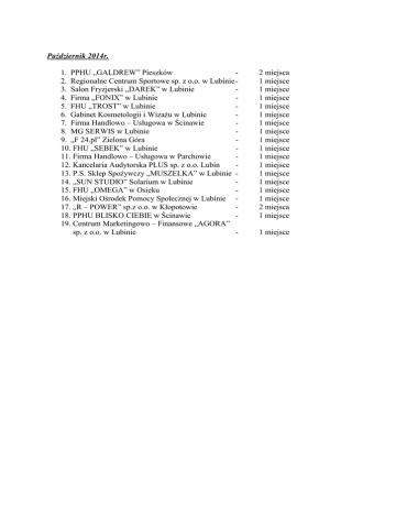 Październik 2014r. 1. PPHU „GALDREW” Pieszków 2. Regionalne Centrum Sportowe sp. z o.o. w Lubinie 3. Salon Fryzjerski „DAREK” w Lubinie 4. Firma „FONIX” w Lubinie 5. FHU „TROST” w Lubinie 6. Gabinet Kosmetologii i Wizażu w Lubinie 7. Firma Handlowo – Usługowa w Ścinawie 8. MG SERWIS w Lubinie 9. „F 24.pl” Zielona Góra 10. FHU „SEBEK” w Lubinie 11. Firma Handlowo – Usługowa w Parchowie 12. Kancelaria Audytorska PLUS sp. z o.o. Lubin 13. P.S. Sklep Spożywczy „MUSZELKA” w Lubinie 14. „SUN STUDIO” Solarium w Lubinie 15. FHU „OMEGA” w Osieku 16. Miejski Ośrodek Pomocy Społecznej w Lubinie 17. „R – POWER” sp.z o.o. w Kłopotowie 18. PPHU BLISKO CIEBIE w Ścinawie 19. Centrum Marketingowo – Finansowe „AGORA” sp. z o.o. w Lubinie - 2 miejsca 1 miejsce 1 miejsce 1 miejsce 1 miejsce 1 miejsce 1 miejsce 1 miejsce 1 miejsce 1 miejsce 1 miejsce 1 miejsce 1 miejsce 1 miejsce 1 miejsce 1 miejsce 2 miejsca 1 miejsce 1 miejsce
