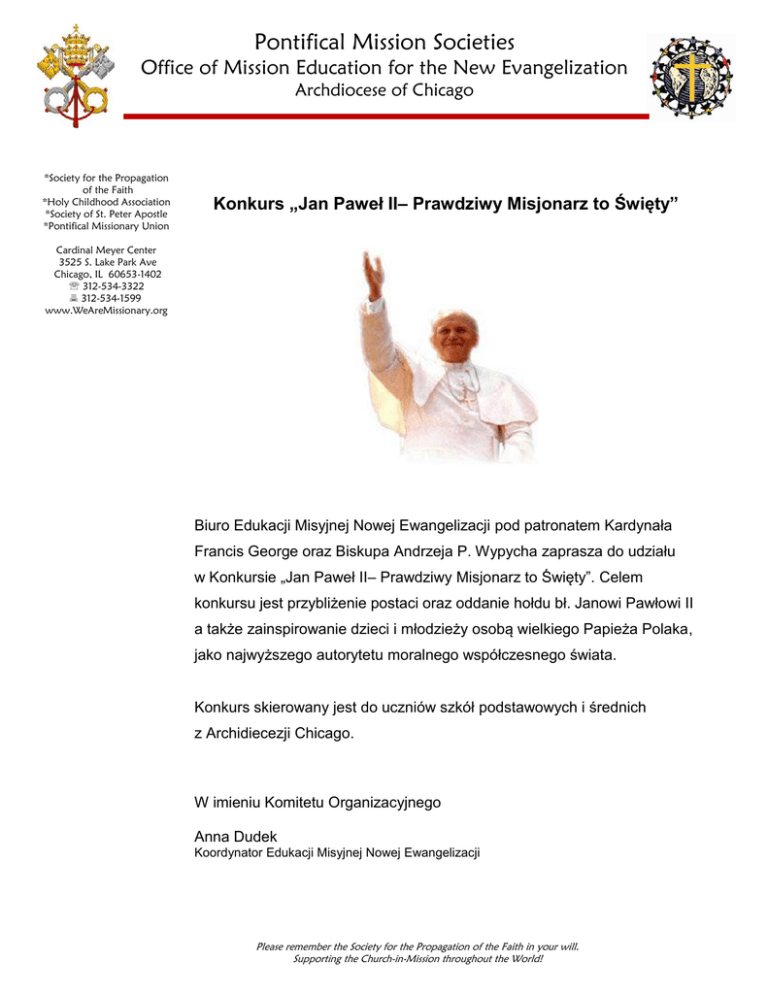 Pontifical Mission Societies Office of Mission Education for the New Evangelization Archdiocese of Chicago *Society for the Propagation of the Faith *Holy Childhood Association *Society of St. Peter Apostle *Pontifical Missionary Union Konkurs „Jan Paweł II– Prawdziwy Misjonarz to Święty” Cardinal Meyer Center 3525 S. Lake Park Ave Chicago, IL 60653-1402 312-534-3322 312-534-1599 www.WeAreMissionary.org Biuro Edukacji Misyjnej Nowej Ewangelizacji pod patronatem Kardynała Francis George oraz Biskupa Andrzeja P. Wypycha zaprasza do udziału w Konkursie „Jan Paweł II– Prawdziwy Misjonarz to Święty”. Celem konkursu jest przybliżenie postaci oraz oddanie hołdu bł. Janowi Pawłowi II a także zainspirowanie dzieci i młodzieży osobą wielkiego Papieża Polaka, jako najwyższego autorytetu moralnego współczesnego świata. Konkurs skierowany jest do uczniów szkół podstawowych i średnich z Archidiecezji Chicago. W imieniu Komitetu Organizacyjnego Anna Dudek Koordynator Edukacji Misyjnej Nowej Ewangelizacji Please remember the Society for the Propagation of the Faith in your will. Supporting the Church-in-Mission throughout the World! REGULAMIN KONKURSU I. PRZEPISY OGÓLNE 1.1. Organizatorami Konkursu jest Biuro Edukacji Misyjnej Nowej Ewangelizacji, Archidiecezji Chicago. 1.2. Celem Konkursu jest przybliżenie sylwetki i oddanie hołdu bł. Janowi Pawłowi II oraz zwrócenie uwagi na jego podróże misyjne. 1.3. Jury Konkursu wybierze najlepsze prace artystyczne (w dowolnej formie) oraz prace filmowe (reportaż) nawiązujące do życia i twórczości Jana Pawła II i dotyczące papieskich pielgrzymek do krajów misyjnych. 1.4. W Konkursie mogą brać udział uczniowie szkół podstawowych i średnich z terenu Archidiecezji Chicago. 1.5. Nadesłanie prac na Konkurs oznacza akceptację jego warunków, wyrażonych w niniejszym regulaminie. II. KATEGORIE I TEMATYKA PRAC KONKURSOWYCH: KONKURS ARTYSTYCZNY (plakat, album, portret): Dla uczniów klasy I-IV szkoły podstawowej: 1. Jan Paweł II najsłynniejszy Pielgrzym wszechczasów. Praca nawiązująca do podróży Jana Pawła II po świecie. KONKURS ARTYSTYCZNY (plakat,album,portret) / KONKURS FILMOWY (reportaż) Dla uczniów klasy V-VII szkoły podstawowej oraz I-III szkoły średniej: 1. Jan Paweł II - Papież Pielgrzym. Film powinien zawierać informacje nawiązujące do pielgrzymek Jana Pawła II. 2. Jan Paweł II - Wielki Misjonarz i Przyjaciel Misjonarzy. Film dokumentujący współpracę Jana Pawła II z misjonarzami na całym świecie. 3. Jan Paweł II - głosem całego świata. Film nawiązujący do homilii i nauk bł. Jana Pawła II, a także ich wpływu na Twoje życie. Kim jest Jan Paweł II dla Ciebie? KATEGORIE WIEKOWE: Dzieci Młodsze (7-10) Dzieci Starsze (11-14) Młodzież (15-18) II. PRZEPISY DOTYCZĄCE PRAC 2.1. Każdy uczestnik Konkursu może nadesłać prace artystyczną w dowolnym rozmiarze. Animacja filmowa powinna mieścić się w przedziale od 2 do 5 minut. 2.2. Prace należy przysyłać w kopercie z napisem „ Jan Paweł II - Prawdziwy Misjonarz to Święty” na adres: Office for Mission Education for the New Evangelization, Cardinal Meyer Center, 3525 S Lake Park Ave. Chicago, Il 60653. 2.3. Każdą pracę artystyczną należy opisać na odwrocie, podając następujące dane: imię i nazwisko autora, numer telefonu, nazwa szkoły, klasa, tytuł pracy. Video proszę przesłać na płycie CD lub DVD załączając dane o autorze pracy. 2.4. Do koperty zaadresowanej na Biuro Edukacji Misyjnej Nowej Ewangelizacji w Chicago należy włożyć, oprócz pracy konkursowej, również zgodę rodziców lub opiekunów na udział w konkursie oraz ich oświadczenie załączone poniżej. 2.6. Organizatorzy nie zwracają prac biorących udział w Konkursie. III. TERMINARZ 3.1. Termin nadsyłania i dostarczania prac mija dnia 1 marca 2014 roku (decyduje data stempla pocztowego w przypadku prac przesłanych pocztą). 3.2. Prace nadesłane lub dostarczone po terminie nie będą brane pod uwagę w Konkursie. 3.3. Organizatorzy powołują Jury Konkursu. Decyzje Jury są ostateczne i nie podlegają weryfikacji. Jury zastrzega sobie prawo nie wyłaniania zwycięzców, przyznawania miejsc ex equo, jak i wyróżnień. 3.4. Zwycięzcy Konkursu zostaną zaproszeni przez organizatorów na uroczyste rozdanie nagród, które nastąpi 30 marca 2014r. Miejsce uroczystości zostanie podane w późniejszym terminie. 3.5. Wyniki Konkursu zostaną podane na stronie www.wearemissionary.org i w kwartalniku „Mission Matters”. IV. NAGRODY I WYRÓŻNIENIA 4.1. Organizatorzy przewidują nagrody rzeczowe (w tym książki) za zajęcie miejsc I- III i miejsc wyróżnionych. Każdy uczestnik otrzyma certyfikat uczestnictwa. V. WYKORZYSTANIE PRAC NAGRODZONYCH 5.1. Organizatorzy mają prawo do publikacji prac nadesłanych na Konkurs – w całości lub po dokonaniu skrótów, w wydawanych przez siebie materiałach, z jednoczesnym podaniem imienia i nazwiska autora. 5.2. Uprawnienia, o których mowa wyżej, w pkt. 5.1., przysługują Organizatorom nieodpłatnie. Organizator Biuro Edukacji Misyjnej Nowej Ewangelizacji Pontifical Mission Societies Office of Mission Education for the New Evangelization Archdiocese of Chicago ZAŁĄCZNIK–zgoda na przetwarzanie danych osobowych *Society for the Propagation of the Faith *Holy Childhood Association *Society of St. Peter Apostle *Pontifical Missionary Union Cardinal Meyer Center 3525 S. Lake Park Ave Chicago, IL 60653-1402 312-534-3322 312-534-1599 www.WeAreMissionary.org ……………………………………………….. Imię i nazwisko dziecka ……………………………………………….. Klasa …………………………………………………. Nazwa szkoły OŚWIADCZENIE Wyrażam zgodę na publikowanie i przetwarzanie danych osobowych oraz wyników uzyskanych przez moje dziecko, które uczestniczy w konkursie „Jan Paweł II – prawdziwy misjonarz to święty” org