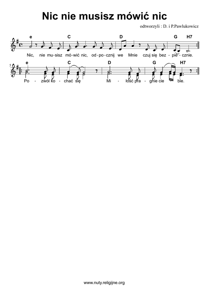 Nic nie musisz mówić nic odtworzyli : D. i P.Pawlukowicz e Nic, 5 C D G H7 nie mu sisz mó wić nic, od po cznij we e Po C zwól ko chać się Mnie D Mi www.nuty.religijne.org łość pra czuj się bez pie cznie. G H7 gnie cie bie.
