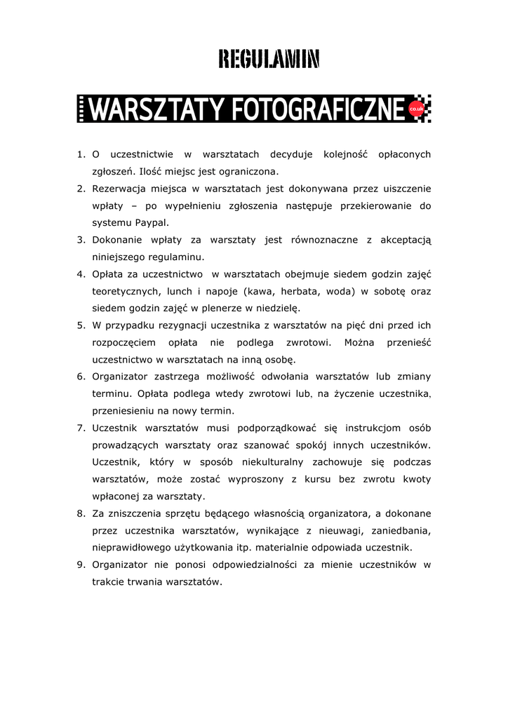 regulamin 1. O uczestnictwie w warsztatach decyduje kolejność opłaconych zgłoszeń. Ilość miejsc jest ograniczona. 2. Rezerwacja miejsca w warsztatach jest dokonywana przez uiszczenie wpłaty – po wypełnieniu zgłoszenia następuje przekierowanie do systemu Paypal. 3. Dokonanie wpłaty za warsztaty jest równoznaczne z akceptacją niniejszego regulaminu. 4. Opłata za uczestnictwo w warsztatach obejmuje siedem godzin zajęć teoretycznych, lunch i napoje (kawa, herbata, woda) w sobotę oraz siedem godzin zajęć w plenerze w niedzielę. 5. W przypadku rezygnacji uczestnika z warsztatów na pięć dni przed ich rozpoczęciem opłata nie podlega zwrotowi. Można przenieść uczestnictwo w warsztatach na inną osobę. 6. Organizator zastrzega możliwość odwołania warsztatów lub zmiany terminu. Opłata podlega wtedy zwrotowi lub, na życzenie uczestnika, przeniesieniu na nowy termin. 7. Uczestnik warsztatów musi podporządkować się instrukcjom osób prowadzących warsztaty oraz szanować spokój innych uczestników. Uczestnik, który w sposób niekulturalny zachowuje się podczas warsztatów, może zostać wyproszony z kursu bez zwrotu kwoty wpłaconej za warsztaty. 8. Za zniszczenia sprzętu będącego własnością organizatora, a dokonane przez uczestnika warsztatów, wynikające z nieuwagi, zaniedbania, nieprawidłowego użytkowania itp. materialnie odpowiada uczestnik. 9. Organizator nie ponosi odpowiedzialności za mienie uczestników w trakcie trwania warsztatów.