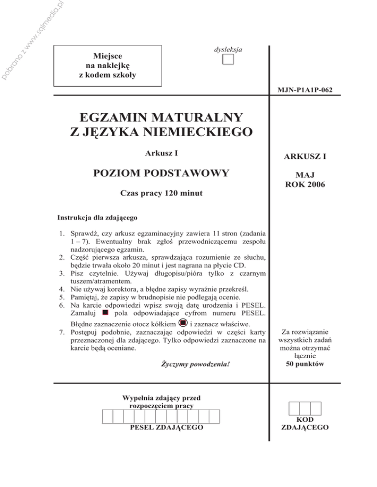 l m ed ia .p zw ww .sq l po br an o dysleksja Miejsce na naklejkĊ z kodem szkoáy MJN-P1A1P-062 EGZAMIN MATURALNY Z JĉZYKA NIEMIECKIEGO Arkusz I ARKUSZ I POZIOM PODSTAWOWY MAJ ROK 2006 Czas pracy 120 minut Instrukcja dla zdającego 1. SprawdĨ, czy arkusz egzaminacyjny zawiera 11 stron (zadania 1 – 7). Ewentualny brak zgáoĞ przewodniczącemu zespoáu nadzorującego egzamin. 2. CzĊĞü pierwsza arkusza, sprawdzająca rozumienie ze sáuchu, bĊdzie trwaáa okoáo 20 minut i jest nagrana na páycie CD. 3. Pisz czytelnie. UĪywaj dáugopisu/pióra tylko z czarnym tuszem/atramentem. 4. Nie uĪywaj korektora, a báĊdne zapisy wyraĨnie przekreĞl. 5. PamiĊtaj, Īe zapisy w brudnopisie nie podlegają ocenie. 6. Na karcie odpowiedzi wpisz swoją datĊ urodzenia i PESEL. pola odpowiadające cyfrom numeru PESEL. Zamaluj i zaznacz wáaĞciwe. BáĊdne zaznaczenie otocz kóákiem 7. PostĊpuj podobnie, zaznaczając odpowiedzi w czĊĞci karty przeznaczonej dla zdającego. Tylko odpowiedzi zaznaczone na karcie bĊdą oceniane. ĩyczymy powodzenia! Za rozwiązanie wszystkich zadaĔ moĪna otrzymaü áącznie 50 punktów Wypeánia zdający przed rozpoczĊciem pracy PESEL ZDAJĄCEGO KOD ZDAJĄCEGO l m ed ia .p Egzamin maturalny z jĊzyka niemieckiego Arkusz I po br an o zw ww .sq l 2 ROZUMIENIE ZE SàUCHU Zadanie 1. (7 pkt) Zapoznaj siĊ z treĞcią zadania. Po dwukrotnym wysáuchaniu dwóch osób zaznacz znakiem X w tabeli, do kogo odnoszą siĊ podane w niej informacje (1.1. – 1.7.). Za kaĪde poprawne rozwiązanie otrzymasz l punkt. Kristina 1.1. … hat eine Sprachprüfung gemacht. 1.2. … musste seine/ihre Deutschkenntnisse verbessern. 1.3. Auch der Studienort war für ... von Bedeutung. X 1.4. Seine/ihre Freundin hat in Deutschland Familie. X 1.5. Anfangs hat ... an der Universität viel Zeit verbracht. 1.6. … hat während der Studienzeit auch gearbeitet. 1.7. … möchte Beamter/Beamtin werden. PRZENIEĝ ROZWIĄZANIE NA KARTĉ ODPOWIEDZI! Markus X X X X X l m ed ia .p zw ww .sq l po br an o Egzamin maturalny z jĊzyka niemieckiego Arkusz I 3 Zadanie 2. (8 pkt) Zapoznaj siĊ z treĞcią zadania. Po dwukrotnym wysáuchaniu wywiadu z Florianem zdecyduj, które z podanych w tabeli zdaĔ (2.1. – 2.8.) są zgodne z jego treĞcią (richtig – R), a które nie (falsch – F). Zaznacz znakiem X wáaĞciwe miejsca w tabeli. Za kaĪde poprawne rozwiązanie otrzymasz 1 punkt. R Der Reporter steht den jungen Musikern sehr negativ 2.1. gegenüber. 2.2. Anfangs sangen sie Lieder ihrer Lieblingssänger. F X X 2.3. Die Gruppe konnte von Anfang an allein proben. X Die erste Schallplatte der Gruppe wurde von einer bekannten 2.4. Firma produziert. X Sie haben ihre Ausbildung in der Schule für einige Zeit 2.5. unterbrochen. X 2.6. Sie singen in ihrer Muttersprache. X 2.7. Die erste Tournee der Gruppe fand im Ausland statt. X 2.8. Die Gruppenmitglieder hoffen auf eine lebenslange Karriere. PRZENIEĝ ROZWIĄZANIE NA KARTĉ ODPOWIEDZI! X m ed ia .p l po br an o zw ww .sq l 4 Egzamin maturalny z jĊzyka niemieckiego Arkusz I ROZUMIENIE TEKSTU CZYTANEGO Zadanie 3. (9 pkt) Przeczytaj uwaĪnie poniĪszy tekst i wybierz wáaĞciwe, zgodne z jego treĞcią uzupeánienia podanych zdaĔ, zakreĞlając literĊ A, B, C lub D. W kaĪdym przypadku istnieje tylko jedna prawidáowa odpowiedĨ. Za kaĪde poprawne rozwiązanie otrzymasz 1 punkt. GEBOREN AM 24.12.: Vorteil oder Nachteil? Als Kind bekam Kira morgens die Geburtstagsgeschenke und abends die Weihnachtsgeschenke. Der Tag begann mit einem schön gedeckten Frühstückstisch. Vormittags kamen die Freunde zur Geburtstagsfeier. „Die anderen Mütter waren froh, dass sie ihre Kinder abgeben konnten“, erinnert sich Kira. Nachmittags folgten der Gang in die Kirche und die Bescherung am Weihnachtsbaum. Anschließend traf man beim Abendessen die Verwandten. „Ich war froh, wenn ich abends in meinem Bett lag, meine Ruhe hatte und mich endlich ausruhen konnte.“ Später, als Schülerin, hatte Kira in den Schulferien Geburtstag. „Das war ein großer Vorteil. Die meisten Freunde waren zu Hause. Ich konnte mit ihnen in den Geburtstag reinfeiern und am nächsten Tag ausschlafen. Wenn meine Mitschüler Geburtstag hatten, mussten sie ganz normal zur Schule gehen. Dort sang ihnen die ganze Klasse „Zum Geburtstag viel Glück“ vor und sie mussten alle anlächeln. Das fand ich idiotisch. Mir ist es erspart geblieben.“ Der 18. Geburtstag ist ein besonderes Ereignis: Man wird volljährig. Doch Kira hat den Tag in schlechter Erinnerung: „Ich habe mich schon beim Reinfeiern mit meinem damaligen Freund gestritten.“ Außerdem hatte sie seit Jahren keinen Kontakt mehr zum Vater gehabt. „Opa meinte: Ob der wohl daran denkt, dass seine Tochter 18 wird? Ich wollte nur, dass er anruft. Doch es kam nichts. Auf Weihnachten hatte ich darum auch keine Lust mehr.“ „Was Geschenke angeht, so meinen die meisten, man ist im Nachteil“, berichtet Kira. „Das finde ich nicht. Ich kann mir etwas Größeres wünschen – zum Geburtstag und zu Weihnachten.“ Andere haben es da schwerer: „Ein Freund hat Anfang Januar Geburtstag. Der hat erzählt, dass er zu Weihnachten wenig bekommt. Die Eltern sagen: Du hast ja bald Geburtstag.“ Von den Großeltern bekommt Kira jedes Jahr ein Paket. An den Geschenken darin steht auf kleinen Zetteln „Zum Geburtstag“ oder „Zu Weihnachten“. Von den meisten Geschenken weiß sie heute aber nicht mehr: Waren es Geburtstags- oder Weihnachtsgeschenke? Nur bei einer kleinen Stoffmaus ist sie sich sicher: „Die gab es von einer guten Freundin zum Geburtstag.“ Kira trägt das Tierchen noch heute am Schlüsselbund. Einen großen Wunsch hat sie jedes Jahr: „Ich wünsche mir, dass es mal schneit.“ Ihren letzten Geburtstag hat Kira bei ihrem Freund verbracht. Er hat etwas Leckeres gekocht, Kira hat ihren eigenen Geburtstagskuchen gebacken. Ein Adventskranz und Kerzen sorgten für weihnachtliche Stimmung. Was ist der größte Vorteil? Kira g