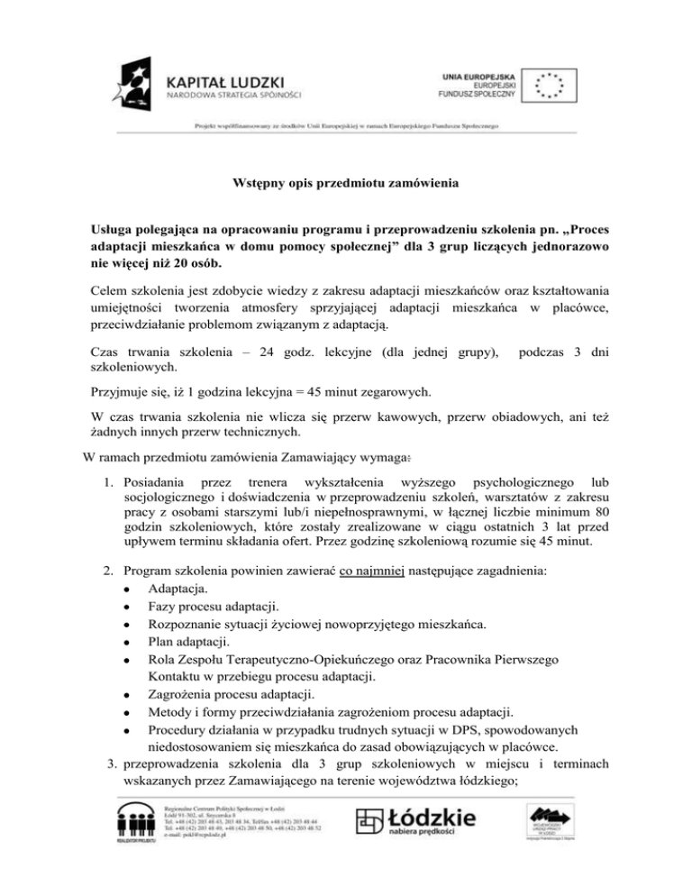 Wstępny opis przedmiotu zamówienia Usługa polegająca na opracowaniu programu i przeprowadzeniu szkolenia pn. „Proces adaptacji mieszkańca w domu pomocy społecznej” dla 3 grup liczących jednorazowo nie więcej niż 20 osób. Celem szkolenia jest zdobycie wiedzy z zakresu adaptacji mieszkańców oraz kształtowania umiejętności tworzenia atmosfery sprzyjającej adaptacji mieszkańca w placówce, przeciwdziałanie problemom związanym z adaptacją. Czas trwania szkolenia – 24 godz. lekcyjne (dla jednej grupy), szkoleniowych. podczas 3 dni Przyjmuje się, iż 1 godzina lekcyjna = 45 minut zegarowych. W czas trwania szkolenia nie wlicza się przerw kawowych, przerw obiadowych, ani też żadnych innych przerw technicznych. W ramach przedmiotu zamówienia Zamawiający wymaga: 1. Posiadania przez trenera wykształcenia wyższego psychologicznego lub socjologicznego i doświadczenia w przeprowadzeniu szkoleń, warsztatów z zakresu pracy z osobami starszymi lub/i niepełnosprawnymi, w łącznej liczbie minimum 80 godzin szkoleniowych, które zostały zrealizowane w ciągu ostatnich 3 lat przed upływem terminu składania ofert. Przez godzinę szkoleniową rozumie się 45 minut. 2. Program szkolenia powinien zawierać co najmniej następujące zagadnienia: Adaptacja. Fazy procesu adaptacji. Rozpoznanie sytuacji życiowej nowoprzyjętego mieszkańca. Plan adaptacji. Rola Zespołu Terapeutyczno-Opiekuńczego oraz Pracownika Pierwszego Kontaktu w przebiegu procesu adaptacji. Zagrożenia procesu adaptacji. Metody i formy przeciwdziałania zagrożeniom procesu adaptacji. Procedury działania w przypadku trudnych sytuacji w DPS, spowodowanych niedostosowaniem się mieszkańca do zasad obowiązujących w placówce. 3. przeprowadzenia szkolenia dla 3 grup szkoleniowych w miejscu i terminach wskazanych przez Zamawiającego na terenie województwa łódzkiego; 4. opracowanie materiałów szkoleniowych dla uczestników szkolenia (skrypt, prezentacja), 5. przygotowanie zaświadczeń o ukończeniu szkolenia, 6. zapewnienie przeprowadzenia szkoleń w sposób sumienny i z należytą starannością, w tym w szczególności z zachowaniem punktualności oraz kultury osobistej wobec uczestników szkoleń, 7. niezwłocznego informowania Zamawiającego o problemach związanych z realizacją zamówienia, 8. terminowego wypełniania dokumentów związanych z realizacją szkoleń przekazanych od Zamawiającego (karty pracy, dzienniki zajęć), 9. wykorzystywanie w materiałach wizualizacji zgodnej z wymogami Projektu, 10. przestawienia do akceptacji Zamawiającego treść materiałów szkoleniowych i wzoru zaświadczeń na minimum 7 dni przed rozpoczęciem danego szkolenia w wersji elektronicznej. Uwagi odnośnie wzoru zaświadczeń i zawartości materiałów szkoleniowych przygotowanych zgodnie z programem szkolenia zostaną przedstawione Wykonawcy celem naniesienia poprawek.