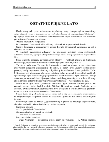 Ostatnie piękne lato 45 Miriam Akavia OSTATNIE PIĘKNE LATO Kiedy minął rok tysiąc dziewięćset trzydziesty ósmy i rozpoczął się trzydziesty dziewiąty, mówiono w domu, że nowy rok będzie lepszy od poprzedniego. Chciano, by był lepszy. Uważano, że tak trzeba. Nie dopuszczano złych wiadomości, nie wierzono pesymistom. Cieszono się wiosną. Wiosna nadeszła w całej krasie. Drzewo przed domem zakwitło piękniej i obficiej niż w poprzednich latach. Gazety donoszące o rozpaczliwym czynie Herszla Griinspana1 odkładano na bok i cieszono się wiosną. W miastach niemieckich odbywały się pogromy; rozbijano szyby żydowskich sklepów i mieszkań, sypały się tony potłuczonego szkła. Ich apogeum była Kryształowa Noc. Serca cieszyły gromady powracających ptaków — wolnych ptaków na błękitnym niebie — gdy tymczasem odbierano wolność tysiącom niewinnych ludzi. To nie tu, mówiono. To tam. Tu królowała przepiękna wiosna, a tam zabraniano żydowskim dzieciom uczęszczania do szkół, a każdy krok Żydów kontrolowało gestapo; każdy mężczyzna ożeniony z Żydówką, każda kobieta, która poślubiła Żyda, byli pozbawieni elementarnych praw, podobnie każdy potomek żydowskiej matki lub żydowskiego ojca, aż do odległego pokolenia; świat wiedział o tym i milczał. Każdy wiosenny poranek nadchodził jasnym świtem, świetlaną jutrzenką, a na polach falowały zboża i kwitły kobierce kwiatów; przyroda czyniła cuda — więc czekano na cud. Mama znów była chora. Tym razem zawieziono ją do szpitala. Musiała poddać się operacji, a cały świat śledził reakcję Wielkiej Brytanii na zajęcie Sudetów przez Niemcy. Demokratyczna Czechosłowacja była związana z Wielką Brytanią przymierzem, co powie na to sprzymierzeniec Chamberlain? Mama dusiła się pod narkozą. Ania i ojciec byli z nią aż do momentu przewiezienia na salę operacyjną — potem czekali w korytarzu. Ojciec nic nie mówił, tylko trzymał jej rękę. Po operacji weszli do mamy. Ani zakręciło się w głowie od mocnego zapachu eteru, ale tylko na chwilę. Mama budziła się i znów zasypiała. Nazajutrz spytała: — Co powiedział Chamberlain? Ojciec, zwilżając jej wargi, powiedział: — Nie masz innych trosk? Lecz ona chciała wiedzieć. — Uległ Niemcom — powiedział ojciec, jakby się wstydził. — A Polska odebrała * Herszl Griinspan w proteście przeciwko prześladowaniom Żydów w Niemczech wszedł do ambasady niemieckiej w Paryżu i zastrzeli! sekretarza ambasady von Rotha, po czym oddał się w ręce sądu francuskiego. W odwecie Niemcy zorganizowali pogrom Żydów, znany pod nazwą Kryształowa Noc. Miriam Akavia 46 Czechosłowacji Zaolzie. Mama zamknęła oczy. — Wszystko wiruje mi przed oczami... Ojciec dodał szybko: — Anglia wprawdzie ustąpiła, ale Niemcy przyrzekły sto lat pokoju. Sto lat pokoju warte jest wysokiej ceny. Siedzieli koło łóżka mamy, aż zasnęła. Kiedy wróciła do domu, ojciec zabronił w jej obecności mówić o polityce. — Za bardzo bierze sobie wszystko do serca — powiedział. Reli także musiała mieć spokój do nauki. Hela była zajęta własnym życiem; zawiadomiła już oficjalnie rodzinę, że sprawy między nią a Aleksem układają się pomyślnie, aż tu nagle jego żona rozmyśliła się i powiedziała, że nie zgadza się na rozwód. Hela nie była w stanie myśleć o niczym innym. A wiosna była wspaniała. Miasto nie pamiętało tak pięknej pory. Kwitnące konwalie i bzy kąpały się w blasku słońca i roztaczały upojne zapachy. Człowiek miał ochotę biec przed siebie, w dal, aż do utraty sił, tańczyć aż do omdlenia i cieszyć się, cieszyć. Tej wiosny rodzice byli hojni i wielkoduszni. Pozwolili Reli wychodzić z chłopcami, wracać późno i o nic nie pytali. Tej wiosny młody Miłosz, najnowszy adorator dziewczyny, wpatrywał się w nią zakochanymi oczyma. Tej wiosny pozwolono Iziowi grać w piłkę nożną, zamiast odrabiać lekcje, i pozwolono mu wraz z Włodkiem budować rakietę; wybierali się nią obaj w przestworza po ukończeniu gimnazjum. Ta wiosna zawróciła ludziom w głowach, budząc słodkie iluzje. Mama kupiła sobie dwie nowe sukienki. Miała trzydzieści sześć lat, była szczupła i wyglądała jak młoda dziewczyna. Ojciec nabył nowy obraz. Zawsze lubił malarstwo i twierdził, że dzieło artystyczne nigdy nie traci na wartości. Chłopcy i dziewczęta pokończyli szkoły, wysypali się z murów uczelni na pola, do lasów i nad rzeki. W maju tatuś i Olek pojechali do Muszyny nad Popradem, aby wynająć domek na lipiec i sierpień. Tatuś kupił sobie na tę podróż tyrolski kapelusz z piórkiem, a Olek ubrał się jak strzelec. Lato tysiąc dziewięćset trzydziestego dziewiątego było latem szczęścia. Czekano cierpliwie, aż skończy się szkoła, i przyrzekano sobie wynagrodzić niepowodzenia ubiegłego roku. Pod koniec roku szkolnego zaczęło się pakowanie. Garnki, prześcieradła, książki, bieliznę — wszystko wrzucano do wielkiego kosza. Garderobę mamy zapakowano do dwóch walizek, do tego jeszcze worek z kołdrami. Babcia Plessner dołączyła do nich, Izio zapewnił, że nie pozwoli jej czuć się źle, nie będzie miała na to czasu. Dwunastoletnia Irka była głową rodziny. Jej matka Hania już nie mówiła o pójściu do kibucu ani o wychrzczeniu się. Już nie walczyła. Zajmowała się małą Niną, w niej Ostatnie piękne lato 47 koncentrował się jej świat. Pociąg ruszył. Olek i tatuś stali na peronie, machając na pożegnanie. Dzieci przylepiły twarze do szyb małego okienka wagonu. Ojcowie stawali się coraz mniejsi, aż zniknęli dzieciom z oczu. Przedmieścia przesuwały się jak na taśmie filmowej; potem okna pociągu wypełniły złoto-zielone pola. Przed oczami rozciągała się wielka, piękna, dobra, bogata ziemia, nazwana „spichlerzem Europy”. Na małych przydrożnych stacyjkach stali zawiadowcy, powiewając chorągie