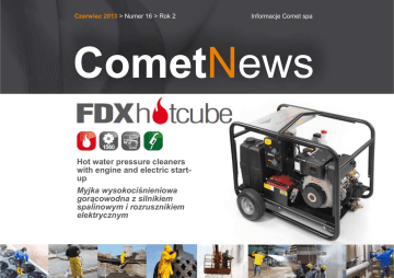 Czerwiec 2013 > Numer 16 > Rok 2 Informacje Comet spa CometNews Hot water pressure cleaners with engine and electric startup Myjka wysokociśnieniowa gorącowodna z silnikiem spalinowym i rozrusznikiem elektrycznym High performance, flexible and stand-alone Wysokowydajna, uniwersalna, niezależna HOT WATER HIGH-PRESSURE CLEANER WITH ENGINE AND ELECTRIC START-UP Ideal for all applications in case of a power cut, these high-pressure cleaners with endothermic engine are completely stand-alone, sturdy and reliable. Two large rear wheels and two fixed pneumatic-effect front swivel wheels ensure great mobility on any surface so it is so easy to move around. The tubular structure has been designed for transport by truck or forklift, a central bar allows lifting with a crane or hoist. All components are housed in a sturdy tubular steel frame with cataphoresis treatment for complete protection against corrosion. Motor and pump are installed on the base with anti-vibration mounts to minimize vibration during use. Comet FW2 triplex pumps are made with high quality materials such as 3 ceramic pistons and brass head, the speed reducer allows the pump to work at low revolutions. Thanks to the decelerator, the engine reduces its speed automatically lowering the level of noise during work breaks and significantly increasing the cleaner’s life. The engine is also fitted with an oil-alert safety device. The integrated fuel tank for the boiler has a cap with fill-up filter and a level sensor. Its shape facilita- tes filling-up and its 30-litre capacity allows a long working life. A safety valve limits the pressure inside the boiler. The flow switch monitors the water flow on the delivery branch and prevents the boiler working when the water flow is less than 3 l/min. A photoresistor monitors the flame, disconnecting delivery of the fuel if there is no arc discharge. The powerful vertical coil burner with high efficiency has gradual adjustment between 30°C and 110°C and up to 140°C (steam mode) only with pressures lower than 32 bar. The pump’s inlet water tank disconnects the device from the drinking-water system, protecting all parts that come into contact with water and other deposits. The tank with anti-scale pump prevents scale forming especially inside the coil. MYJKA WYSOKOCIŚNIENIOWA GORĄCOWODNA Z SILNIKIEM SPALINOWYM I ROZRUSZNIKIEM ELEKTRYCZNYM Te napędzane silnikiem endotermicznym myjki wysokociśnieniowe są to w pełni niezależne, solidne i niezawodne urządzenia, które idealnie nadają się do wszystkich zastosowań z brakiem dostępu do zasilania elektrycznego. Dwa duże koła tylne i dwa przednie koła obrotowe stałe z efektem pneumatycznym zapewniają doskonałą mobilność na każdej powierzchni, umożliwiając łatwość przemieszczania. Konstrukcja rurowa została zaprojektowana do transportowania na ciężarówce lub wózku widłowym, centralny pręt umożliwia podnoszenia za pomocą żurawia lub podnośnika. Wszystkie komponenty są umieszczone wewnątrz solidnej ramy wykonanej z rur stalowych malowanych metodą kataforetyczną dla pełnej ochrony przed korozją. Silnik i pompa są zamocowane do podstawy za pośrednictwem tłumików drgań dla zminimalizowania drgań podczas pracy. Pompy triplex Comet FW2 są wykonane z wysokiej jakości materiałów: 3 tłoki ceramiczne, mosiężna głowica; reduktor obrotów umożliwia niskoobrotową pracę pompy. Dzięki reduktorowi obrotów silnik automatycznie zmniejsza swoją prędkość obrotową, obniżając poziom hałasu w trakcie przerw roboczych i znacząco wydłużając żywotność myjki. Silnik jest również wyposażony wskaźnik niskiego poziomu oleju. Zintegrowany zbiornik paliwa kotła posiada korek z filtrem wlewowym i wskaźnik poziomu napełnienia. Jego kształt ułatwia napełnianie, natomiast pojemność 30l zapewnia długą żywotność. Zawór bezpieczeństwa ogranicza ciśnienie wewnątrz kotła a czujnik przepływu monitoruje przepływ wody na linii zasilania, wstrzymując prace kotła przy natężeniu przepływu wody poniżej 3l/min. Fotorezystor monitoruje płomień i odłącza dopływ paliwa w przypadku braku wyładowania łuku. Mocny wysokowydajny palnik z pionową wężownicą posiada stopniową regulację w zakresie od 30 °C do 110 °C, i do 140 °C (tryb pary) tylko z ciśnieniami poniżej 32 bar. Zbiornik wody wlotowej pompy odłącza urzadzenie od instalacji wodny pitnej, zabezpieczając wszystkie części, jakie wchodzą w kontakt z wodą i innymi osadami. Dozownik środka odkamieniającego zapobiega osadzaniu się kamienia, szczególne wewnatrz wężownicy. Quality construction that lasts Wytrzymała, wysokiej jakości konstrukcja TECHNICAL FEATURES CHARAKTERYSTYKA TECHNICZNA › Honda GX series engine (petrol models) or Yanmar L100N engine (Diesel model) › Comet FW2 triplex pumps › Electrical starting-up › No engine-oil safety device (oil-alert) › Automatic decelerator to reduce the number of revs in the bypass phase › Gearbox (with 1560 rpm pump) › Professional pressure-release unloader valve › Big water filter at pump inlet › 30 l fuel tank with level float and fill up filter › Anti-scale device with pump and tank (2.5 l) › Double coil vertical boiler with stainless steel outer casing › Constant water temperature › Flow-switch operated burner › Safety valve › Boiler thermal protection › Silnik Honda z serii GX (benzyna) lub silnik Yanmar L100 (Diesel) › Pompa triplex Comet FW2 › Rozrusznik elektryczny › Sygnalizator niskiego poziomu oleju › Automatyczny reduktor obrotów w trybie obejścia › Skrzynia biegów (z pompą 1560 obr/min) › Profesjonalny ciśnieniowy zawór bezpieczeństwa › Duży filtr wody na wlocie pompy › Zbiornik paliwa o poj. 30l z pływakowym wskaźnikiem poziomu i filtrem wlewowym. › Urządzenie do usuwania kamienia z pompką i zbiornikiem (2,5l) › Dwuwężownicowy pionowy kocioł z obudową ze stali nierdzewnej › Stała tempera