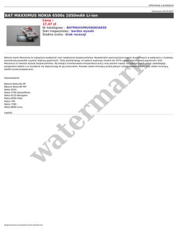 Informacje o produkcie Utworzono 04-03-2017 BAT MAXXIMUS NOKIA 6500s 1050mAh Li-ion Cena : 17,47 zł Nr katalogowy : BATMAXXIMUSNOKIA650 Stan magazynowy : bardzo wysoki Średnia ocena : brak recenzji Zastosowanie: Bateria Nokia BL-6P Bateria Nokia BP-5M Nokia 5610 Nokia 5700 XpressMusic Nokia 6110 Navigator Nokia 6500 Slide Nokia 700 Nokia 7390 Nokia 8600 Luna w at hak042 er m ar k Bateria marki Maxximus to najwyższa wydajność oraz zwiększone bezpieczeństwo. Nowatorskie wykorzystanie kopert aluminiowych w połączeniu z budową komórkową pozwoliło uzyskać większą pojemność. Testy potwierdzają, że bateria wykazuje średnio do 107% swojej znamionowej pojemności Q10. Maxximus to również wyższe bezpieczeństwo. Na bieżąco monitorowana temperatura pracy oraz poziom napięć na pojedynczych celach zapobiegają przegrzaniu baterii a w rezultacie nie dopuszczają do jej zniszczenia. Posiada układ chroniący przed pełnym rozładowaniem baterii oraz układ chroniący telefon przed przepięciami. Wygenerowano w programie www.oscGold.com