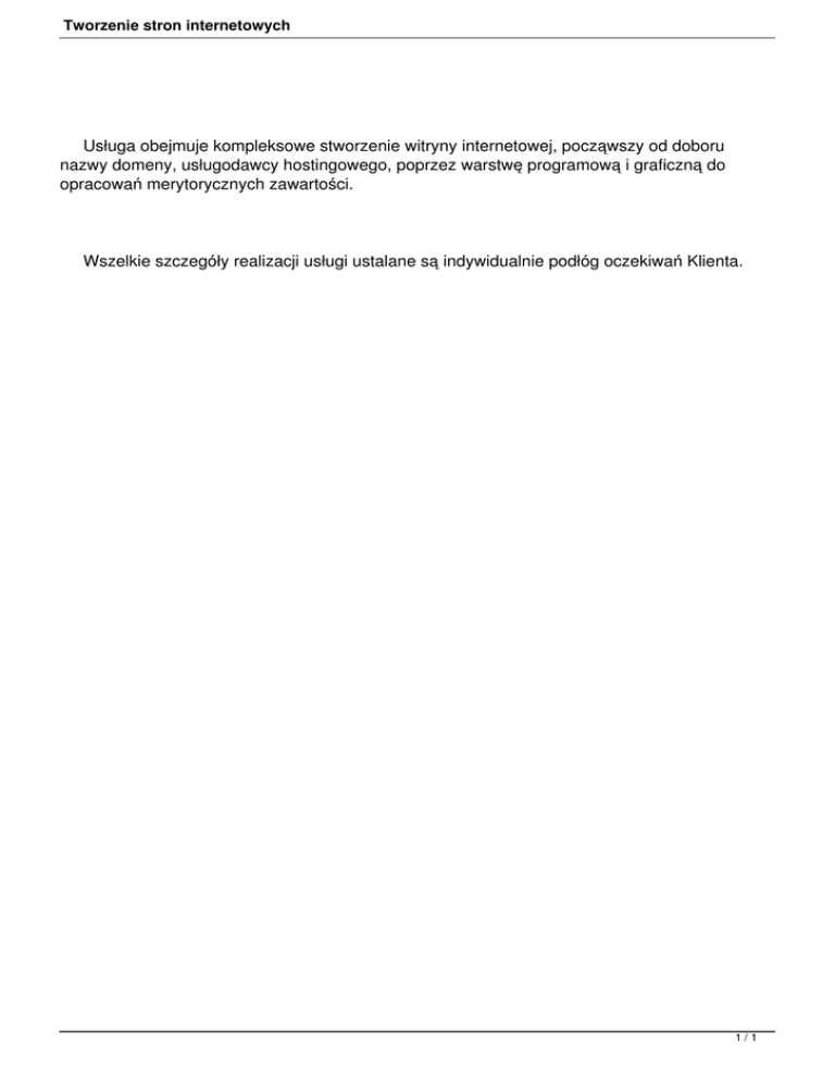 Tworzenie stron internetowych Usługa obejmuje kompleksowe stworzenie witryny internetowej, począwszy od doboru nazwy domeny, usługodawcy hostingowego, poprzez warstwę programową i graficzną do opracowań merytorycznych zawartości. Wszelkie szczegóły realizacji usługi ustalane są indywidualnie podłóg oczekiwań Klienta. 1/1