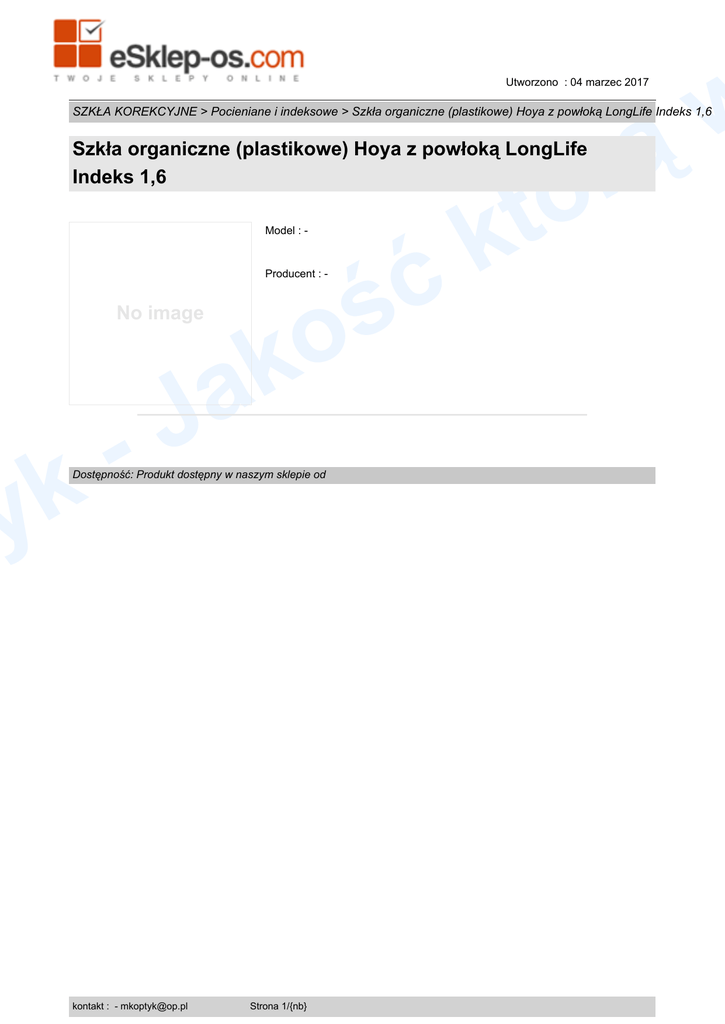 w ą Utworzono : 04 marzec 2017 SZKŁA KOREKCYJNE > Pocieniane i indeksowe > Szkła organiczne (plastikowe) Hoya z powłoką LongLife Indeks 1,6 r ó t Szkła organiczne (plastikowe) Hoya z powłoką LongLife Indeks 1,6 k ć Model : - ś o Producent : - No image k y J - k a Dostępność: Produkt dostępny w naszym sklepie od kontakt : - [email protected] Strona 1/{nb}