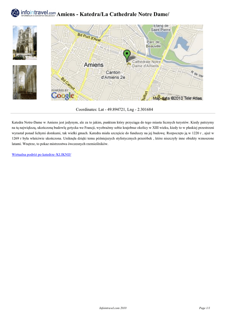 Amiens - Katedra/La Cathedrale Notre Dame/ Coordinates: Lat - 49.894721, Lng - 2.301684 Katedra Notre-Dame w Amiens jest jedynym, ale za to jakim, punktem który przyciąga do tego miasta licznych turystów. Kiedy patrzymy na tą największą, ukończoną budowlę gotycka we Francji, wyobraźmy sobie krajobraz okolicy w XIII wieku, kiedy to w płaskiej przestrzeni wyrastał ponad lichymi domkami, tak wielki gmach. Katedra miała szczęście do funduszy na jej budowę. Rozpoczęto ją w 1220 r , ajuż w 1269 r była właściwie ukończona. Uniknęła dzięki temu późniejszych stylistycznych przeróbek , które niszczyły inne obiekty wznoszone latami. Wnętrze, to pokaz mistrzostwa ówczesnych rzemieślników. Wirtualna podróż po katedrze /KLIKNIJ/ Infointravel.com 2010 Page 1/1