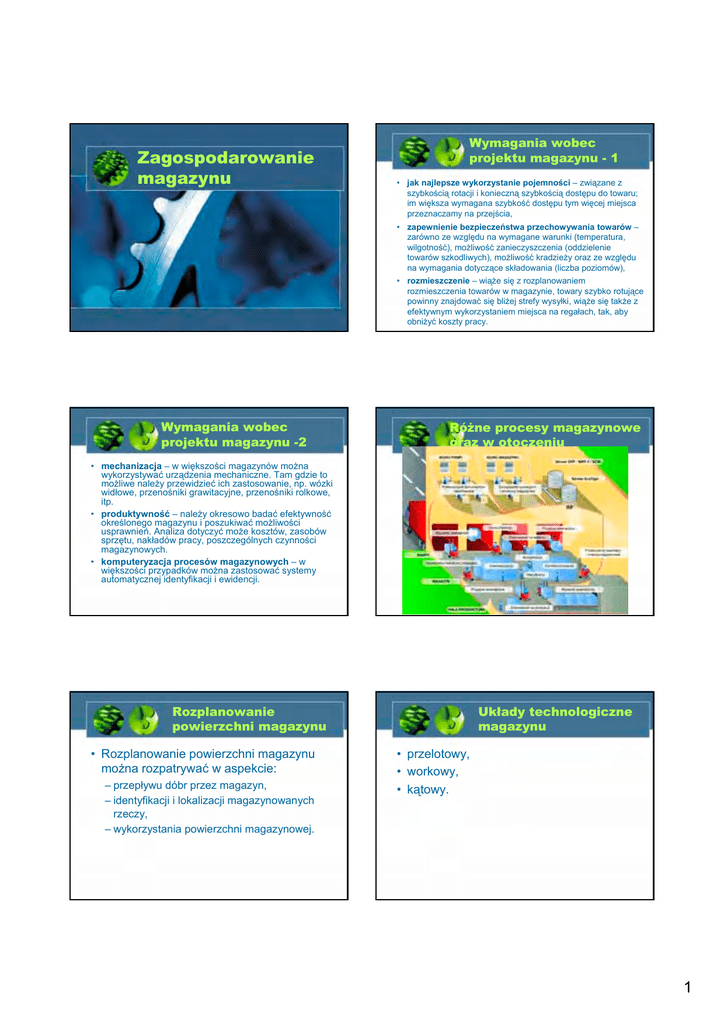Zagospodarowanie magazynu Wymagania wobec projektu magazynu - 1 • jak najlepsze wykorzystanie pojemności – związane z szybkością rotacji i konieczną szybkością dostępu do towaru; im większa wymagana szybkość dostępu tym więcej miejsca przeznaczamy na przejścia, • zapewnienie bezpieczeństwa przechowywania towarów – zarówno ze względu na wymagane warunki (temperatura, wilgotność), możliwość zanieczyszczenia (oddzielenie towarów szkodliwych), możliwość kradzieży oraz ze względu na wymagania dotyczące składowania (liczba poziomów), • rozmieszczenie – wiąże się z rozplanowaniem rozmieszczenia towarów w magazynie, towary szybko rotujące powinny znajdować się bliżej strefy wysyłki, wiąże się także z efektywnym wykorzystaniem miejsca na regałach, tak, aby obniżyć koszty pracy. Wymagania wobec projektu magazynu -2 Różne procesy magazynowe oraz w otoczeniu • mechanizacja – w większości magazynów można wykorzystywać urządzenia mechaniczne. Tam gdzie to możliwe należy przewidzieć ich zastosowanie, np. wózki widłowe, przenośniki grawitacyjne, przenośniki rolkowe, itp. • produktywność – należy okresowo badać efektywność określonego magazynu i poszukiwać możliwości usprawnień. Analiza dotyczyć może kosztów, zasobów sprzętu, nakładów pracy, poszczególnych czynności magazynowych. • komputeryzacja procesów magazynowych – w większości przypadków można zastosować systemy automatycznej identyfikacji i ewidencji. Rozplanowanie powierzchni magazynu • Rozplanowanie powierzchni magazynu można rozpatrywać w aspekcie: – przepływu dóbr przez magazyn, – identyfikacji i lokalizacji magazynowanych rzeczy, – wykorzystania powierzchni magazynowej. Układy technologiczne magazynu • przelotowy, • workowy, • kątowy. 1 Strefy magazynu • wyróżnia się następujące, podstawowe strefy magazynu: – przyjęć, – składowania, – kompletacji, – wydania. Strefa przyjęć • przestrzeń wydzielona do czynności związanych z przyjęciem towaru do magazynu Strefa składowania • przestrzeń wydzielona do składowania towarów, • w tej strefie może się także odbywać kompletacja. Strefa kompletacji • przestrzeń wydzielona do przeprowadzania kompletacji towarów (o ile kompletacja nie odbywa się bezpośrednio w strefie składowania). Strefa kompletacji • ta strefa jest wydzielana ze względu na możliwość skrócenia czasu kompletacji, 2 Układ przelotowy Lokalizacja materiałów w zależności od ich rotacji • Klasyfikacja materialów może być wykonana np. techniką ABC lub XYZ Układ workowy ze wspólna stref a przyjęć i wydań Voice picking PW – strefa przyjęć, wydań, S – strefa składowania 3 Strefa wydań Stefa wydań • przestrzeń wydzielona do czynności związanych z wydaniem i ekspedycją towarów. Strefa składowania • jest to podstawowa strefa w magazynach. • w tej strefie można zastosować różne technologie składowania: – rzędowe, – blokowe, Metody planowania strefy kompletowania i przygotowania towaru • Metoda prostego podziału na strefy – przewiduje wydzielenie oddzielnych stanowisk do składowania i do kompletowania, z tym, że strefa kompletowania jest zwykle mniejsza niż strefa składowania. • Pozwala to na skrócenie czasu kompletownia i przyśpiesza dostęp do towaru, zmniejsza jednak elastyczność obiektu. Metody planowania strefy kompletowania i przygotowania towaru • Metoda jednej strefy – polega na tym, że łączy się strefę kompletacji i przygotowywania towarów według zamówień ze strefą składowania Metody planowania strefy kompletowania i przygotowania towaru • Metoda podziału na strefę aktywną i rezerwową – polega na wydzieleniu dwóch stref składowania, aktywnej i rezerwowej. • W pierwszej kolejności zapełniana jest strefa składowania aktywnego, w której zachodzą również procesy kompletacji. • Dopiero w przypadku obniżenia się zapasów w tej strefie poniżej określonego poziomu następuje jego uzupełnienie z zapasów w strefie rezerwowej. 4 Technologie składowania • najczęściej spotyka się dwa sposoby składowania: – rzędowe, – blokowe Wady składowania rzędowego • duża liczba dróg transportowych, • niski wskaźnik wykorzystania powierzchni magazynowej (25-60%) Zalety składowania blokowego • wysoki poziom wykorzystania powierzchni magazynu (50-80%) Zalety składowania rzędowego • swobodny dostęp do każdego asortymentu i przeważnie do każdej jednostki ładunkowej, • czytelne rozmieszczenie jednostek ładunkowych • prosta organizacja prac. Składowanie blokowe • Polega na ułożeniu jednostek ładunkowych w magazynie bez dróg transportowych między jednostkami. • Tworzone są bloki ładunku składające się z kilku rzędów. Wady składowania blokowego • brak bezpośredniego dostępu do jednostek ładunkowych nie znajdujących się z boku bloku, • trudności w spełnieniu wymagań kolejki FIFO 5 Moduły magazynowe Moduł magazynowy • moduł magazynowy to część powierzchni magazynu obejmująca rzut poziomy najmniejszej powtarzalnej jednostki dwóch rzędów lub bloków jednostek ładunkowych wraz z luzami manipulacyjnymi przy składowaniu i drogę manipulacyjną między nimi. Moduł magazynowy to: • dwa pola odkładcze dla składowania rzędowego bez urządzeń, • dwa bloki pól odkładczych dla składowania blokowego, • dwie kolumny regałów ramowych stałych. Układ workowy • Magazyn w układzie workowym, składowanie w blokach, • oraz szerokość drogi manipulacyjnej Przebieg granicy między towarami w blokach 6