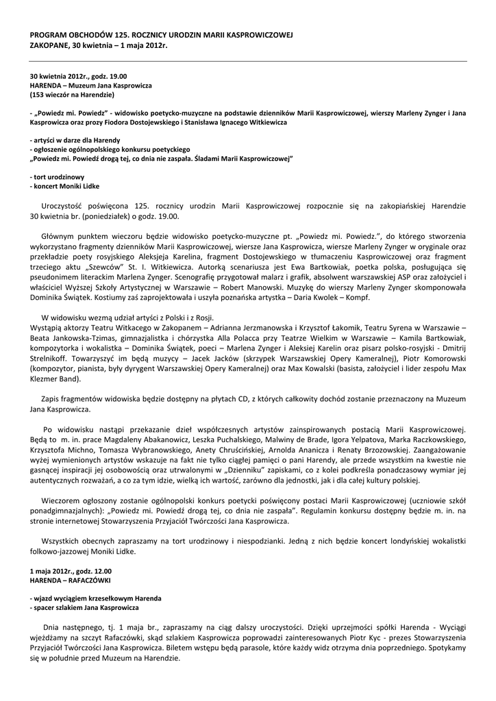 PROGRAM OBCHODÓW 125. ROCZNICY URODZIN MARII KASPROWICZOWEJ ZAKOPANE, 30 kwietnia – 1 maja 2012r. 30 kwietnia 2012r., godz. 19.00 HARENDA – Muzeum Jana Kasprowicza (153 wieczór na Harendzie) - „Powiedz mi. Powiedz” - widowisko poetycko-muzyczne na podstawie dzienników Marii Kasprowiczowej, wierszy Marleny Zynger i Jana Kasprowicza oraz prozy Fiodora Dostojewskiego i Stanisława Ignacego Witkiewicza - artyści w darze dla Harendy - ogłoszenie ogólnopolskiego konkursu poetyckiego „Powiedz mi. Powiedź drogą tej, co dnia nie zaspała. Śladami Marii Kasprowiczowej” - tort urodzinowy - koncert Moniki Lidke Uroczystość poświęcona 125. rocznicy urodzin Marii Kasprowiczowej rozpocznie się na zakopiańskiej Harendzie 30 kwietnia br. (poniedziałek) o godz. 19.00. Głównym punktem wieczoru będzie widowisko poetycko-muzyczne pt. „Powiedz mi. Powiedz.”, do którego stworzenia wykorzystano fragmenty dzienników Marii Kasprowiczowej, wiersze Jana Kasprowicza, wiersze Marleny Zynger w oryginale oraz przekładzie poety rosyjskiego Aleksjeja Karelina, fragment Dostojewskiego w tłumaczeniu Kasprowiczowej oraz fragment trzeciego aktu „Szewców” St. I. Witkiewicza. Autorką scenariusza jest Ewa Bartkowiak, poetka polska, posługująca się pseudonimem literackim Marlena Zynger. Scenografię przygotował malarz i grafik, absolwent warszawskiej ASP oraz założyciel i właściciel Wyższej Szkoły Artystycznej w Warszawie – Robert Manowski. Muzykę do wierszy Marleny Zynger skomponowała Dominika Świątek. Kostiumy zaś zaprojektowała i uszyła poznańska artystka – Daria Kwolek – Kompf. W widowisku wezmą udział artyści z Polski i z Rosji. Wystąpią aktorzy Teatru Witkacego w Zakopanem – Adrianna Jerzmanowska i Krzysztof Łakomik, Teatru Syrena w Warszawie – Beata Jankowska-Tzimas, gimnazjalistka i chórzystka Alla Polacca przy Teatrze Wielkim w Warszawie – Kamila Bartkowiak, kompozytorka i wokalistka – Dominika Świątek, poeci – Marlena Zynger i Aleksiej Karelin oraz pisarz polsko-rosyjski - Dmitrij Strelnikoff. Towarzyszyć im będą muzycy – Jacek Jacków (skrzypek Warszawskiej Opery Kameralnej), Piotr Komorowski (kompozytor, pianista, były dyrygent Warszawskiej Opery Kameralnej) oraz Max Kowalski (basista, założyciel i lider zespołu Max Klezmer Band). Zapis fragmentów widowiska będzie dostępny na płytach CD, z których całkowity dochód zostanie przeznaczony na Muzeum Jana Kasprowicza. Po widowisku nastąpi przekazanie dzieł współczesnych artystów zainspirowanych postacią Marii Kasprowiczowej. Będą to m. in. prace Magdaleny Abakanowicz, Leszka Puchalskiego, Malwiny de Brade, Igora Yelpatova, Marka Raczkowskiego, Krzysztofa Michno, Tomasza Wybranowskiego, Anety Chruścińskiej, Arnolda Ananicza i Renaty Brzozowskiej. Zaangażowanie wyżej wymienionych artystów wskazuje na fakt nie tylko ciągłej pamięci o pani Harendy, ale przede wszystkim na kwestie nie gasnącej inspiracji jej osobowością oraz utrwalonymi w „Dzienniku” zapiskami, co z kolei podkreśla ponadczasowy wymiar jej autentycznych rozważań, a co za tym idzie, wielką ich wartość, zarówno dla jednostki, jak i dla całej kultury polskiej. Wieczorem ogłoszony zostanie ogólnopolski konkurs poetycki poświęcony postaci Marii Kasprowiczowej (uczniowie szkół ponadgimnazjalnych): „Powiedz mi. Powiedź drogą tej, co dnia nie zaspała”. Regulamin konkursu dostępny będzie m. in. na stronie internetowej Stowarzyszenia Przyjaciół Twórczości Jana Kasprowicza. Wszystkich obecnych zapraszamy na tort urodzinowy i niespodzianki. Jedną z nich będzie koncert londyńskiej wokalistki folkowo-jazzowej Moniki Lidke. 1 maja 2012r., godz. 12.00 HARENDA – RAFACZÓWKI - wjazd wyciągiem krzesełkowym Harenda - spacer szlakiem Jana Kasprowicza Dnia następnego, tj. 1 maja br., zapraszamy na ciąg dalszy uroczystości. Dzięki uprzejmości spółki Harenda - Wyciągi wjeżdżamy na szczyt Rafaczówki, skąd szlakiem Kasprowicza poprowadzi zainteresowanych Piotr Kyc - prezes Stowarzyszenia Przyjaciół Twórczości Jana Kasprowicza. Biletem wstępu będą parasole, które każdy widz otrzyma dnia poprzedniego. Spotykamy się w południe przed Muzeum na Harendzie.