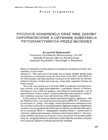 Poczucie koherencji oraz irme zasoby odpornościowe a używanie substancji ".