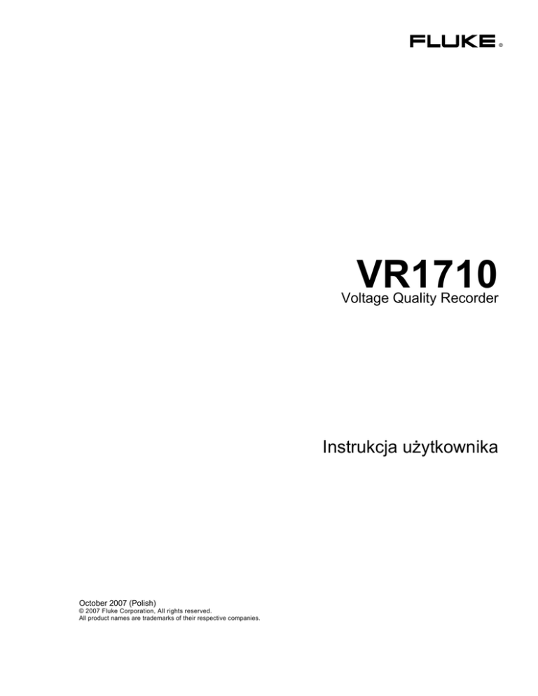 ® VR1710 Voltage Quality Recorder Instrukcja użytkownika October 2007 (Polish) © 2007 Fluke Corporation, All rights reserved. All product names are trademarks of their respective companies. OGRANICZONA GWARANCJA I OGRANICZENIE ODPOWIEDZIALNOŚCI Każdy produkt firmy Fluke posiada gwarancje na brak usterek materiałowych i produkcyjnych w warunkach normalnego użytkowania i konserwacji. Okres gwarancji obejmuje jeden rok i rozpoczyna się w dniu wysłania produktu. Części, naprawy produktu oraz serwisowanie są objęte gwarancją przez 90 dni. Niniejsza gwarancja obejmuje jedynie oryginalnego nabywcę lub użytkownika końcowego będącego klientem autoryzowanego sprzedawcy firmy Fluke i nie obejmuje bezpieczników, jednorazowych baterii lub żadnych innych produktów, które, w opinii firmy Fluke, były używane niezgodnie z ich przeznaczeniem, modyfikowane, zaniedbane, zanieczyszczone lub uszkodzone przez przypadek lub w wyniku nienormalnych warunków użytkowania lub obsługiwania. Firma Fluke gwarantuje zasadnicze działanie oprogramowania zgodnie z jego specyfikacjami funkcjonalności przez 90 dni oraz, że zostało ono prawidłowo nagrane na wolnym od usterek nośniku. Firma Fluke nie gwarantuje, że oprogramowanie będzie wolne od błędów lub że będzie działać bez przerwy. Autoryzowani sprzedawcy firmy Fluke przedłużą niniejszą gwarancję na nowe i nieużywane produkty jedynie dla swoich klientów będących użytkownikami końcowymi, jednak nie będą posiadać uprawnień do przedłużenia obszerniejszej lub innej gwarancji w imieniu firmy Fluke. Wsparcie gwarancyjne jest dostępne jedynie w przypadku, gdy produkt został zakupiony w autoryzowanym punkcie sprzedaży firmy Fluke lub Nabywca zapłacił odpowiednią cenę międzynarodową. Firma Fluke rezerwuje sobie prawo do zafakturowania na Nabywcę kosztów importu części do naprawy/wymiany w przypadku, gdy produkt nabyty w jednym kraju zostanie oddany do naprawy w innym kraju. Zobowiązania gwarancyjne firmy Fluke są ograniczone, według uznania firmy Fluke, do zwrotu kosztów zakupu, darmowej naprawy lub wymiany wadliwego produktu, który zostanie zwrócony do autoryzowanego centrum serwisowego firmy Fluke przed upływem okresu gwarancyjnego. Aby skorzystać z usługi gwarancyjnej, należy skontaktować się z najbliższym autoryzowanym centrum serwisowym firmy Fluke w celu uzyskania zwrotnej informacji autoryzacyjnej, a następnie przesłać produkt do tego centrum serwisowego wraz z opisem problemu, zwrotną kopertą ze znaczkami oraz opłaconym ubezpieczeniem (miejsce docelowe FOB). Firma Fluke nie jest odpowiedzialna za wszelkie uszkodzenia powstałe w czasie transportu. Po naprawie gwarancyjnej produkt zostanie zwrócony Nabywcy przy wcześniej opłaconym transporcie (miejsce docelowe FOB). Jeśli firma Fluke dojdzie do wniosku, że usterka została spowodowana przez zaniedbanie, niewłaściwe użytkowanie, zanieczyszczenie, modyfikacje lub nienormalne warunki użytkowania lub obsługi, łącznie z przepięciami spowodowanymi użytkowaniem urządzenia w środowisku przekraczającym jego wyszczególnione zakresy pracy lub normalne zużycie części mechanicznych, firma Fluke zapewni szacunkowe wartości kosztów naprawy i uzyska upoważnienie przed rozpoczęciem pracy. Po zakończeniu naprawy, produkt zostanie zwrócony Nabywcy przy wcześniej opłaconym transporcie i Nabywca zostanie obciążony kosztami naprawy i transportu zwrotnego (punkt wysłania FOB). NINIEJSZA GWARANCJA STANOWI JEDYNE I WYŁĄCZNE ZADOŚĆUCZYNIENIE DLA NABYWCY W MIEJSCE WSZYSTKICH INNYCH GWARANCJI, WYRAŹNYCH LUB DOROZUMIANYCH, OBEJMUJĄCYCH, ALE NIE OGRANICZONYCH DO ŻADNEJ DOROZUMIANEJ GWARANCJI ZBYWALNOŚCI LUB ZDATNOŚCI DO DANEGO CELU. FIRMA FLUKE NIE BĘDZIE ODPOWIEDZIALNA ZA ŻADNE SPECJALNE, POŚREDNIE, PRZYPADKOWE LUB NASTĘPUJĄCE STRATY, ŁĄCZNIE Z UTRATĄ DANYCH, WYNIKAJĄCE Z JAKIEJKOLWIEK PRZYCZYNY LUB TEORII. Ponieważ niektóre kraje lub stany nie zezwalają na ograniczenie terminu dorozumianej gwarancji lub wyłączenia, lub ograniczenia przypadkowych, lub następujących strat, ograniczenia i wyłączenia z niniejszej gwarancji mogą nie mieć zastosowania dla każdego nabywcy. Jeśli którykolwiek z przepisów niniejszej Gwarancji zostanie podważony lub niemożliwy do wprowadzenia przez sąd lub inny kompetentny organ decyzyjny odpowiedniej jurysdykcji, nie będzie to mieć wpływu na obowiązywanie wszystkich innych przepisów niniejszej Gwarancji. Fluke Corporation P.O. Box 9090 Everett, WA 98206-9090 U.S.A. Fluke Europe B.V. P.O. Box 1186 5602 BD Eindhoven Holandia 11/99 Aby zarejestrować produkt przez Internet, proszę przejść do witryny pod adresem http://register.fluke.com. Spis treści Tytuł Strona Wstęp ................................................................................................................. Kontakt z firmą Fluke ........................................................................................ Informacje na temat bezpieczeństwa ................................................................. Wyposażenie standardowe................................................................................. Omówienie rejestratora...................................................................................... Używanie rejestratora ........................................................................................ Konfigurowanie rejestratora .......................................................................... Ładowanie oprogramowania Power Log .................................................. Ładowanie sterownika USB...................................................................... Ustawianie daty i godziny ......................................................................... Podłączanie rejestratora po raz pierwszy .................................................. Zmiana ustawień rejestratora za pomocą oprogramowania Power Log.... Gromadzenie