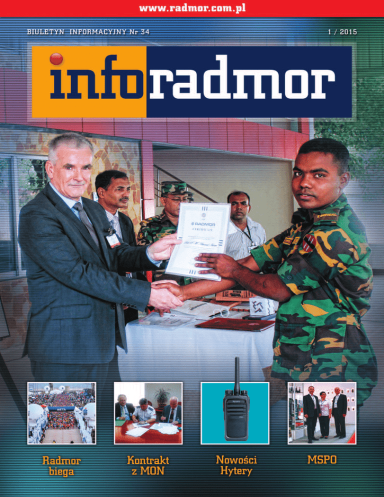 Z. Furman, dyr. ds. handlu i marketingu, wręcza dyplom uczestnikowi szkolenia w Bangladeszu (więcej na str. 5) Marek Cichowski Szef Biura Obsługi Klienta tel.: 58/69 96 660 fax.: 58/69 96 662 [email protected] ➤➤ W SKRÓCIE Spis treści WB Electronics właścicielem Radmoru 3 Radiostacja F@stnet dla Sił Zbrojnych RP 3 Lista 2000 i Gazele 4 Kolejna dostawa dla Bangladeszu 5 Międzynarodowe testy interoperacyjności w programie ESSOR 6 TETRA dla energetyki 8 Spotkanie dystrybutorów firmy HyTERA 10 Cyfrowe radia dla profesjonalistów i osób prywatnych 11 Suwerenność dysponowanych środków obrony zależy od suwerenności wykorzystywanych środków łączności 14 Tropikalne targi 17 Targi w Emiratach Arabskich 18 Targowa jesień 19 Laserem w radiostacje 21 RADMOR biega, jeździ, maszeruje 22 BIURO OBSŁUGI KLIENTA Pracownicy Biura Obsługi Klienta są do dyspozycji naszych Klientów w dni powszednie od godziny 7.00 do godziny 16.00. Ich zadaniem jest sprawne i szybkie reagowanie na potrzeby klientów z poszczególnych branż. Firmy lub instytucje, które zamierzają dokonać zakupu naszego sprzętu mogą go wypożyczyć w celu przetestowania w warunkach rzeczywistych. W każdej sprawie prosimy kontaktować się z poszczególnymi menedżerami. 2• K W I E C I E Ń 2 0 1 5 Lucyna Zelewska Sekretariat BOK tel.: 58/69 96 666 fax: 58/69 96 662 [email protected] [email protected] Andrzej Wysocki Menedżer ds. Klientów Kluczowych tel.: 58/69 96 668 [email protected] Policja, Państwowa Straż Pożarna, Straż Graniczna, Centra Zarządzania Kryzysowego, Komendy Straży Miejskich, Służba Więzienna, administracja państwowa. Jowita Gotówko Menedżer ds. Klientów Profesjonalnych tel.: 58/69 96 669 [email protected] Zarządy portów lotniczych i morskich, energetyka, gazownictwo, służba zdrowia, firmy ochrony mienia i osób, przedsiębiorstwa gospodarki komunalnej, firmy transportowe i taksówkowe, poczta i inne. Elżbieta Krysztofiak Menedżer ds. Klientów Wojskowych tel.: 58/69 96 659 [email protected] Ministerstwo Obrony Narodowej, Żandarmeria Wojskowa, jednostki wojskowe oraz zakłady przemysłowe i instytuty pracujące na rzecz wojska. Tomasz Onak Menedżer Projektów Eksportowych tel.: 58/69 96 625 [email protected] Klienci z zagranicy. Kontakt w języku angielskim. WB Electronics 99% akcji właścicielem Radmoru Kontrakt z MON Radiostacje F@stnet dla Sił Zbrojnych RP Radmor od 1997 roku dostarcza Polskiej Armii radiostacje systemu PR4G opracowane przez francuską firmę Thales. Produkcja licencyjnych radiostacji rozpoczęła się od radiostacji plecakowych RRC 9200 i pokładowych RRC 9500. W 2006 roku podjęliśmy produkcję radiostacji następnej generacji o nazwie F@stnet – plecakowe RRC9210 i pokładowe RRC9310. Na kolejne dostawy podpisywane były wieloletnie umowy z Ministerstwem Obrony Narodowej. Radiostacje z rodziny PR4G stanowią trzon łączności wąskopasmowej VHF nie tylko w Polsce ale również w kilkunastu armiach europejskich Małgorzata Zeman Dział Marketingu We wrześniu 2014 r. w siedzibie Inspektoratu Uzbrojenia podpisano kolejną umowę na dostawy radiostacji UKF RRC 9211 i RRC 9311 AP. W latach 2014 – 2017 Radmor zaopatrzy Siły Zbrojne RP w 420 kompletów radiostacji plecakowych RRC 9211 i 41 kompletów radiostacji pokladowych RRC 9311 AP. Wartość umowy wynosi ok. 66 mln zł. Radiostacje plecakowe RRC 9211 i pokładowe RRC 9311 AP przeznaczone są do zapewnienia jawnej i utajnionej łączności radiowej w zakresie transmisji mowy, danych oraz transmisji pakietów IP. Mogą współpracować z innymi radiostacjami pokładowymi, plecakowymi i stacjonarnymi rodziny PR4G oraz w trybie pracy analogowej z radiostacjami taktycznymi zakresu VHF, zgodnie ze STANAG 4204. Dodatkowo radiostacje pokładowe RRC 9311 AP mogą być instalowane na pojazdach wojskowych dowolnego typu lub pracować jako urządzenia stacjonarne. Umowa z MON została podpisana w Inspektoracie Uzbrojenia (od lewej stoją: A. Hillar, dyr. ds. finansowych Radmoru; płk M .Soczyński, Szefostwo Dowodzenia i Łączności Inspektoratu Uzbrojenia; A. Synowiecki, prezes Radmoru) K W I E C I E Ń 2 0 1 5 •3 SKRÓCIE Na początku WB Electronics S.A. objął 46,14% kapitału zakładowego Radmoru; reszta akcji była w posiadaniu Polskiego Holdingu Obronnego i pracowników firmy. W 2011 roku ożarowska firma odkupiła część akcji od pracowników i stała się większościowym właścicielem Radmoru (53%). Pod koniec zeszłego roku spółka WBE część funduszy uzyskanych z emisji obligacji przeznaczyła na odkupienie akcji od PHO. Dzięki tej transakcji WBE stało się 99-procentowym właścicielem Radmoru. Cała Grupa WB zatrudnia ponad 700 osób, z czego połowa to pracownicy naszej firmy. Radmor będzie centralnym ośrodkiem produkcyjnym grupy. Małgorzata Zeman Dział Marketingu W Proces budowania konsorcjów kapitałowych skupiających polskie przedsiębiorstwa produkujące na rzecz obronności kraju trwa już od wielu lat. W 2010 roku firma WB ELECTRONICS, jedna z ważniejszych firm polskiego rynku zbrojeniowego, rozpoczęła proces konsolidacji polskich elektronicznych firm zbrojeniowych. W 2011 roku w skład grupy budowanej przez WBE włączony został również RADMOR. W chwili obecnej w jej skład wchodzi 5 firm elektronicznych – są to WB Electronics S. A., RADMOR S. A., Flytronic sp. z o. o., MindMade sp. z o. o oraz AREX sp. z o.o. Radmor w rankingach Lista 2000 i W SKRÓCIE RADMOR od kilku lat jest na czele listy najbardziej innowacyjnych firm w prowadzonym przez Rzeczpospolitą corocznym rankingu polskich firm „Lista 2000”. Cała „Lista 2000” to zestawienie polskich firm ocenianych w różnych kategoriach: najbardziej rentownych, największych eksporterów, osiągających największe zyski, najwięcej inwestujących, zwiększających zatrudnienie itp. W porównaniu z takimi gigantami jak Orlen, Lotos czy KGHM, RADMOR to firma niewielka i nie mająca tak wielkich 