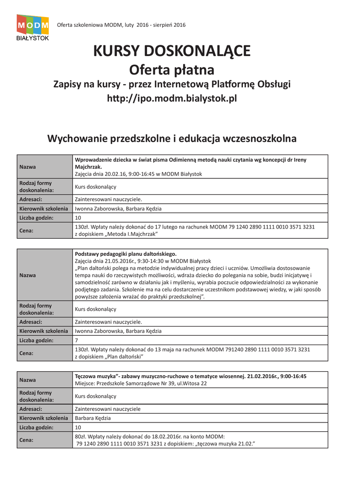 Oferta szkoleniowa MODM, luty 2016 - sierpień 2016 KURSY DOSKONALĄCE Oferta płatna Zapisy na kursy - przez Internetową Platformę Obsługi http://ipo.modm.bialystok.pl Wychowanie przedszkolne i edukacja wczesnoszkolna Nazwa Wprowadzenie dziecka w świat pisma Odimienną metodą nauki czytania wg koncepcji dr Ireny Majchrzak. Zajęcia dnia 20.02.16, 9:00-16:45 w MODM Białystok Rodzaj formy doskonalenia: Kurs doskonalący Adresaci: Zainteresowani nauczyciele. Kierownik szkolenia Iwonna Zaborowska, Barbara Kędzia Liczba godzin: 10 Cena: 130zł. Wpłaty należy dokonać do 17 lutego na rachunek MODM 79 1240 2890 1111 0010 3571 3231 z dopiskiem „Metoda I.Majchrzak” Nazwa Podstawy pedagogiki planu daltońskiego. Zajęcia dnia 21.05.2016r., 9:30-14:30 w MODM Białystok „Plan daltoński polega na metodzie indywidualnej pracy dzieci i uczniów. Umożliwia dostosowanie tempa nauki do rzeczywistych możliwości, wdraża dziecko do polegania na sobie, budzi inicjatywę i samodzielność zarówno w działaniu jak i myśleniu, wyrabia poczucie odpowiedzialności za wykonanie podjętego zadania. Szkolenie ma na celu dostarczenie uczestnikom podstawowej wiedzy, w jaki sposób powyższe założenia wrażać do praktyki przedszkolnej”. Rodzaj formy doskonalenia: Kurs doskonalący Adresaci: Zainteresowani nauczyciele. Kierownik szkolenia Iwonna Zaborowska, Barbara Kędzia Liczba godzin: 7 Cena: 130zł. Wpłaty należy dokonać do 13 maja na rachunek MODM 791240 2890 1111 0010 3571 3231 z dopiskiem „Plan daltoński” Nazwa Tęczowa muzyka”- zabawy muzyczno-ruchowe o tematyce wiosennej. 21.02.2016r., 9:00-16:45 Miejsce: Przedszkole Samorządowe Nr 39, ul.Witosa 22 Rodzaj formy doskonalenia: Kurs doskonalący Adresaci: Zainteresowani nauczyciele Kierownik szkolenia Barbara Kędzia Liczba godzin: 10 Cena: 80zł. Wpłaty należy dokonać do 18.02.2016r. na konto MODM: 79 1240 2890 1111 0010 3571 3231 z dopiskiem: „tęczowa muzyka 21.02.” Oferta szkoleniowa MODM, luty 2016 - sierpień 2016 Nazwa Tęczowa muzyka”- zabawy muzyczno-ruchowe o tematyce wiosennej. 28.02.2016r., 9:00-16:45 Miejsce: Przedszkole Samorządowe Nr 39, ul.Witosa 22 Rodzaj formy doskonalenia: Kurs doskonalący Adresaci: Zainteresowani nauczyciele Kierownik szkolenia Barbara Kędzia Liczba godzin: 10 Cena: 80zł. Wpłaty należy dokonać do 24.02.2016r. na konto MODM: 79 1240 2890 1111 0010 3571 3231 z dopiskiem: „tęczowa muzyka 28.02.” Nazwa Tęczowa muzyka”- zabawy muzyczno-ruchowe o tematyce wiosennej. 6.03.2016r., 9:00-16:45 Miejsce: Przedszkole Samorządowe Nr 39, ul.Witosa 22 Rodzaj formy doskonalenia: Kurs doskonalący Adresaci: Zainteresowani nauczyciele Kierownik szkolenia Barbara Kędzia Liczba godzin: 10 Cena: 80zł. Wpłaty należy dokonać do 2.03.2016r. na konto MODM: 79 1240 2890 1111 0010 3571 3231 z dopiskiem: „tęczowa muzyka 6.03.” Nazwa Jak radzić sobie z niepożądanymi zachowaniami u małych dzieci ? (do 5 roku życia). Zajęcia w dniu 17.05.2016r. , godz. 9:30 - 12:30 w MODM Białystok Rodzaj formy doskonalenia: Warsztat Adresaci: Zainteresowani nauczyciele Kierownik szkolenia Barbara Kędzia Liczba godzin: 4 Cena: 70zł. Wpłaty należy dokonać do 13.05.2016r. na konto MODM: 79 1240 2890 1111 0010 3571 3231 z dopiskiem: „zachowania dzieci 17.05” Nazwa Jak radzić sobie z niepożądanymi zachowaniami u małych dzieci ? (do 5 roku życia). Zajęcia w dniu 18.05.2016r., godz. 9:30 - 12:30 w MODM Białystok Rodzaj formy doskonalenia: Warsztat Adresaci: Zainteresowani nauczyciele Kierownik szkolenia Barbara Kędzia Liczba godzin: 10 Cena: 80zł. Wpłaty należy dokonać do 13.05.2016r. na konto MODM: 79 1240 2890 1111 0010 3571 3231 z dopiskiem: „zachowania dzieci 18.05” Nazwa Zabawy ruchowe w nauczaniu języka angielskiego w edukacji wczesnoszkolnej. Rodzaj formy doskonalenia: warsztaty Adresaci: Nauczyciele przedszkoli i edukacji wczesnoszkolnej Kierownik szkolenia Mariusz Truszkowski Liczba godzin: 6 Cena: 100 zł Oferta szkoleniowa MODM, luty 2016 - sierpień 2016 Nazwa Natural First Steps (N1S) – założenia metody oraz jej praktyczna strona. (we współpracy z „Kuźnią Talentów” Centrum Kreatywnego Rozwoju Dzieci i Młodzieży) Rodzaj formy doskonalenia: warsztaty Adresaci: Nauczyciele przedszkoli i edukacji wczesnoszkolnej Kierownik szkolenia Mariusz Truszkowski Liczba godzin: 11 Cena: 20 zł od osoby Nazwa „Świat muzyki cz. I – zabawy, piosenki, ćwiczenia rytmiczne, tańce dla dzieci w wieku wczesnoszkolnym na różne okazje”. (piosenki i układy taneczne na Dzień Matki, zakończenie roku, Dzień Dziecka, itp.) Zajęcia 24.04.2016, godz. 9:00-16:30 w MODM Białystok. (wskazana zmiana obuwia) Rodzaj formy doskonalenia: Kurs doskonalący Adresaci: Nauczyciele edukacji wczesnoszkolnej, świetlicy Kierownik szkolenia Celina Borowska Liczba godzin: 10 Cena: 80 zł. Wpłaty należy dokonać na konto MODM. Nr konta:79 1240 2890 1111 0010 3571 3231 z dopiskiem: Świat muzyki cz. I Nazwa "Poznaj tajniki muzyki - zabawy rytmiczno muzyczne dla dzieci klas I-III wprowadzające elementy muzyki: nuty, wartości muzyczne, dynamika, elementy i budowa dzieła muzycznego.” Zajęcia 19.03.2016, godz. 9:00-16:30 w MODM Białystok. (wskazana zmiana obuwia) Rodzaj formy doskonalenia: Kurs doskonalący Adresaci: Nauczyciele edukacji wczesnoszkolnej, świetlicy Kierownik szkolenia Celina Borowska Liczba godzin: 10 Cena: 80 zł. Wpłaty należy dokonać na konto MODM. Nr konta:79 1240 2890 1111 0010 3571 3231 z dopiskiem: Poznaj tajniki muzyki Praktyczne metody twórczego nauczania - Trener w międzynarodowym programie kreatywności Destination Imagination- Oczyma Wyobraźni. Zajęcia w dniach: 13.02.16 (sobota) 9:00-17:00, 14.02.16 (niedziela) Nazwa 9:00-16:00. w MODM Białystok. Prowadzący: Fundacja Wspierania i Rozwoju. Kreatywności - licencjonowany partner międzynarodowej organizacji Destination Imagination Inc. posiadający wyłączność na prowadzenie w Polsce między