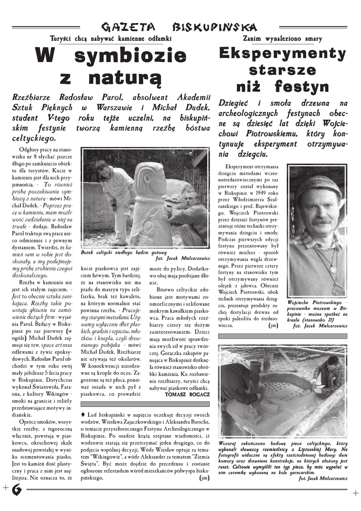 Turyści chcą nabyw ać kamienne odłamki nabywać Zanim wynaleziono smary W symbiozie z naturą Eksperymenty starsze niż festyn Rzeźbiarze Radosław Parol, absolwent Akademii Sztuk Pięknych w W arszawie i Michał Dudek, Warszawie student V −tego roku tejże uczelni, na biskupiń− V−tego skim festynie tworzą kamienną rzeźbę bóstwa celtyckiego. Odgłosy pracy na stano− wisku nr 8 słychać jeszcze długo po zamknięciu obiek− tu dla turystów. Kucie w kamieniu jest dla nich przy− jemnością. − To również próba poszukiwania sym− biozy z naturą − mówi Mi− chał Dudek. − Poprzez pra− cę w kamieniu, mam możli− wość zadziałania w niej na trwałe − dodaje. Radosław Parol traktuje swą pracę nie− co odmiennie i z pewnym dystansem. Twierdzi, że ka− mień sam w sobie jest do− skonały, a my podejmuje− my próbę zrobienia czegoś doskonalszego. Rzeźba w kamieniu nie jest ich stałym zajęciem. − Jest to obecnie sztuka zani− kająca. Rzeźby takie po− wstają głównie na zamó− wienie dużych firm − wyjaś− nia Parol. Będący w Bisku− pinie po raz pierwszy (w ogóle) Michał Dudek zaj− muje się tzw. space art oraz odlewami z żywic epoksy− dowych. Radosław Parol ob− chodzi w tym roku swój mały jubileusz 5−lecia pracy w Biskupinie. Dotychczas wykonał Światowida, Fara− ona, z kultury Wikingów − smoki na granicie i reliefy przedstawiające motywy in− diańskie. Oprócz smoków, wszys− tkie rzeźby, z tegoroczną włącznie, powstają w pias− kowcu, okruchowej skale osadowej powstałej w wyni− ku scementowania piasku. Jest to kamień dość plasty− czny i praca z nim jest naj− lżejsza. Nie oznacza to, że Bożek celtycki niedługo będzie gotowy fot. Jacek Mielcarzewicz kucie piaskowca jest zaję− ciem łatwym. Tym bardziej, że na stanowisku nie ma prądu do maszyn typu szli− fierka, brak też kawaletu, na którym normalnie stać powinna rzeźba. − Pracuje− my starymi metodami. Uży− wamy wyłącznie dłut płas− kich, gradzin i szpiców, mło− tków i knepla, czyli drew− nianego pobijaka − mówi Michał Dudek. Rzeźbiarze nie używają też okularów. W konsekwencji nieodzo− wne są krople do oczu. Za− grożone są też płuca, ponie− waż osiada w nich pył z piaskowca, co prowadzić może do pylicy. Dodatko− wo obaj mają poobijane dło− nie. Bóstwo celtyckie zdo− bione jest motywami zo− omorficznymi i szlifowane mokrym kawałkiem piasko− wca. Praca młodych rzeź− biarzy cieszy się dużym zainteresowaniem. Dzieci mają możliwość sprawdze− nia swych sił w pracy twór− czej. Gorączka zakupów pa− nująca w Biskupinie dotknę− ła również stanowisko obró− bki kamienia. Ku rozbawie− niu rzeźbiarzy, turyści chcą nabywać piaskowe odłamki. Dziegieć i smoła drzewna na archeologicznych festynach obec− ne są dziesięć lat dzięki Wojcie− chowi Piotrowskiemu, który kon− tynuuje eksperyment otrzymywa− nia dziegciu. Eksperyment otrzymania dziegciu metodami wczes− nośredniowiecznymi po raz pierwszy został wykonany w Biskupinie w 1949 roku przez Włodzimierza Szaf− rańskiego i prof. Rajewskie− go. Wojciech Piotrowski przez dziesięć festynów pre− zentuje różne techniki otrzy− mywania dziegciu i smoły. Podczas pierwszych edycji festynu prezentowany był również mielesz − sposób otrzymywania węgla drzew− nego. Przez pierwsze cztery festyny na stanowisku tym był otrzymywany również olejek z jałowca. Obecnie Wojciech Piotrowski, obok technik otrzymywania dzieg− ciu, prezentuje produkty su− chej destylacji drewna od epoki paleolitu do średnio− wiecza. (jm) Wojciecha Piotrowskiego − pracownika muzeum w Bis− kupinie − można spotkać na kraalu (stanowsko 21) fot. Jacek Mielcarzewicz TOMASZ ROGACZ J Lud biskupiński w napięciu oczekuje decyzji swoich wodzów, Wiesława Zajączkowskiego i Aleksandra Bursche, o temacie przyszłorocznego Festynu Archeologicznego w Biskupinie. Po osadzie krążą szeptane wiadomości, iż wodzowie starają się przetrzymać jeden drugiego, co do podjęcia wspólnej decyzji. Wódz Wiesław optuje za tema− tem “Wikingowie”, a wódz Aleksander za tematem “Ziemia Święta”. Być może dojdzie do precedensu i zostanie ogłoszone referendum wśród mieszkańców półwyspu bisku− pińskiego. (jm) Wczoraj zakończono budowę pieca celtyckiego, który wykonali słowaccy rzemieślnicy z Liptovskiej Mary. Na fotografii widoczne są efekty sześciodniowej budowy: dwie komory oraz drewniane konstrukcje, na których ułożony jest ruszt. Celtowie wymyślili ten typ pieca, by móc wypalać w nim ceramikę wykonaną na kole garncarskim. fot. Jacek Mielcarzewicz