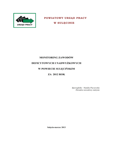 POWIATOWY URZĄD PRACY W SULĘCINIE MONITORING ZAWODÓW DEFICYTOWYCH I NADWYŻKOWYCH W POWIECIE SULĘCIŃSKIM ZA 2012 ROK Sporządziła : Natalia Paczewska Doradca zawodowy stażysta Sulęcin-marzec 2013 SPIS TREŚCI WSTĘP…………………………………………………………………...……………………………….. 3 Cel opracowania…………………………………………………………………………………………... 3 Zakres tematyczny monitoringu………………………………………………………………...………… 3 Źródła informacji………………………………………………………………………….........…………. 4 ANALIZA BEZROBOCIA WG ZAWODÓW ……………………………………………….............…. 5 Bezrobotni według zawodów (grup zawodów)……………………………………...................…...……. 5 Napływ bezrobotnych według zawodów (grup zawodów)…………………..……...……………………. 8 Bezrobotni według rodzaju działalności ostatniego miejsca pracy oraz ofert pracy……………………… 9 ANALIZA OFERT PRACY ………………………………………………………………………… 12 Analiza ofert pracy wg zawodów (grup zawodów)……………………………………….……………… 12 ANALIZA ZAWODÓW DEFICYTOWYCH I NADWYŻKOWYCH……………...………………… 14 Ranking zawodów deficytowych i nadwyżkowych…………..……………………….………………… 14 WNIOSKI…………………………………………………………………………………………………. 20 Monitoring zawodów deficytowych i nadwyżkowych w powiecie sulęcińskim za 2012 rok. 2 WSTĘP 1. Cel opracowania Zgodnie z zaleceniami metodycznymi Ministerstwa Gospodarki, Pracy i Polityki Społecznej przez monitoring zawodów deficytowych i nadwyżkowych należy rozumieć proces systematycznego obserwowania zjawisk zachodzących na rynku pracy, dotyczących kształtowania popytu na pracę i podaży zasobów pracy w przekroju terytorialno-zawodowym. W ramach monitoringu określa się zawody deficytowe i nadwyżkowe, co jest istotne dla wprowadzenia jednolitej metody, służącej bieżącej koordynacji szkolenia bezrobotnych oraz kierunków kształcenia zawodowego na potrzeby lokalnego rynku pracy. 2. Zakres tematyczny monitoringu W monitoringu zawarta jest statystyka z zakresu stosowania zawodów i specjalności zarejestrowanych bezrobotnych sporządzana na podstawie Rozporządzenia Ministra Pracy i Polityki Społecznej z dnia 27 kwietnia 2010r. w sprawie klasyfikacji zawodów i specjalności na potrzeby rynku pracy oraz zakresu jej stosowania (Dz. U. Nr 82 z dnia 17 maja 2010, poz. 537). W nowej, obecnie obowiązującej klasyfikacji zawodów i specjalności zmieniono liczbę grup zawodów, nazwy niektórych grup oraz wprowadzono 564 zawody i specjalności, których nie było w poprzedniej ewidencji. Zmianie uległo także założenie, że wymagania związane z wykształceniem formalnym i odbytymi szkoleniami stanowią najważniejszy warunek do zaklasyfikowania zawodu do odpowiedniej grupy wielkiej. Klasyfikacja jest pięciopoziomowym, hierarchicznie usystematyzowanym zbiorem zawodów i specjalności występujących na rynku pracy. Grupuje poszczególne zawody (specjalności) w coraz bardziej zagregowane grupy oraz ustala ich symbole i nazwy. W końcowym efekcie struktura klasyfikacji obejmuje 10 grup wielkich, 43grupy duże, 132 grupy średnie i 444 grupy elementarne, przy czym grupy elementarne obejmują 2360 zawodów i specjalności. Przy opracowywaniu monitoringu zastosowano również poziom i strukturę bezrobotnych oraz zgłaszanych ofert pracy według Polskiej Klasyfikacji Działalności. Monitoring zawodów deficytowych i nadwyżkowych w powiecie sulęcińskim za 2012 rok. 3 3. Źródła informacji Głównym źródłem Monitoringu zawodów deficytowych i nadwyżkowych jest: załącznik 3 do sprawozdania MPiPS-01- Bezrobotni oraz oferty pracy według zawodów i specjalności na koniec 2012 roku; załącznik 2 do sprawozdania MIPS-01- Bezrobotni według rodzaju działalności ostatniego miejsca pracy raz ofert pracy. Stan na koniec 2012 roku; dane statystyczne Powiatowego Urzędu Pracy Sulęcinie. Monitoring zawodów deficytowych i nadwyżkowych w powiecie sulęcińskim za 2012 rok. 4 ANALIZA BEZROBOCIA WG ZAWODÓW (GRUP ZAWODÓW) 1. Bezrobotni według zawodów (grup zawodów) W analizowanym okresie poziom bezrobocia wyniósł 1848 osób bezrobotnych, w tym 875 kobiety, 337 osób długotrwale bezrobotnych. Na koniec 2012 roku ilość osób bezrobotnych w stosunku do analogicznego okresu uprzedniego roku zwiększyła się o 113 osób bezrobotnych. Od kilku lat największą liczbę bezrobotnych w powiecie sulęcińskim notuje się u osób legitymujących się następującymi zawodami: monter podzespołów i zespołów elektronicznych, sprzedawca, robotnik gospodarczy, robotnik budowalny. Poniżej przedstawiono zawody, w których zarejestrowane były osoby bezrobotne w powiecie sulęcińskim na koniec 2012 roku: Bez zawodu - 319 Monter podzespołów i zespołów elektronicznych - 143 Sprzedawca - 142 Robotnik gospodarczy - 83 Robotnik budowlany - 57 Robotnik pomocniczy w przemyśle przetwórczym - 38 Robotnik leśny - 36 Murarz - 31 Kucharz - 28 Magazynier - 25 Ślusarz - 25 Szwaczka - 23 Mechanik maszyn i urządzeń do obróbki metali - 22 Pomoc kuchenna - 20 Technik prac biurowych - 18 Robotnik placowy - 18 Stolarz - 17 Kelner - 15 Krawiec - 15 Kierowca samochodu osobowego - 13 Technik mechanik - 12 Monitoring zawodów deficytowych i nadwyżkowych w powiecie sulęcińskim za 2012 rok. 5 Kucharz małej gastronomii - 12 Mechanik maszyn i urządzeń przemysłowych - 12 Cukiernik - 12 Piekarz - 12 Sprzątaczka biurowa - 12 Technik ekonomista - 11 Operator urządzeń przetwórstwa drobiu - 11 Pakowacz - 11 D