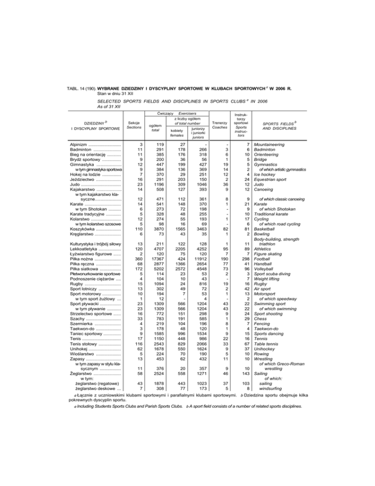 TABL. 14 (190). WYBRANE DZIEDZINY I DYSCYPLINY SPORTOWE W KLUBACH SPORTOWYCH a W 2006 R. Stan w dniu 31 XII SELECTED SPORTS FIELDS AND DISCIPLINES IN SPORTS CLUBS a IN 2006 As of 31 XII Ćwiczący b DZIEDZINY I DYSCYPLINY SPORTOWE Alpinizm .......................... Badminton ...................... Bieg na orientację ........... Brydż sportowy ............... Gimnastyka ................... w tym gimnastyka sportowa Hokej na lodzie ............... Jeździectwo .................... Judo ................................ Kajakarstwo ................... w tym kajakarstwo klasyczne.................... Karate ............................. w tym Shotokan .......... Karate tradycyjne ............ Kolarstwo ........................ w tym kolarstwo szosowe Koszykówka .................... Kręglarstwo ..................... Kulturystyka i trójbój siłowy Lekkoatletyka .................. Łyżwiarstwo figurowe ...... Piłka nożna ..................... Piłka ręczna .................... Piłka siatkowa ................. Płetwonurkowanie sportowe Podnoszenie ciężarów .... Rugby ............................. Sport lotniczy .................. Sport motorowy ............... w tym sport żużlowy ... Sport pływacki ................. w tym pływanie ........... Strzelectwo sportowe ...... Szachy ............................ Szermierka ..................... Taekwon-do .................... Taniec sportowy .............. Tenis ............................... Tenis stołowy .................. Unihokej .......................... Wioślarstwo .................... Zapasy ............................ w tym zapasy w stylu klasycznym ................. Żeglarstwo ...................... w tym: żeglarstwo (regatowe) żeglarstwo deskowe ... Sekcje Sections ogółem total Exercisers z liczby ogółem of total number kobiety females juniorzy i juniorki juniors Trenerzy Coaches Instruktorzy sportowi Sports instructors b SPORTS FIELDS AND DISCIPLINES 3 11 11 9 12 9 7 16 23 14 119 291 385 200 447 384 370 291 1196 508 27 178 176 36 199 136 29 203 309 127 266 318 56 427 369 251 150 1046 393 3 6 1 19 14 12 2 36 9 7 6 10 5 5 2 4 24 12 12 Mountaineering Badminton Orienteering Bridge Gymnastics of which artistic gymnastics Ice hockey Equestrian sport Judo Canoeing 12 14 6 5 12 5 110 6 471 541 273 328 274 98 3870 73 112 148 72 48 55 16 1565 43 361 370 198 255 193 69 3463 35 8 1 1 82 1 9 21 9 10 17 6 81 2 13 120 2 360 68 172 5 4 15 13 10 1 23 23 16 33 4 3 9 17 116 62 5 13 211 4707 120 17367 2877 5202 114 104 1094 302 194 12 1309 1309 772 783 219 178 1585 1150 2543 1678 224 453 122 2205 75 424 1366 2572 23 10 24 49 7 566 566 151 191 104 48 996 448 829 550 70 62 128 4252 120 11912 2654 4548 53 43 816 72 53 4 1204 1204 298 585 196 120 1534 986 2066 1624 190 432 1 95 7 190 77 73 2 19 2 1 43 43 9 1 8 1 9 22 33 9 5 11 11 89 7 298 41 96 3 7 16 42 13 2 22 22 24 29 7 4 15 16 67 37 10 10 11 58 376 2524 20 558 357 1271 9 46 10 143 43 7 1878 308 443 77 1023 173 37 5 103 8 of which classic canoeing Karate of which Shotokan Traditional karate Cycling of which road cycling Basketball Bowling Body-building, strength triathlon Athletics Figure skating Football Handball Volleyball Sport scuba diving Weight lifting Rugby Air sport Motorsport of which speedway Swimming sport of which swimming Sport shooting Chess Fencing Taekwon-do Sports dancing Tennis Table tennis Unihockey Rowing Wrestling of which Greco-Roman wrestling Sailing of which: sailing windsurfing a Łącznie z uczniowskimi klubami sportowymi i parafialnymi klubami sportowymi. b Dziedzina sportu obejmuje kilka pokrewnych dyscyplin sportu. a Including Students Sports Clubs and Parish Sports Clubs. b A sport field consists of a number of related sports disciplines.